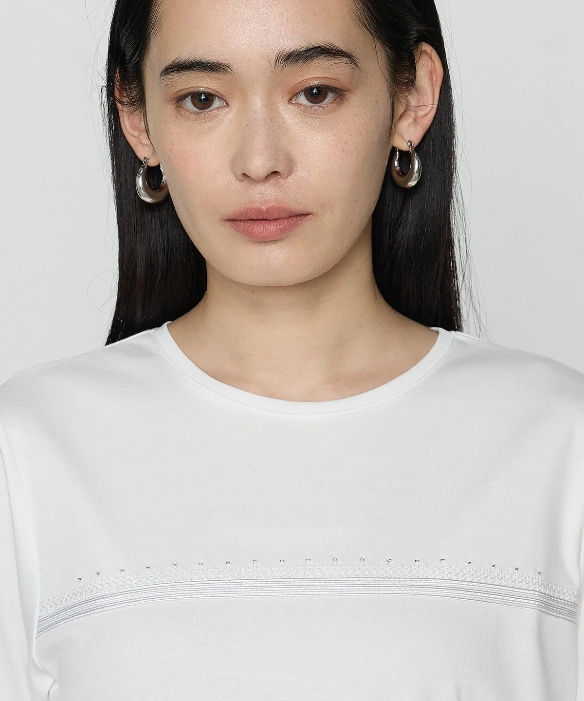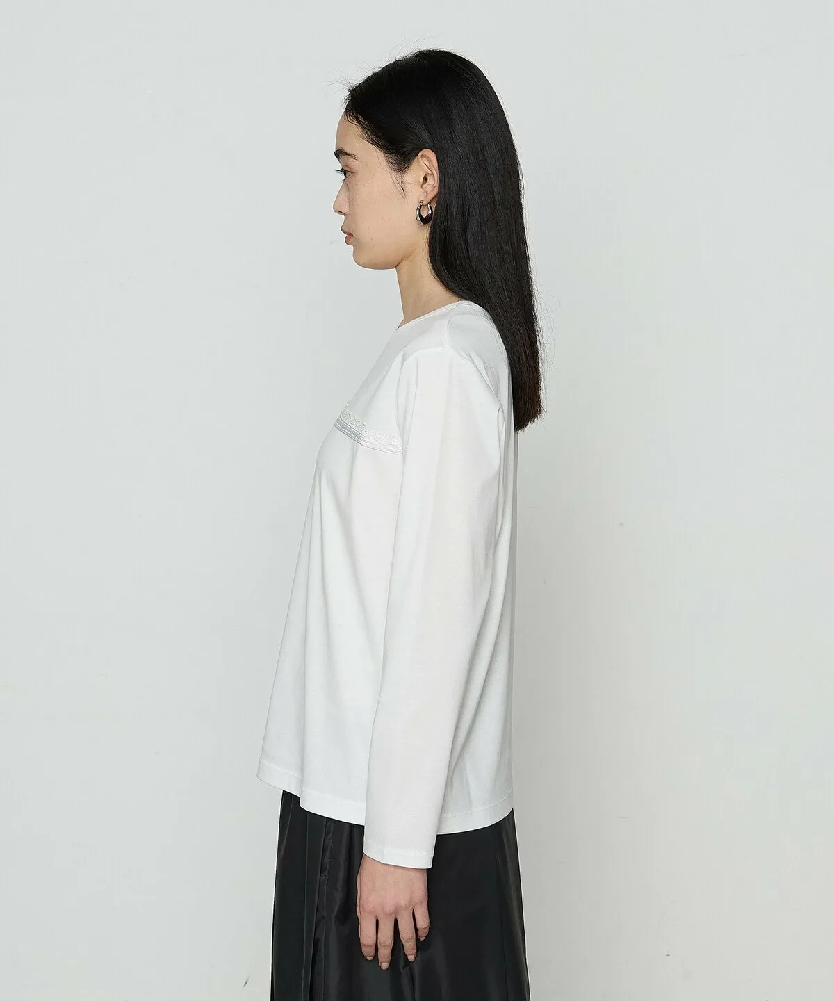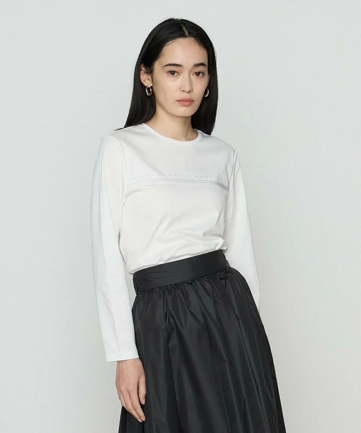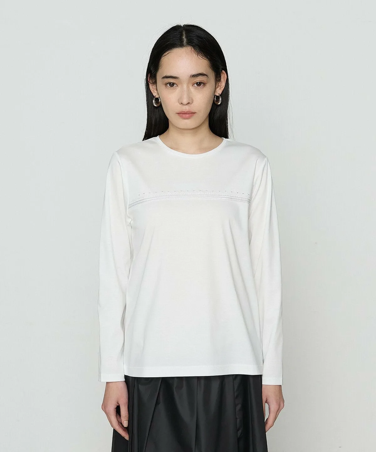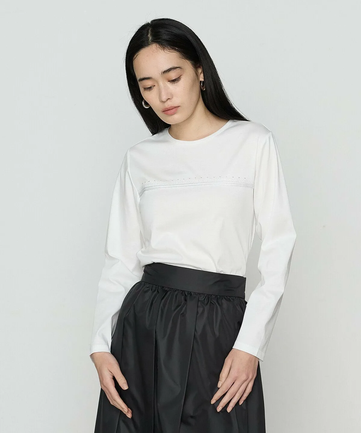 Этот пуловер с длинными рукавами и круглым вырезом украшен тесьмой и ручной вышивкой бисером на груди.