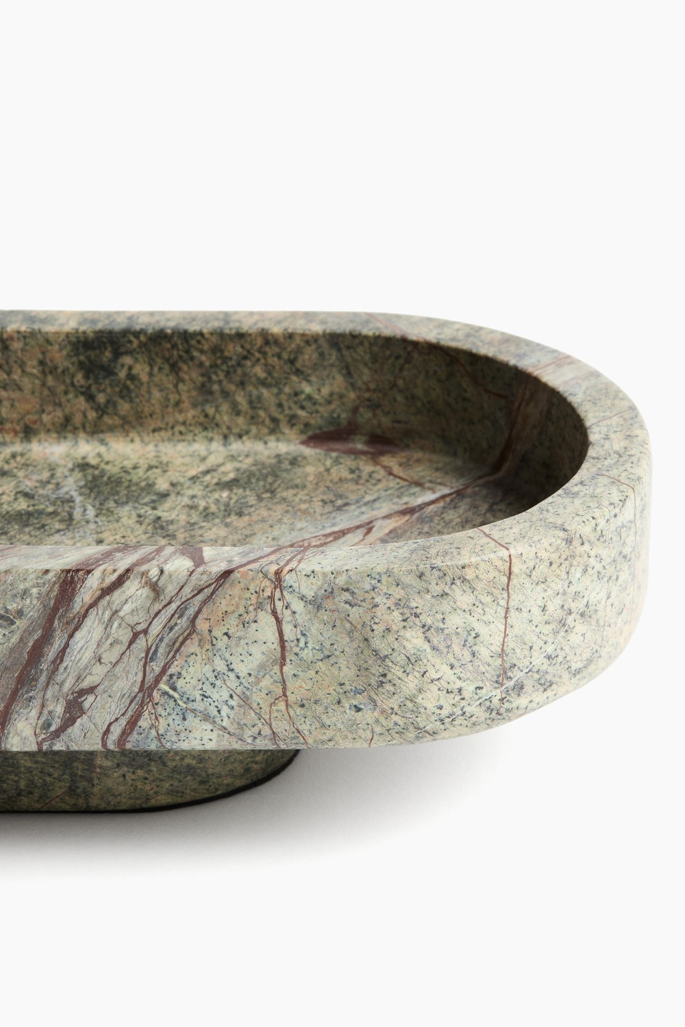 Овальное мраморное блюдо на подставке, создающей элегантный силуэт. Мрамор — натуральный материал, поэтому отдельные экземпляры могут отличаться по цвету.