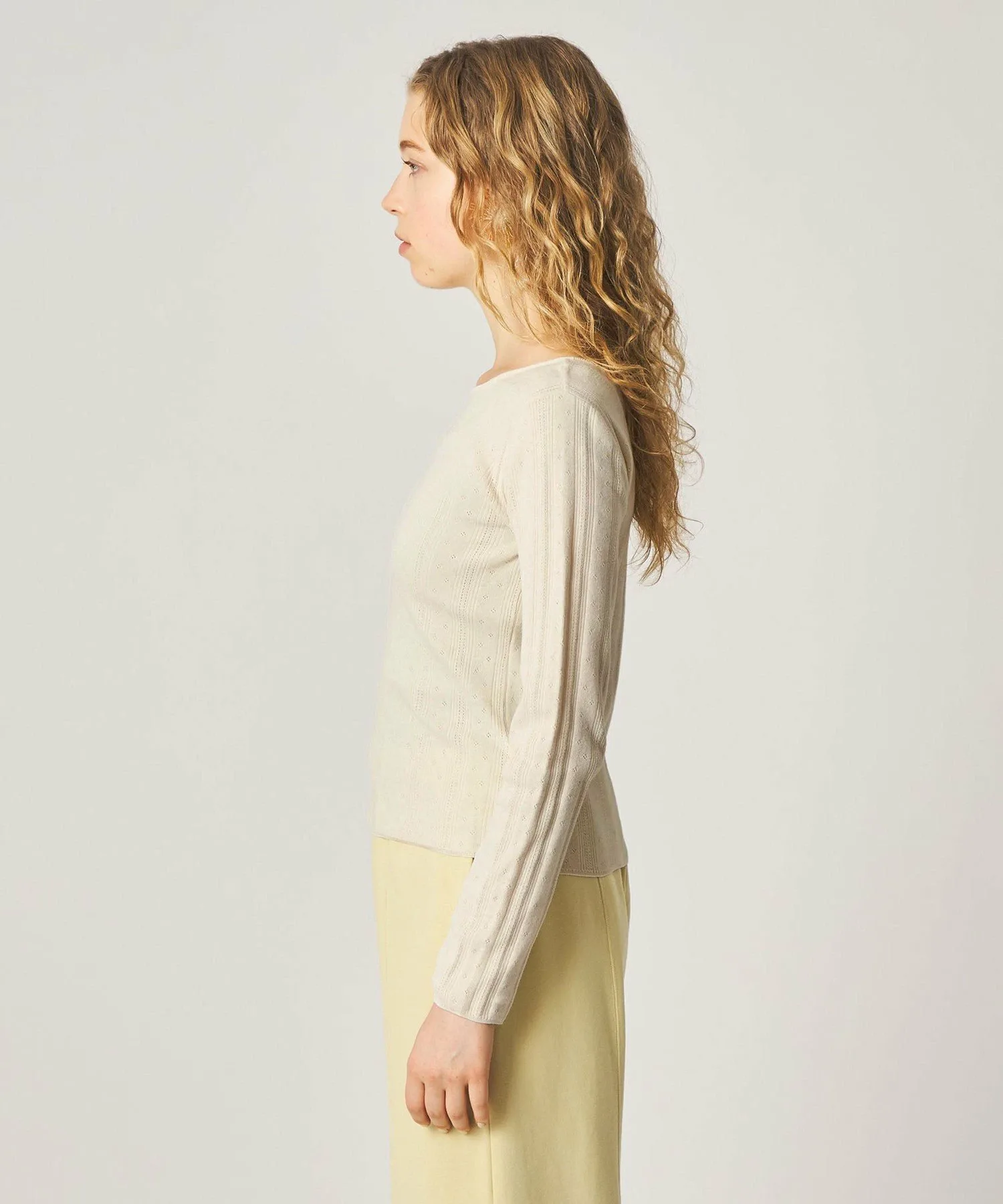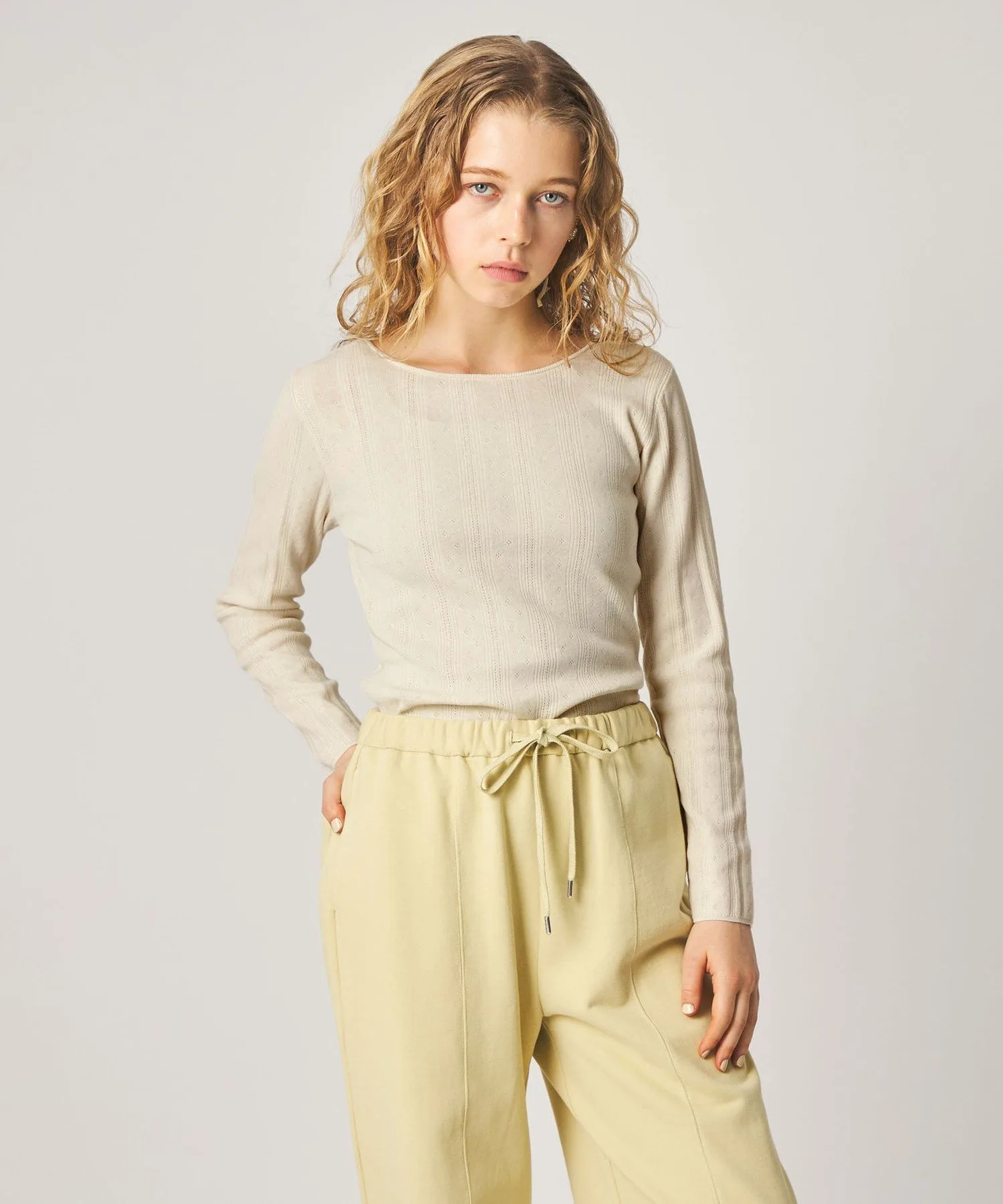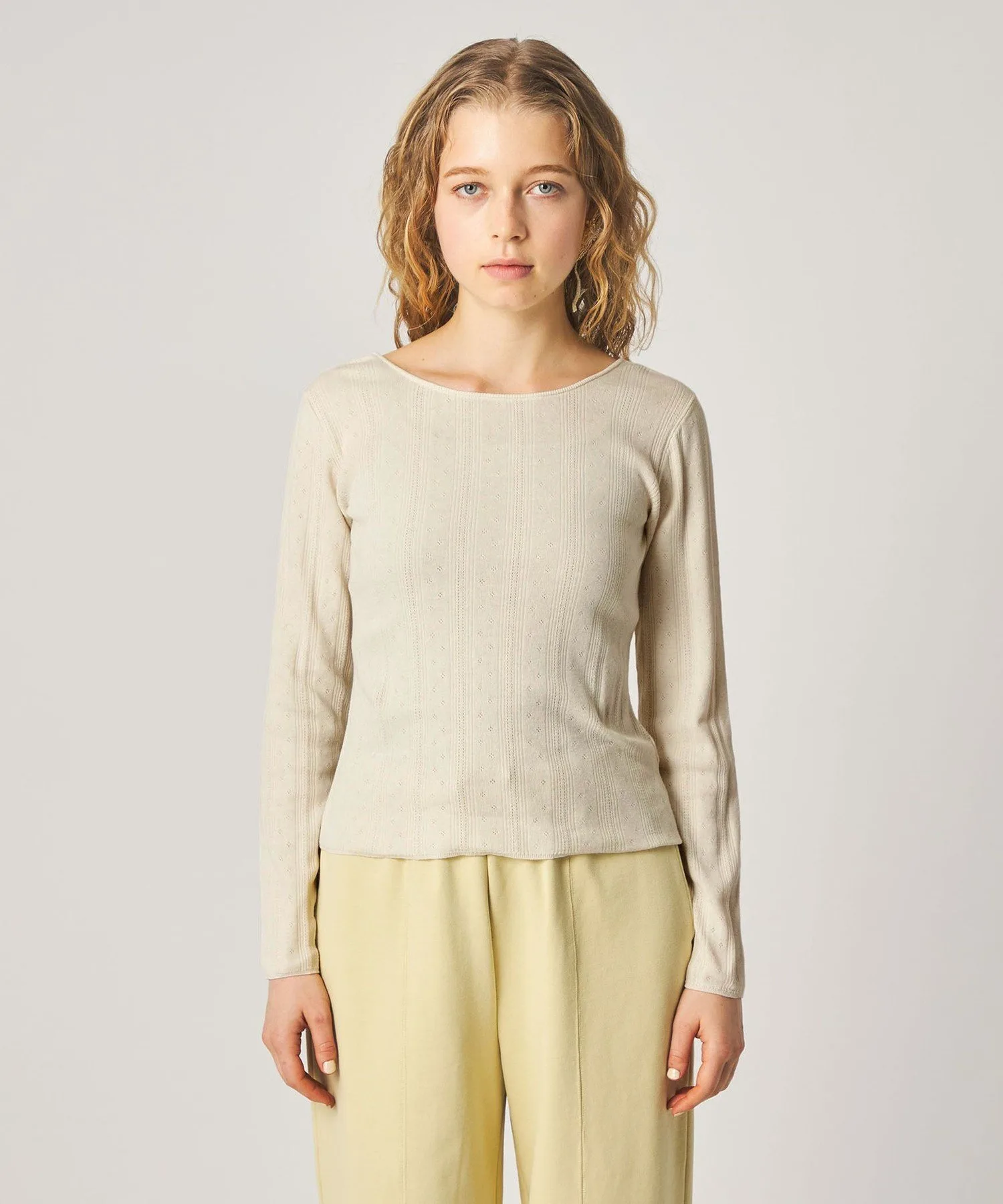 Этот пуловер с длинными рукавами имеет широкий открытый вырез спереди и сзади, создавая чистый и элегантный образ. Изготовленный из гладкой хлопково-полиэстерной пряжи, полностью вязаный дизайн украшен перфорацией для создания легкой текстуры. Приталенный силуэт плотно облегает тело, что делает его идеальным как самостоятельным элементом гардероба, так и в качестве нижнего слоя под куртку или блузон. Он легко сочетается с любыми брюками и юбками, что делает его универсальным для повседневной носки и создания изысканных образов. Бренд Steven Alan был основан в Нью-Йорке в 1994 году. Основываясь на переосмыслении традиционного американского стиля и аутентичной американской повседневной одежде, бренд предлагает простые, удобные вещи и модели. [Примечания] Пожалуйста, обязательно ознакомьтесь с инструкциями по уходу и стирке перед использованием. Изображения товаров могут отличаться от реального цвета в зависимости от освещения и настроек вашего компьютера. Спасибо за понимание. *Пожалуйста, ориентируйтесь на изображение самого товара для определения цвета. При обращении в магазин, пожалуйста, сообщите название/номер товара в любом магазине Steven Alan по всей стране. Название товара: SATCEYELETPO Номер товара: 82131000013 Рост: 173 см Обхват груди: 80 см Обхват талии: 62 см Обхват бедер: 89 см Размер одежды: Свободный