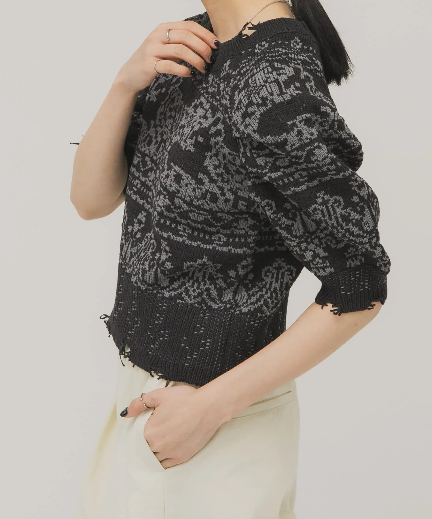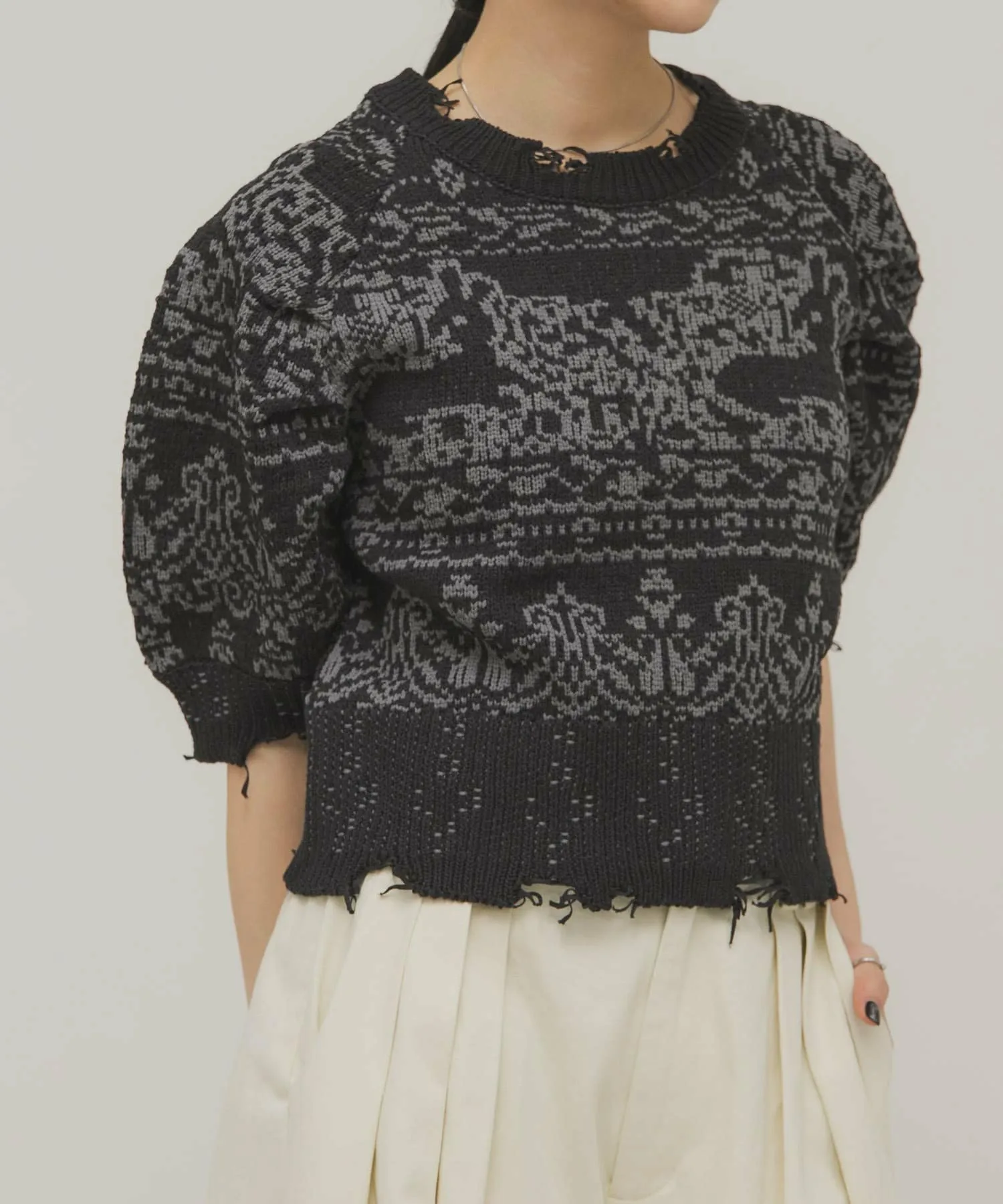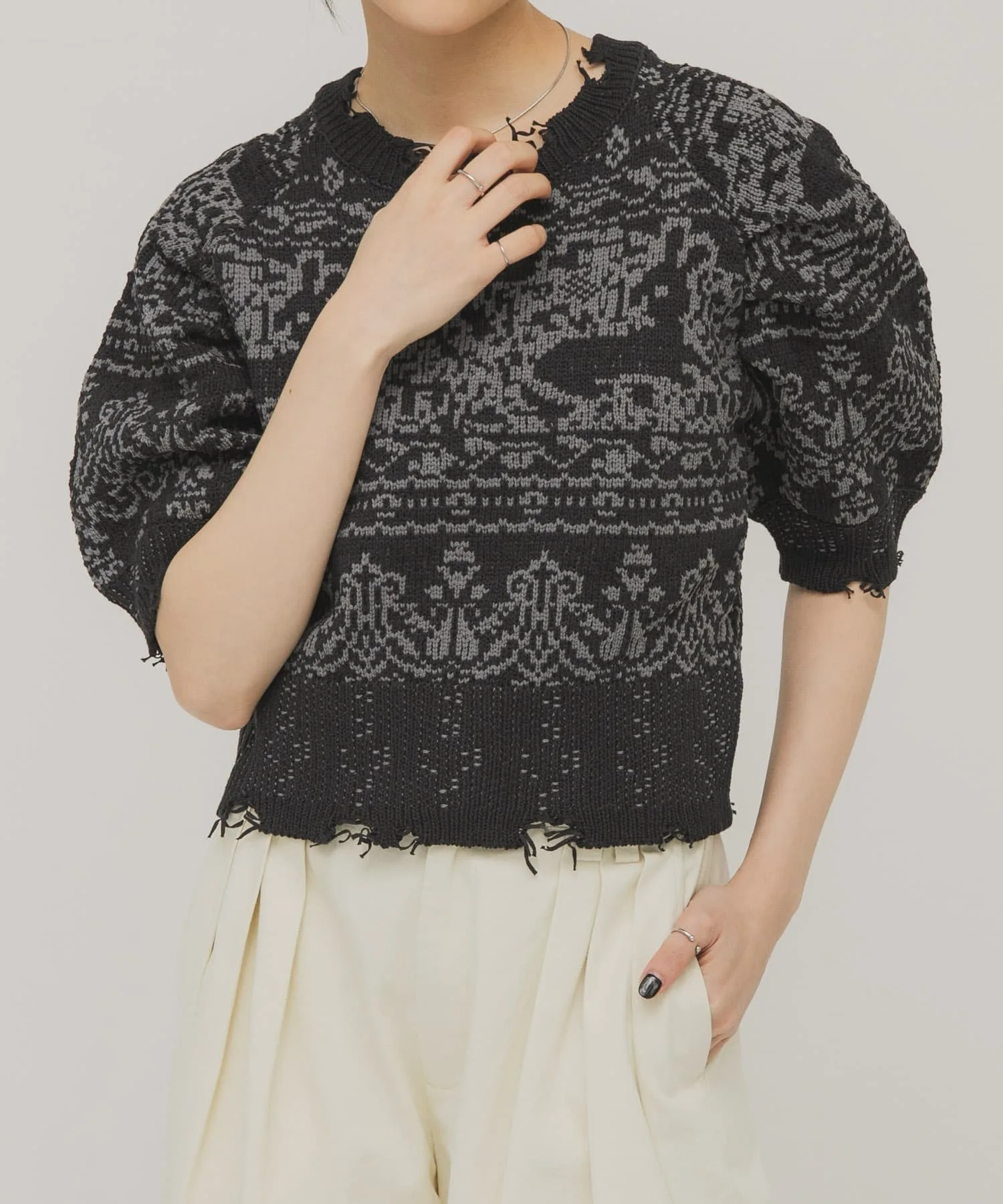 Это трикотажное изделие с короткими рукавами имеет объемные, закругленные рукава и яркий жаккардовый узор. При ближайшем рассмотрении можно заметить едва заметный рисунок кролика вокруг груди. Потертые детали на подоле и манжетах придают изделию сдержанный и элегантный вид. Жаккардовая трикотажная юбка (KB26130-2055010) также доступна из того же материала.