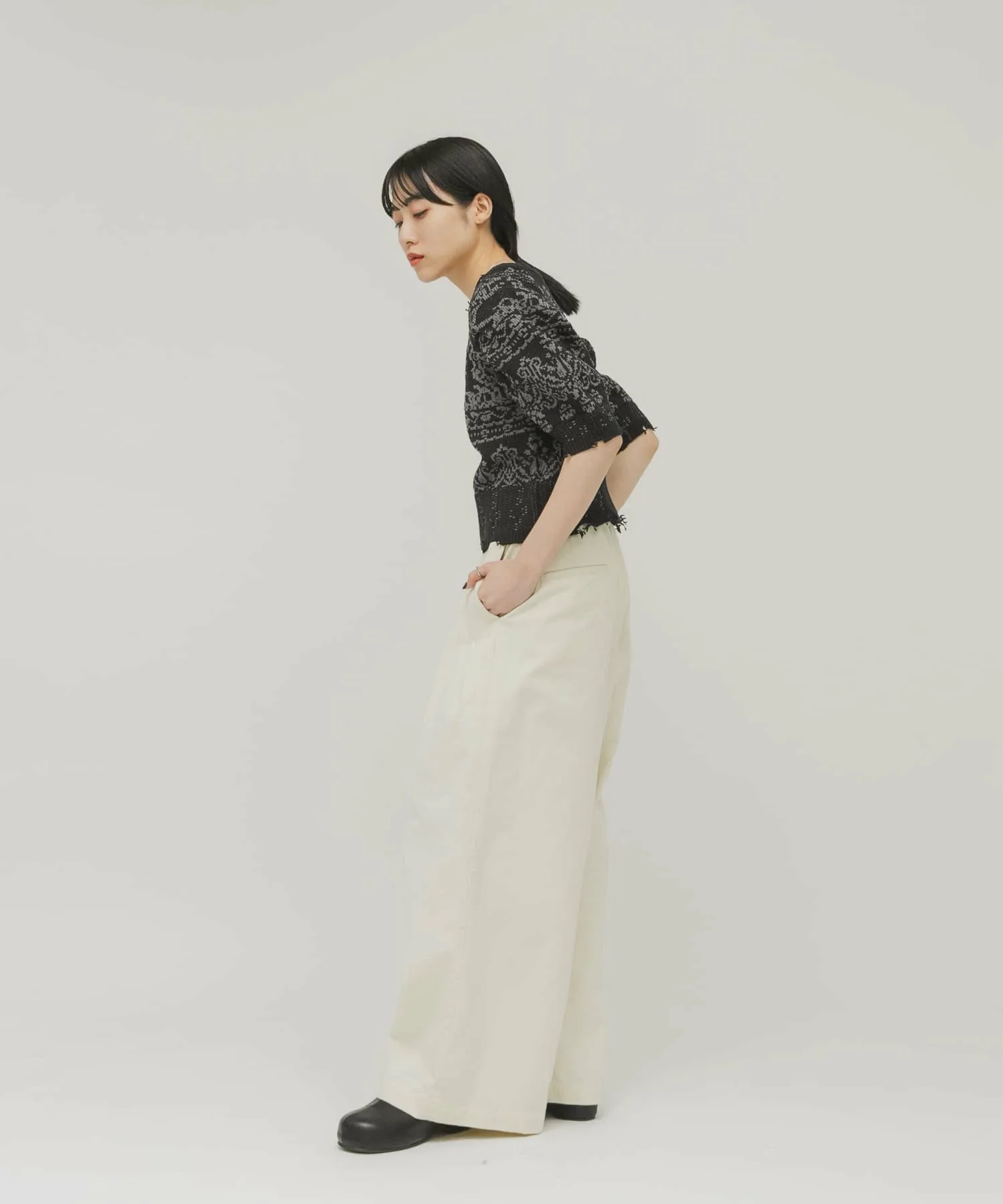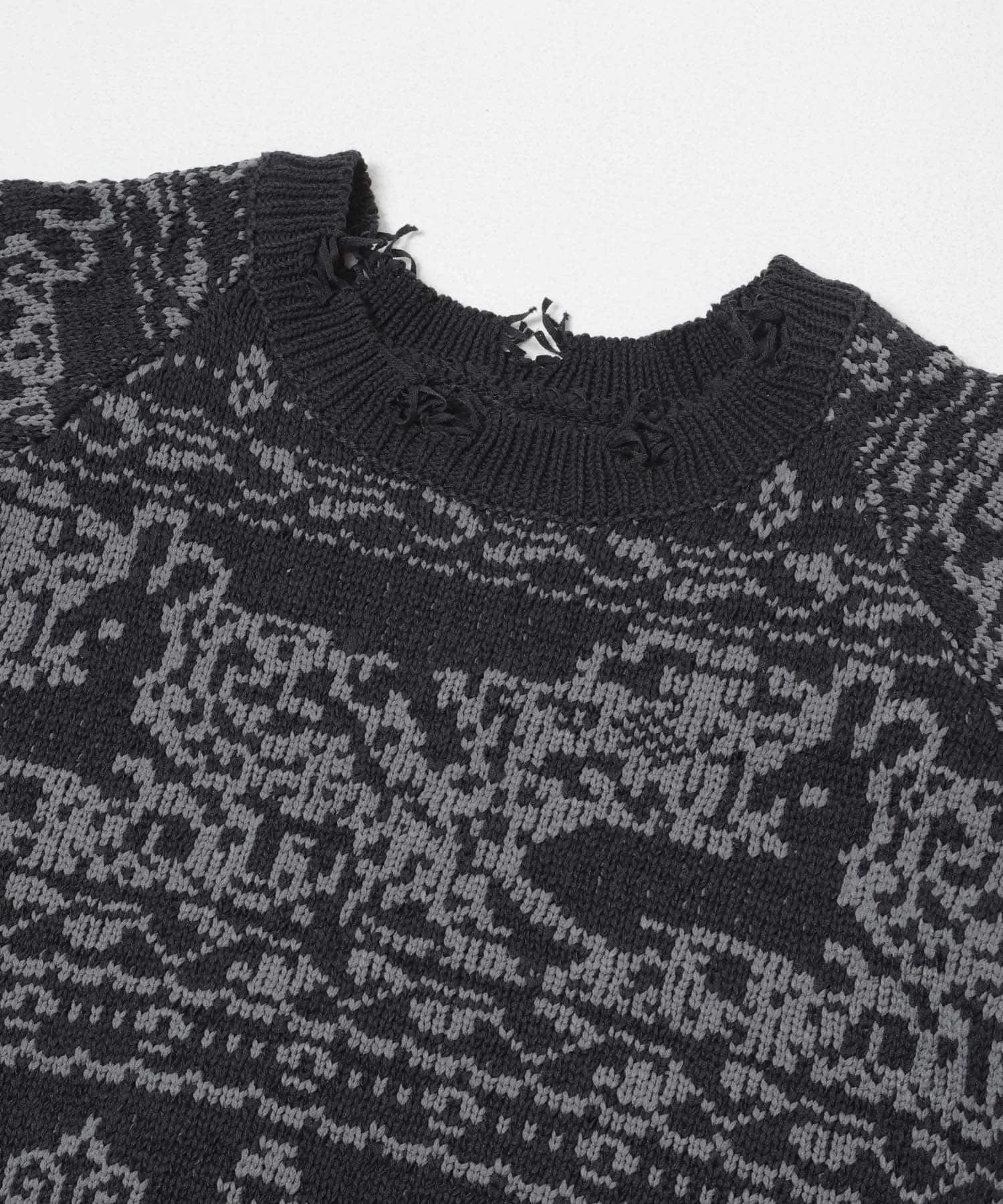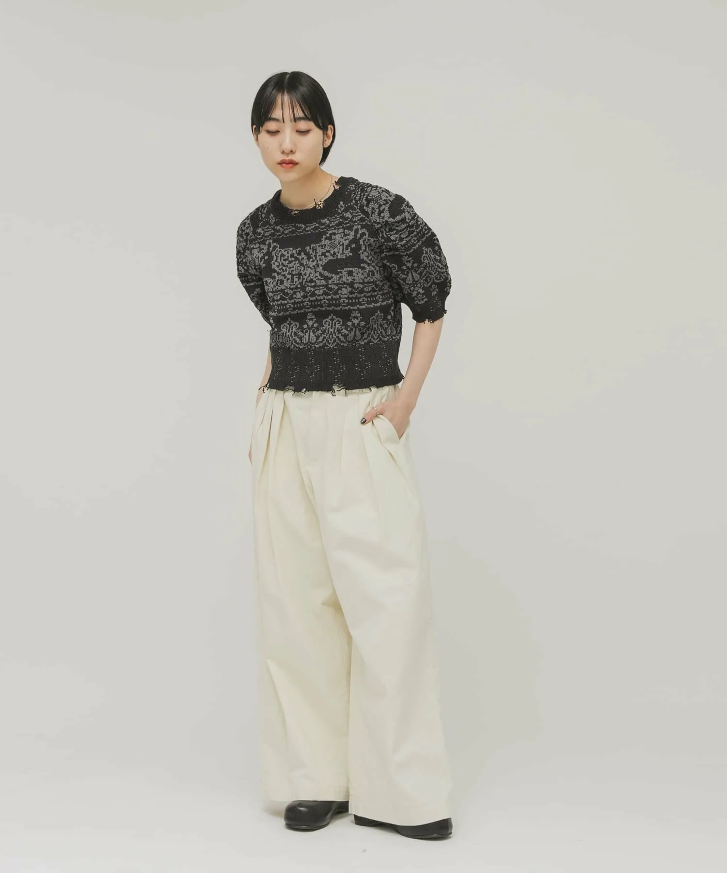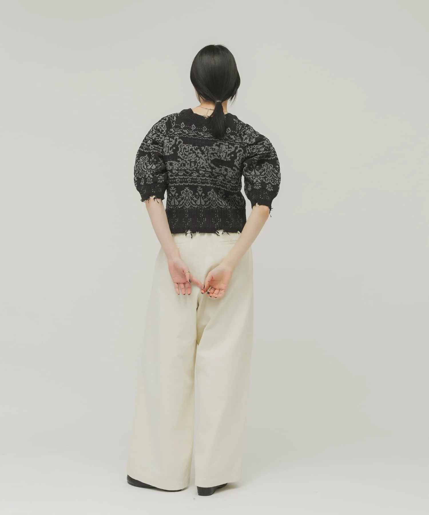 Это трикотажное изделие с короткими рукавами имеет объемные, закругленные рукава и яркий жаккардовый узор. При ближайшем рассмотрении можно заметить едва заметный рисунок кролика вокруг груди. Потертые детали на подоле и манжетах придают изделию сдержанный и элегантный вид. Жаккардовая трикотажная юбка (KB26130-2055010) также доступна из того же материала.