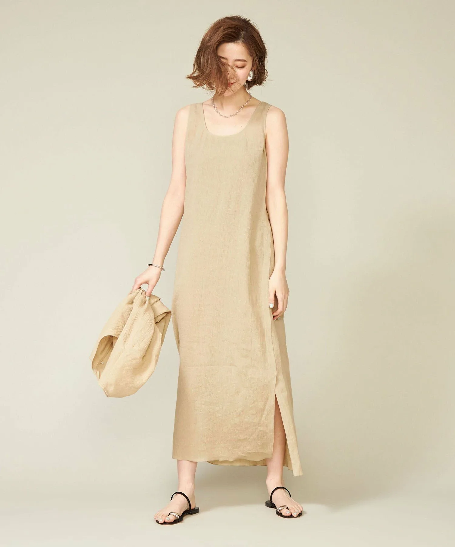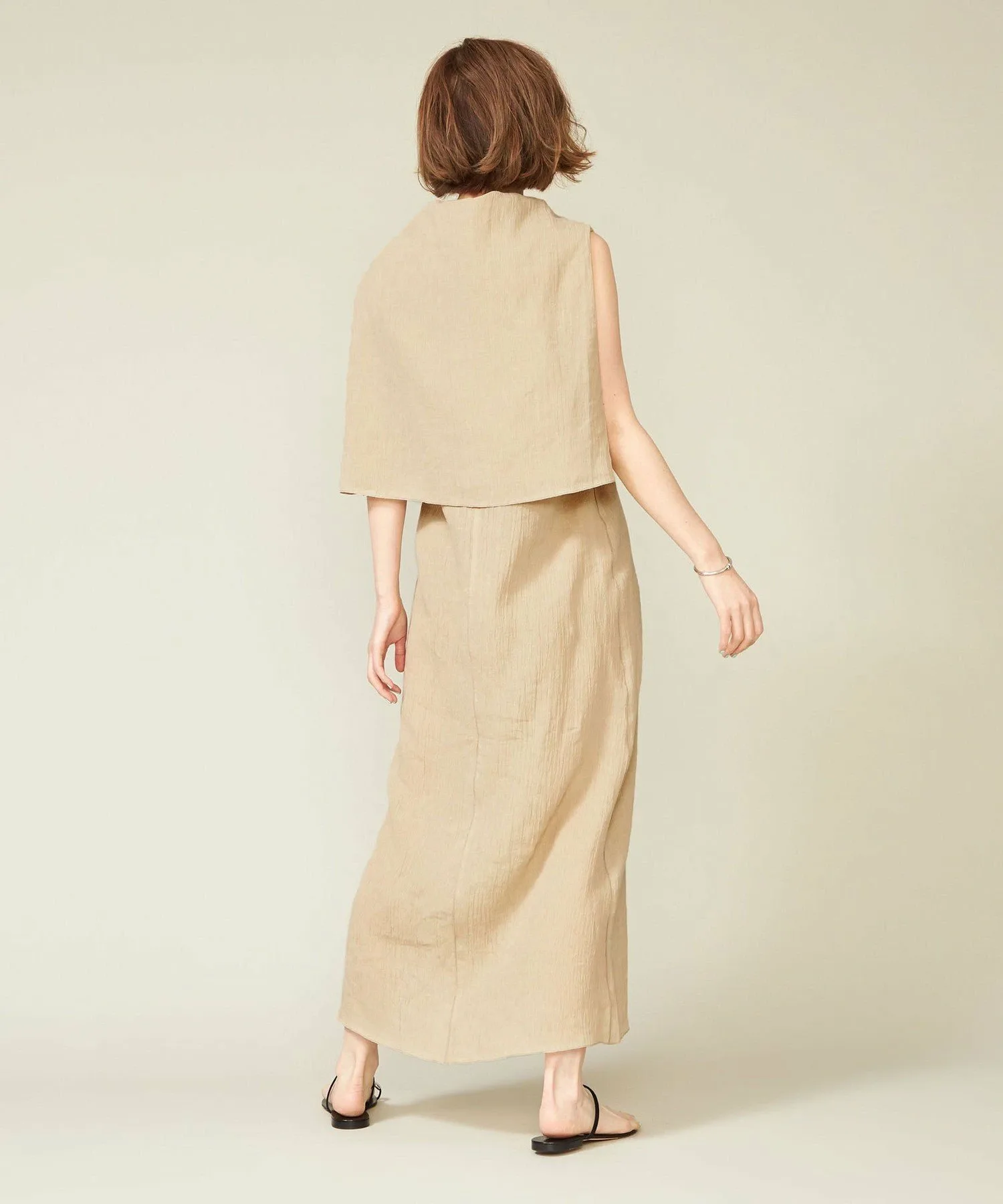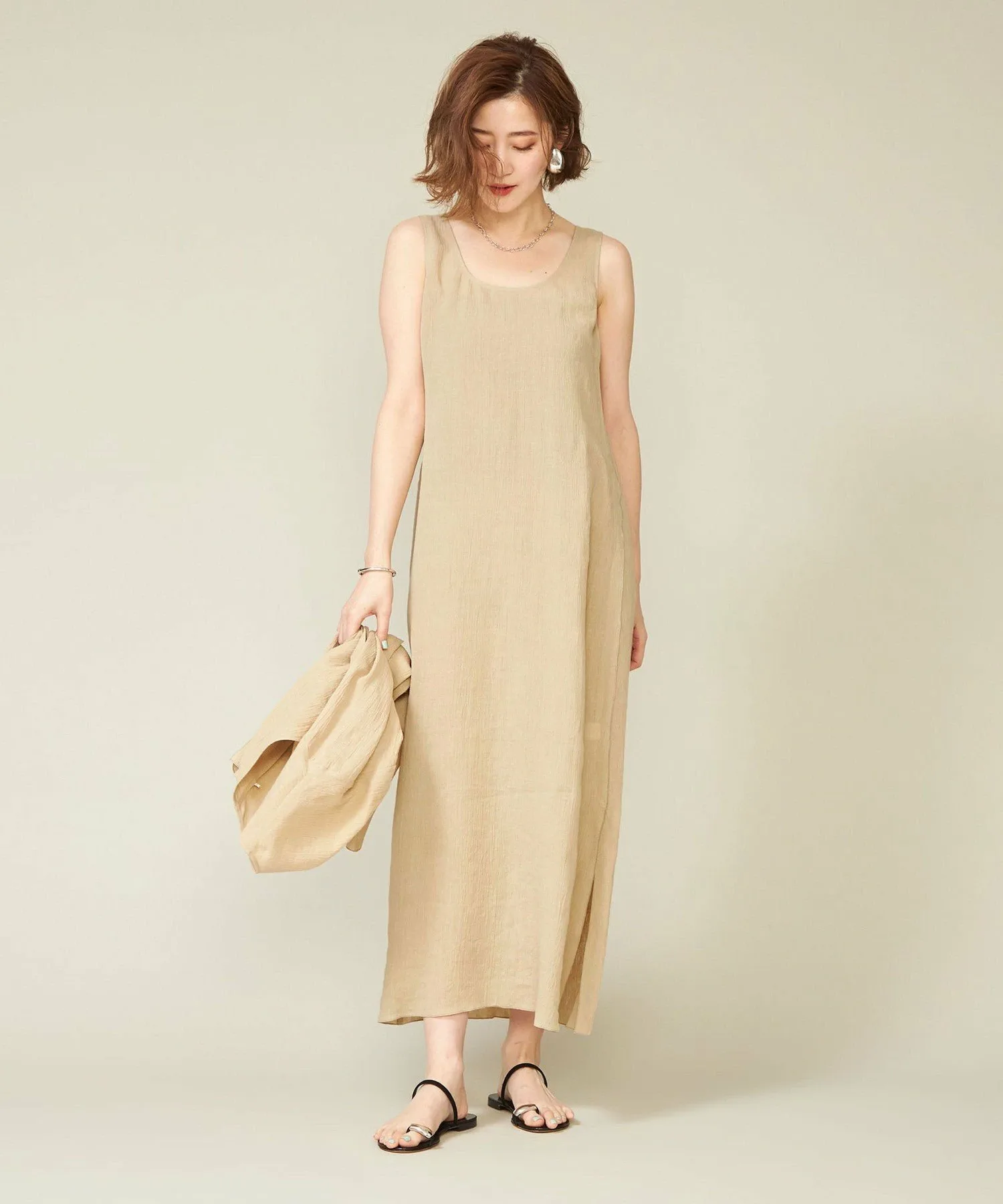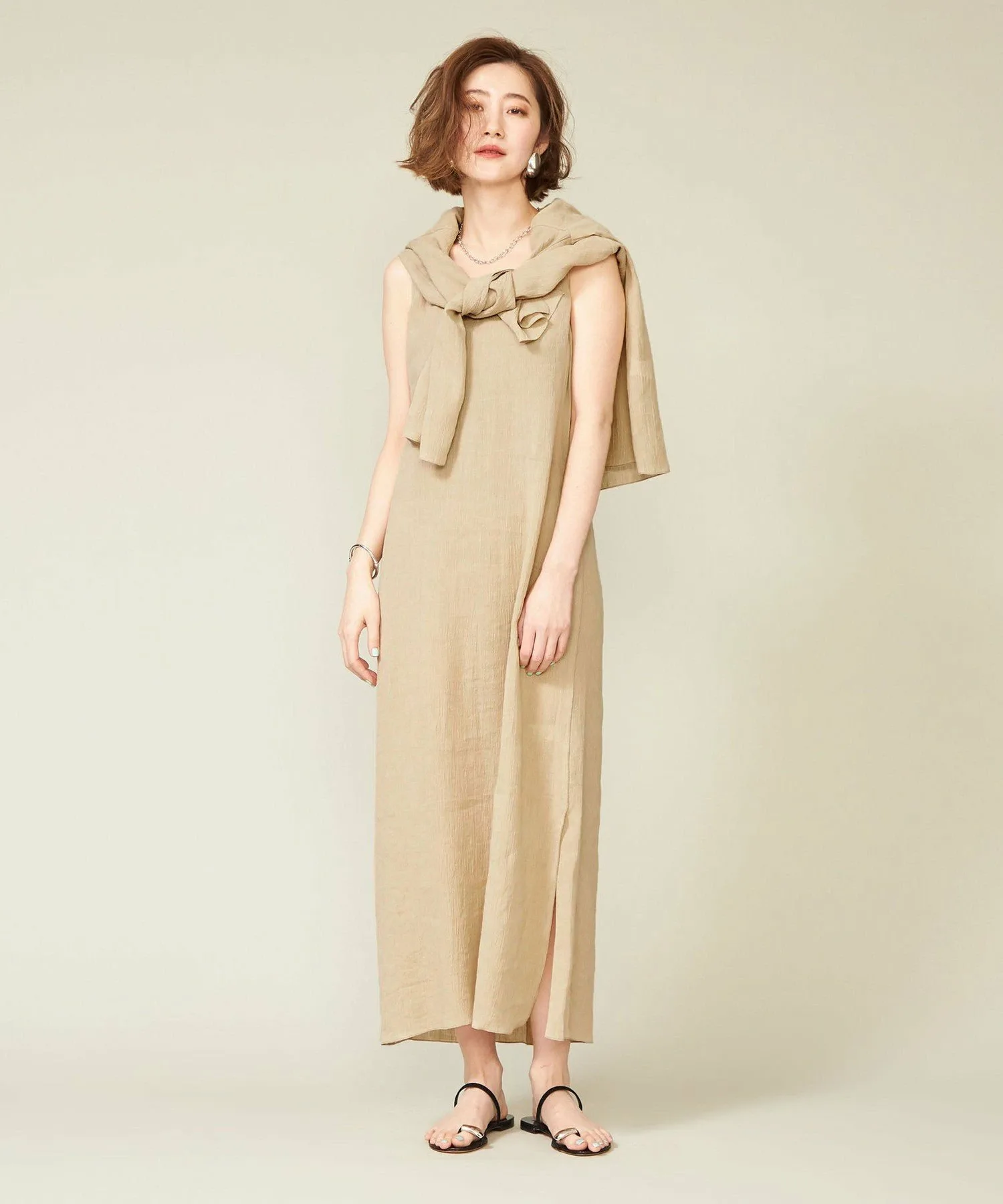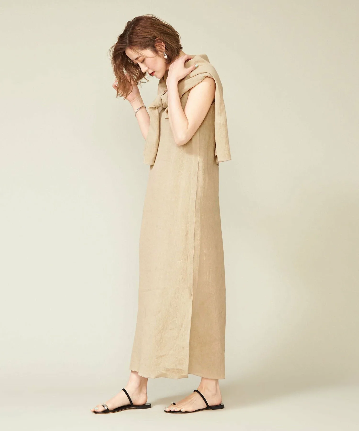 Платье без рукавов, создающее ощущение прохлады благодаря текстуре льняного материала.