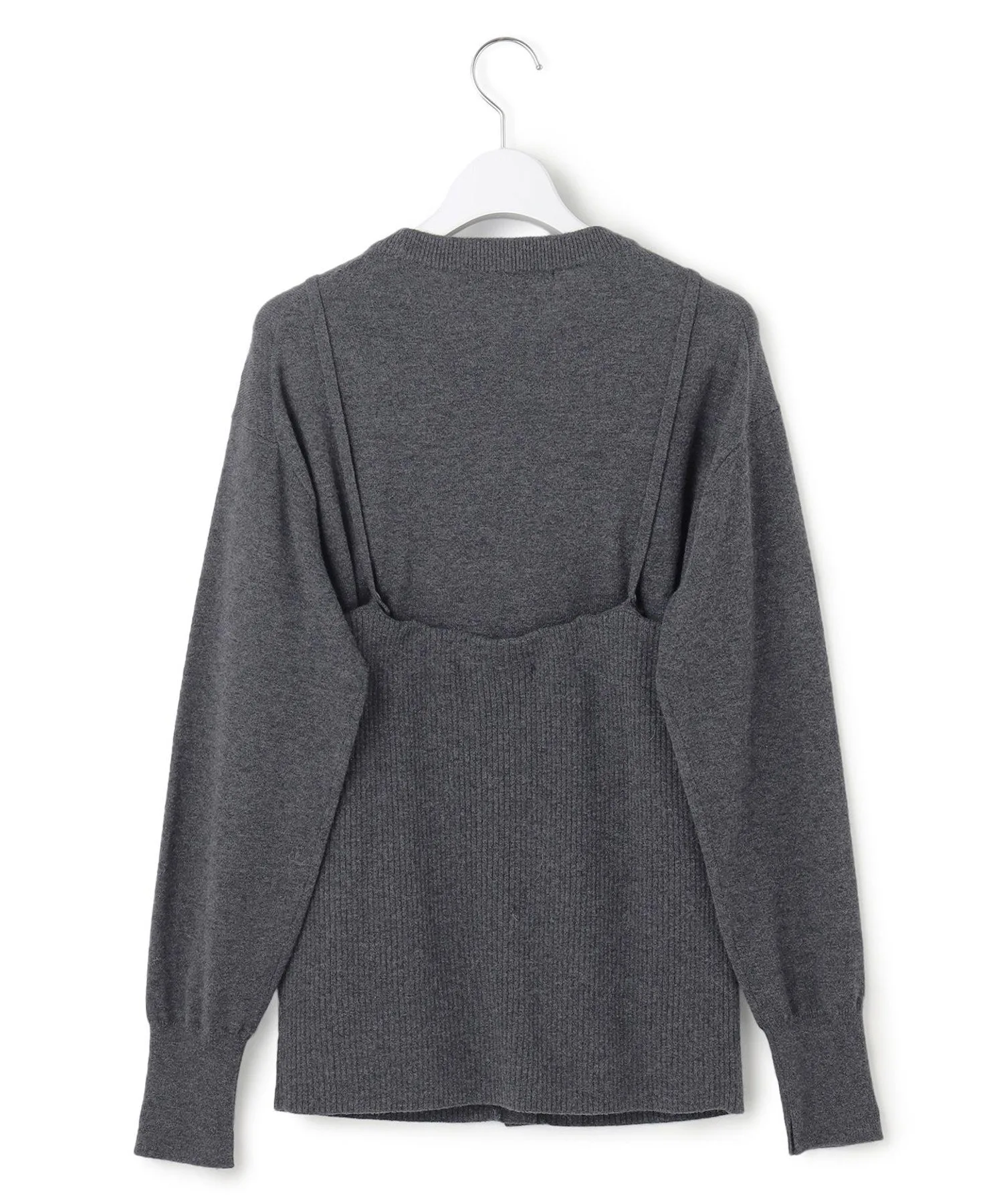 Этот комплект включает в себя трикотажный пуловер с круглым вырезом и ребристый трикотажный бюстье. Оба предмета можно носить отдельно или в сочетании с другими вещами. Изнаночная сторона воротника пуловера с круглым вырезом выполнена из другой камвольной пряжи, чтобы уменьшить зуд в области воротника. Плечевые лямки трикотажного бюстье регулируются и снимаются. Доступен в двух основных, легко сочетающихся цветах: сером (#004) и черном (#005).