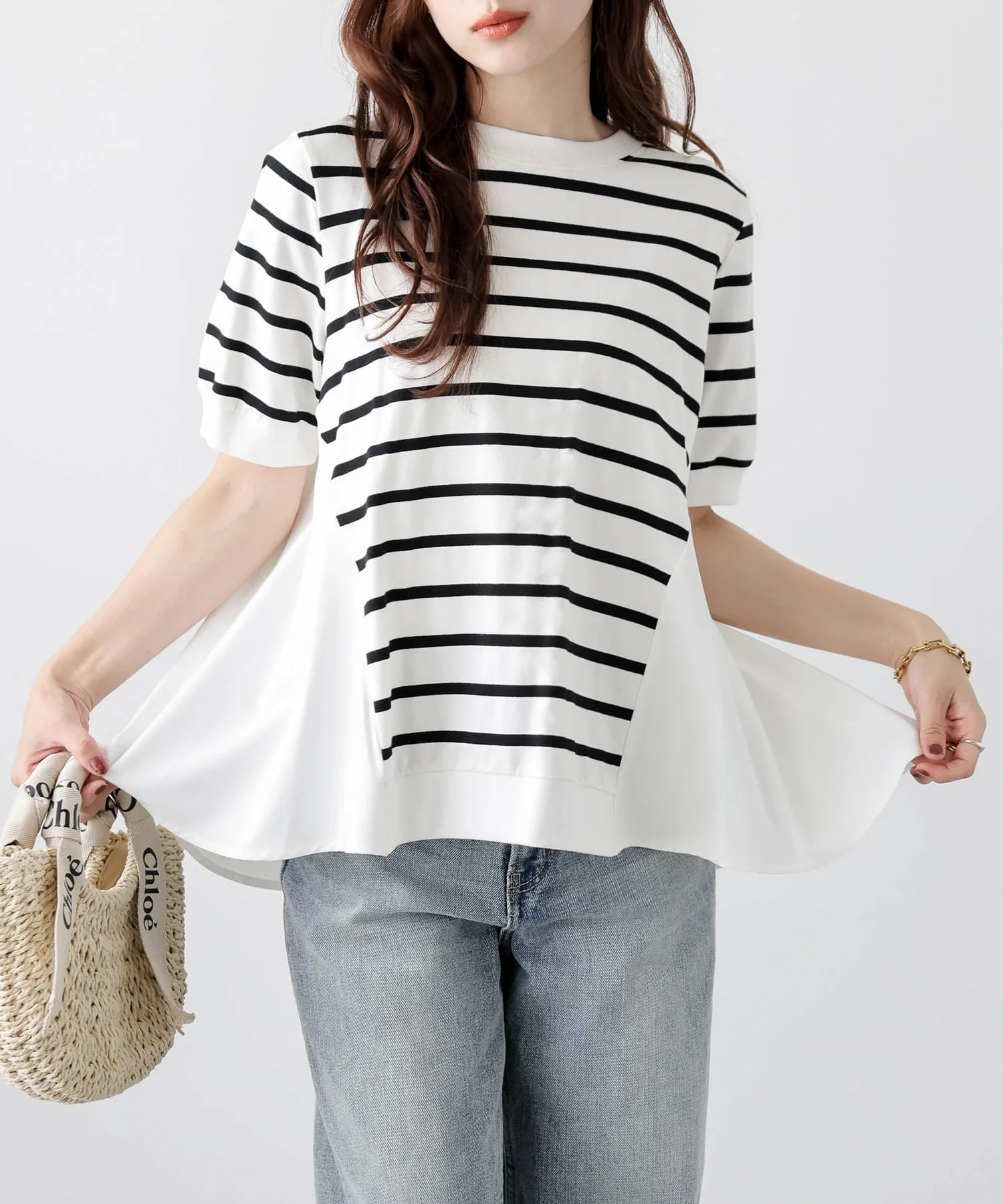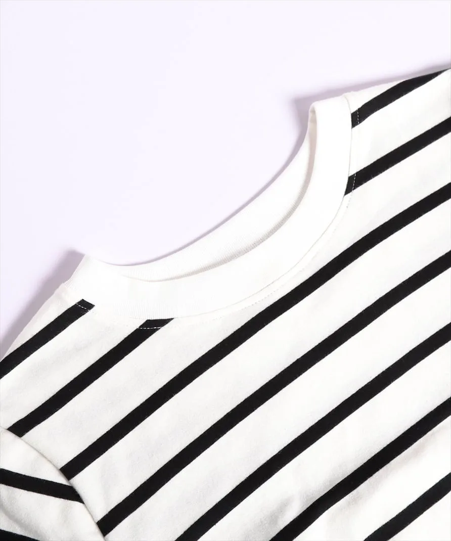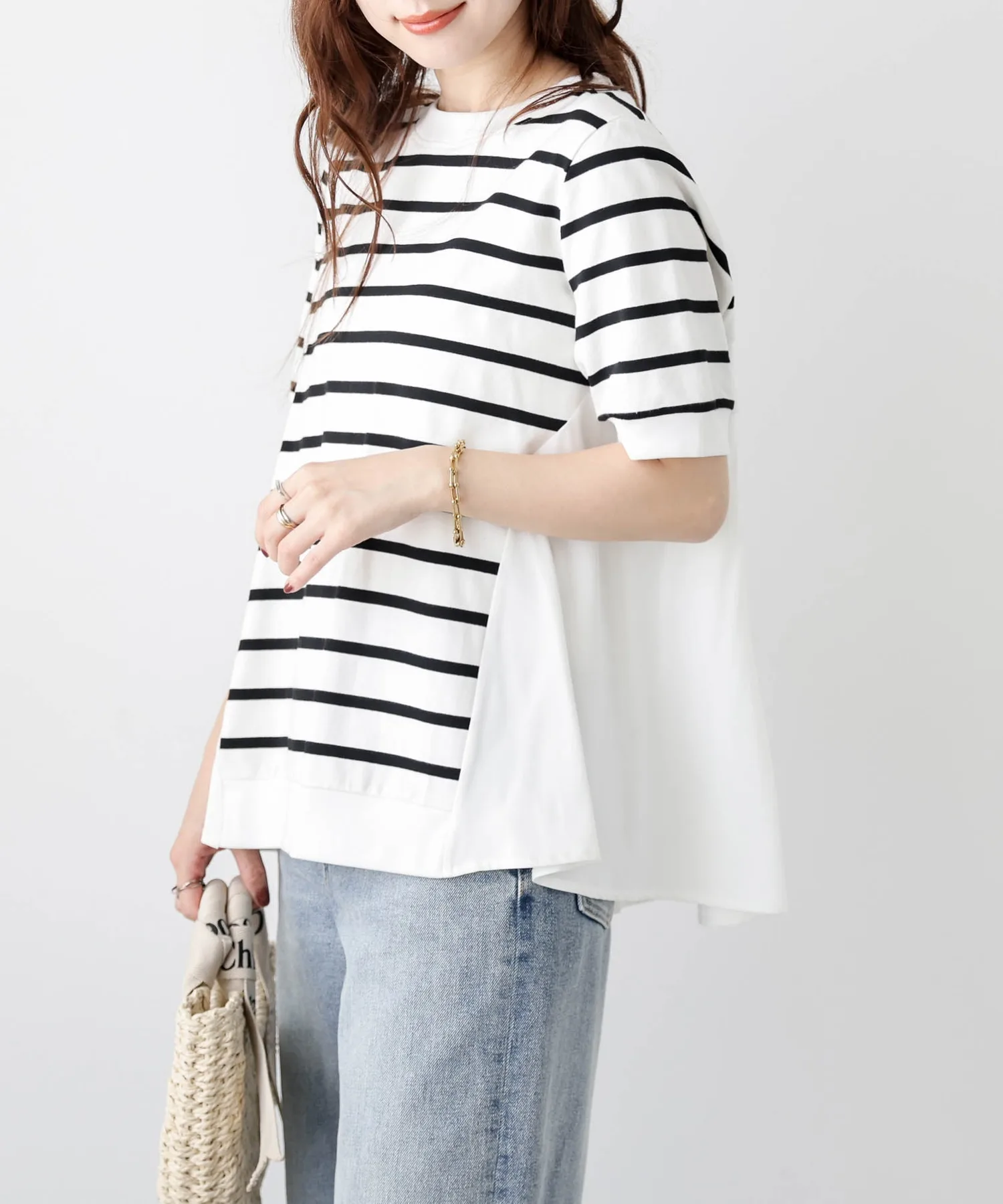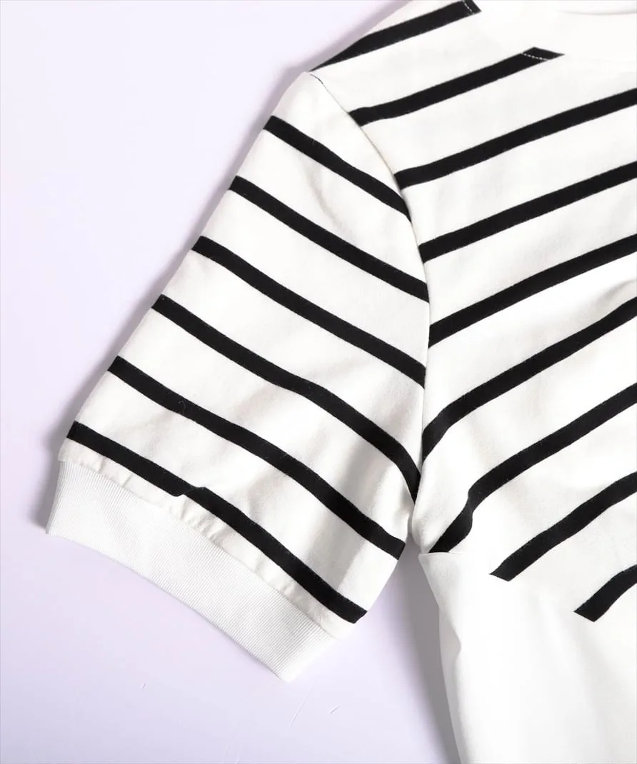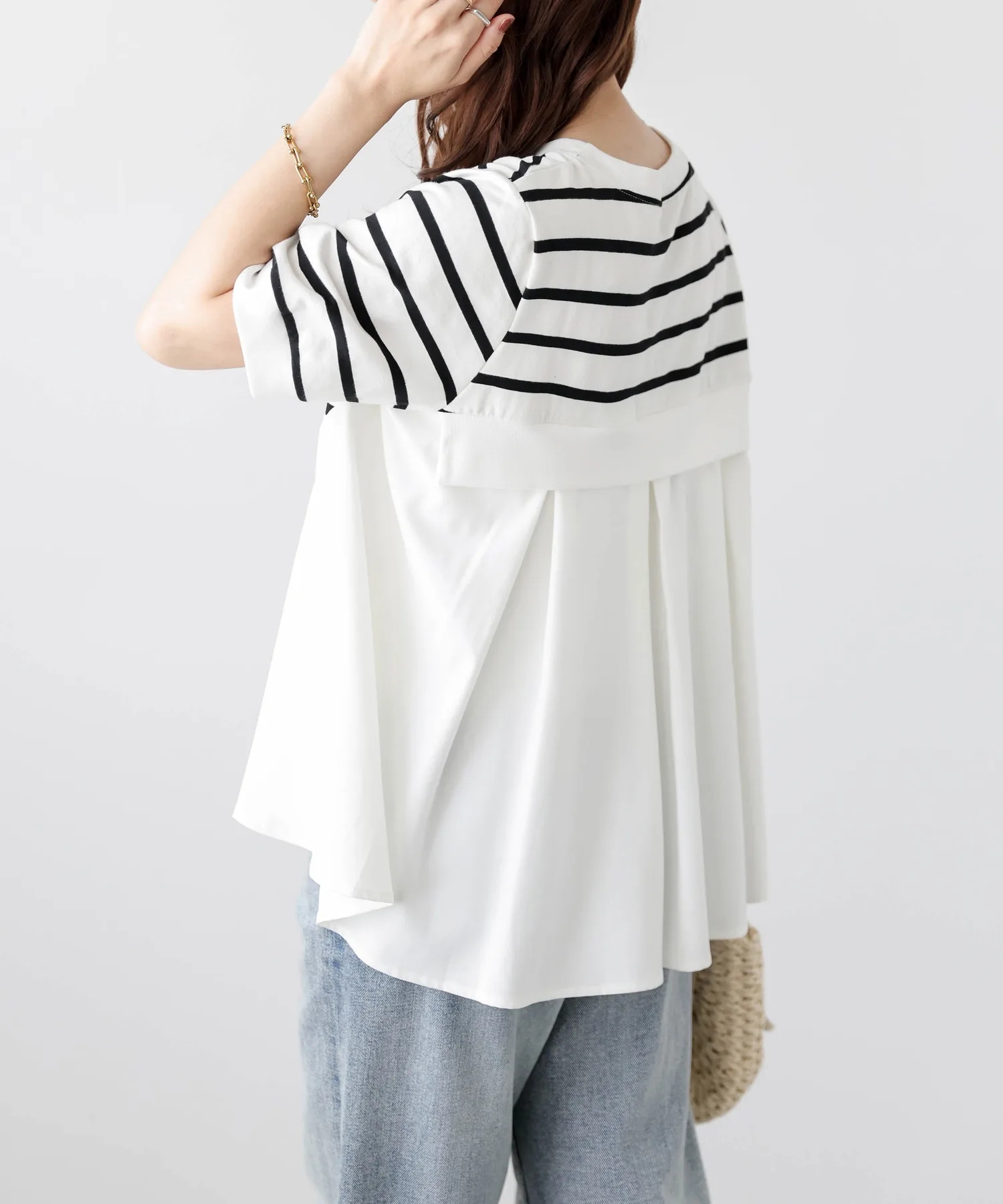 Этот топ выполнен из полосатой ткани, создающей непринужденный взрослый образ, в сочетании с расклешенной спинкой, добавляющей нотку женственной элегантности. Сочетайте его с простыми брюками, например, прямыми брюками, для создания идеально милого образа сзади. ◎