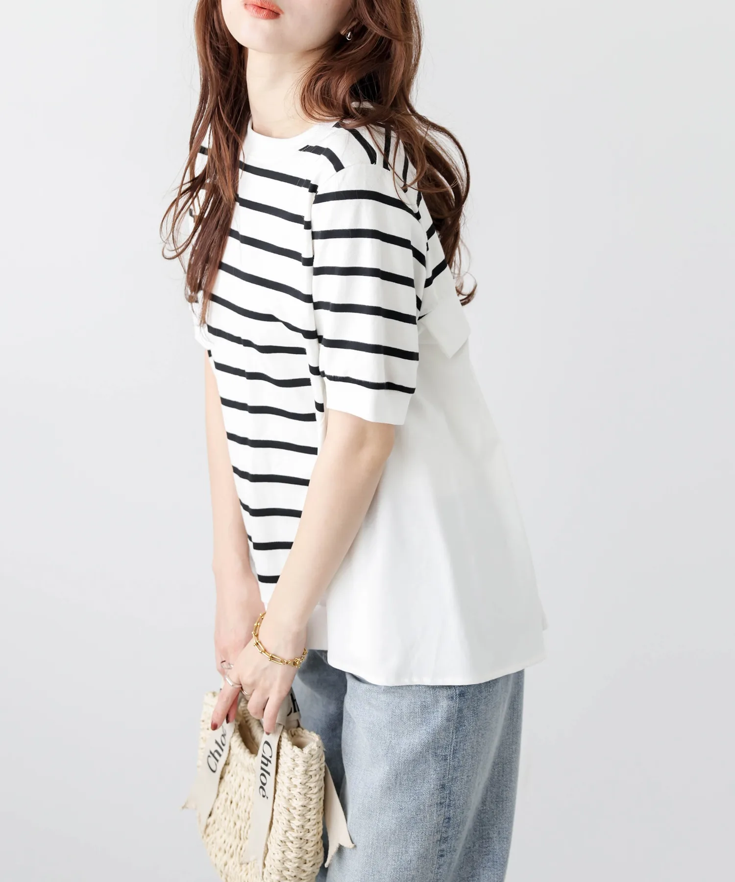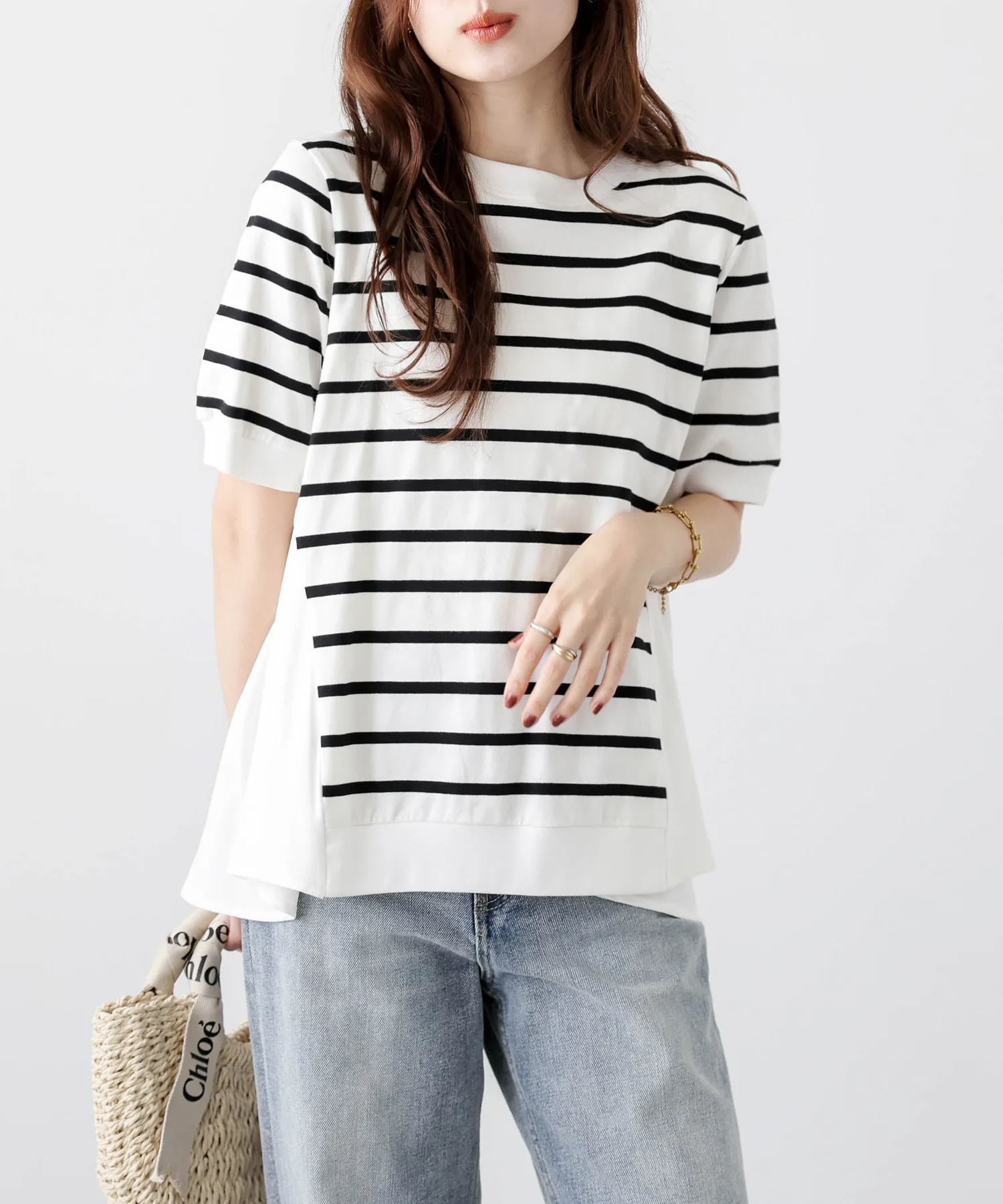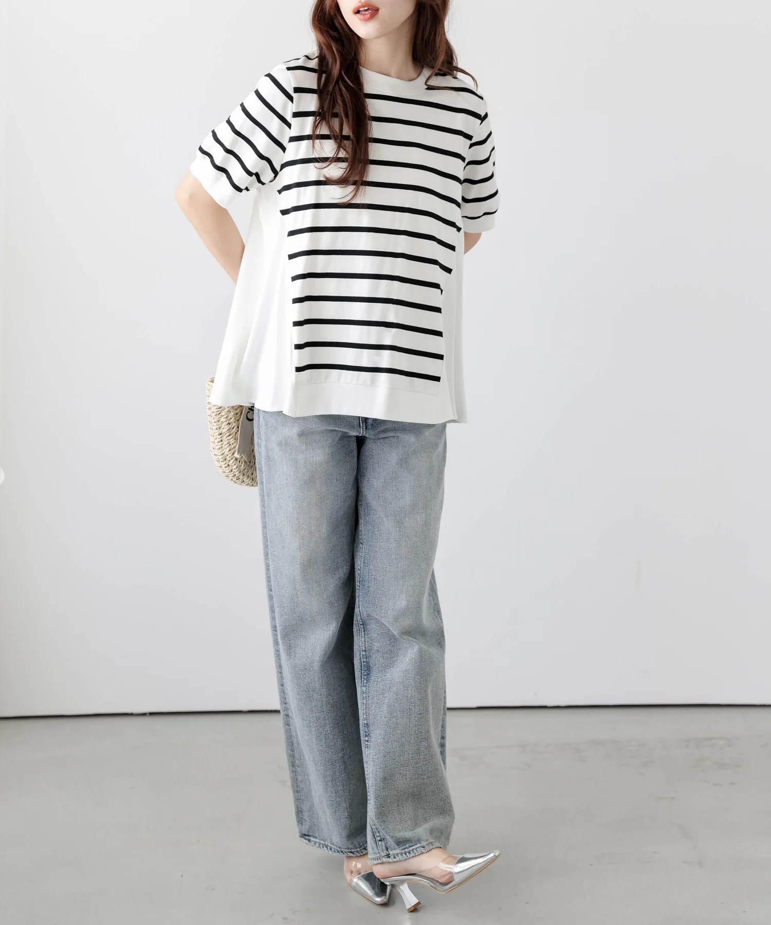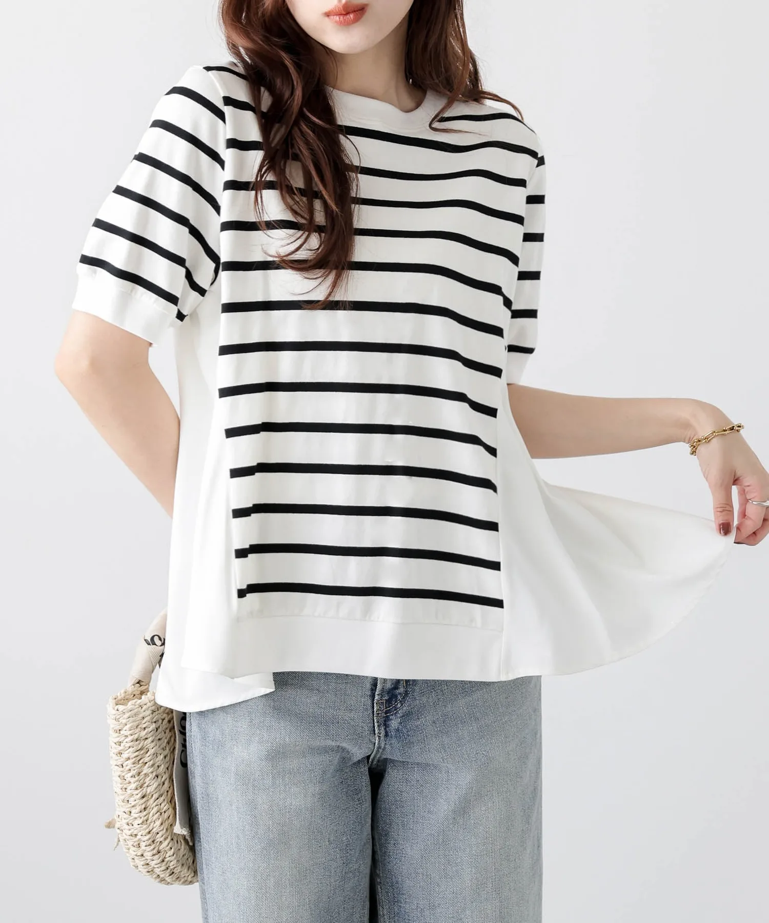 Этот топ выполнен из полосатой ткани, создающей непринужденный взрослый образ, в сочетании с расклешенной спинкой, добавляющей нотку женственной элегантности. Сочетайте его с простыми брюками, например, прямыми брюками, для создания идеально милого образа сзади. ◎