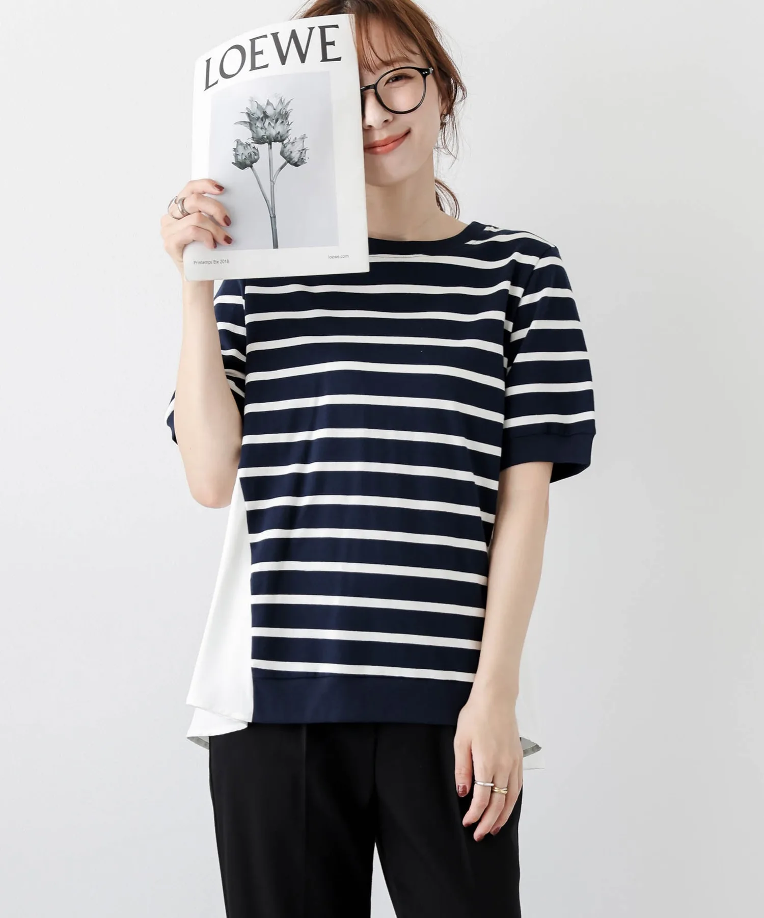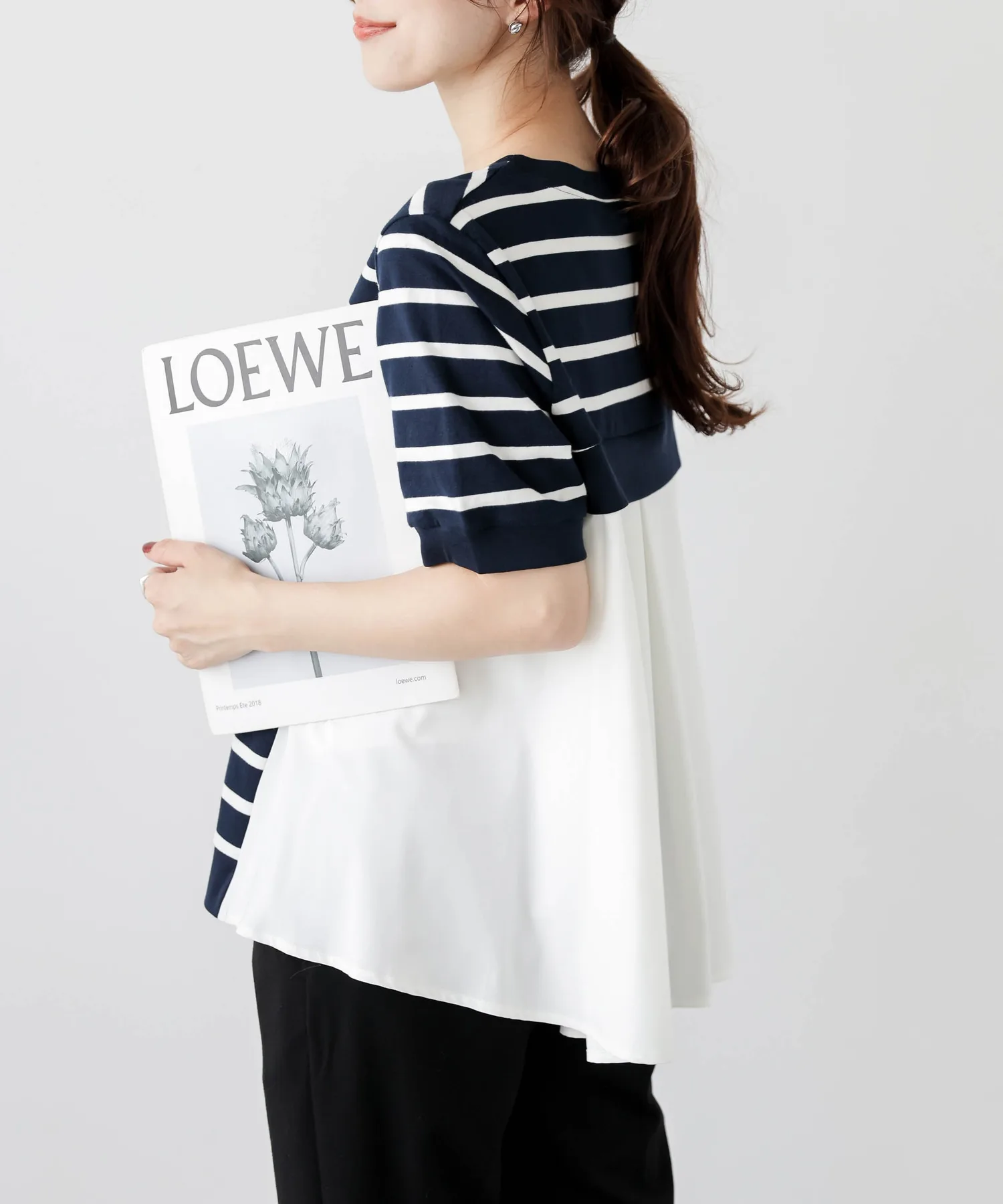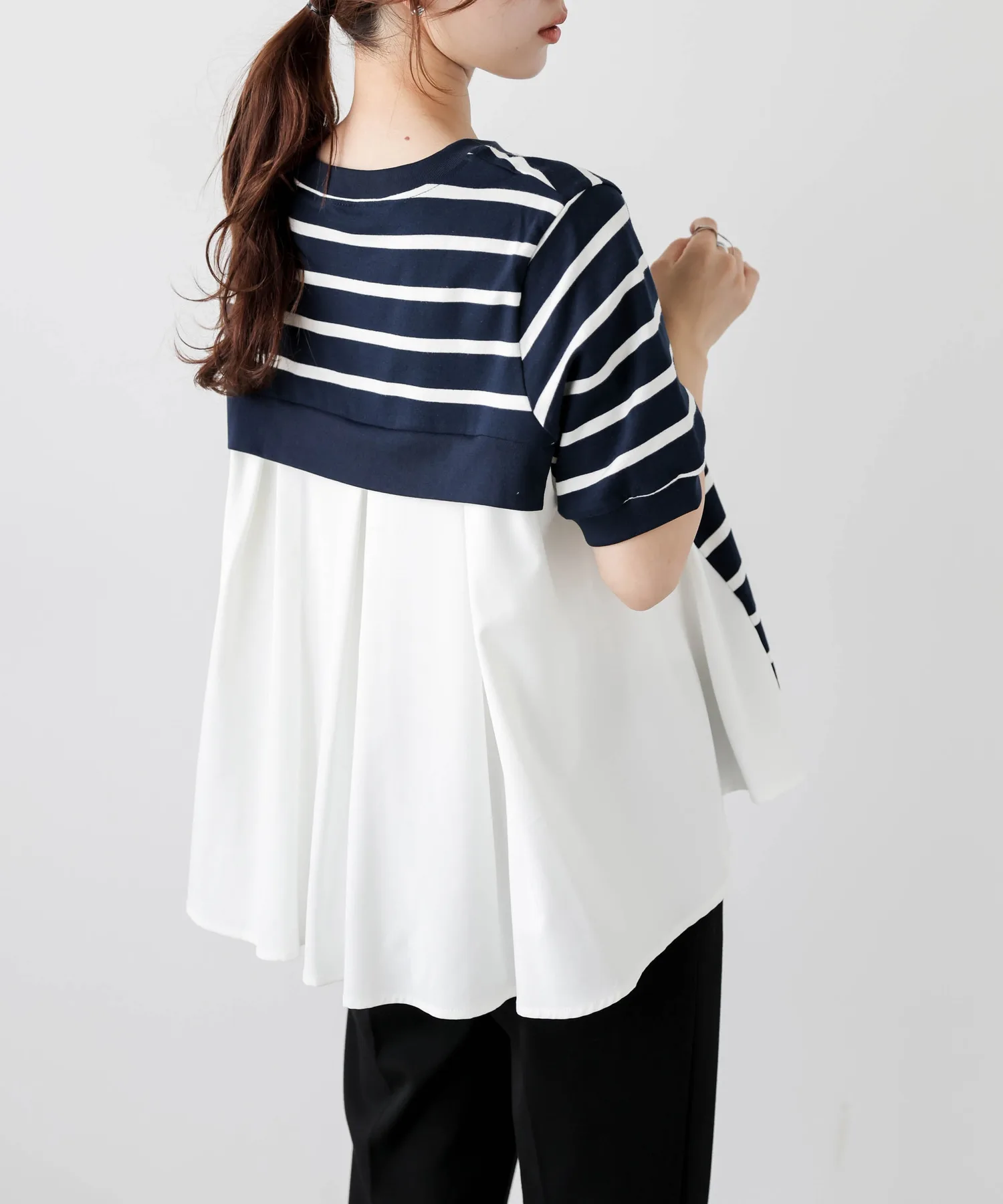 Этот топ выполнен из полосатой ткани, создающей непринужденный взрослый образ, в сочетании с расклешенной спинкой, добавляющей нотку женственной элегантности. Сочетайте его с простыми брюками, например, прямыми брюками, для создания идеально милого образа сзади. ◎