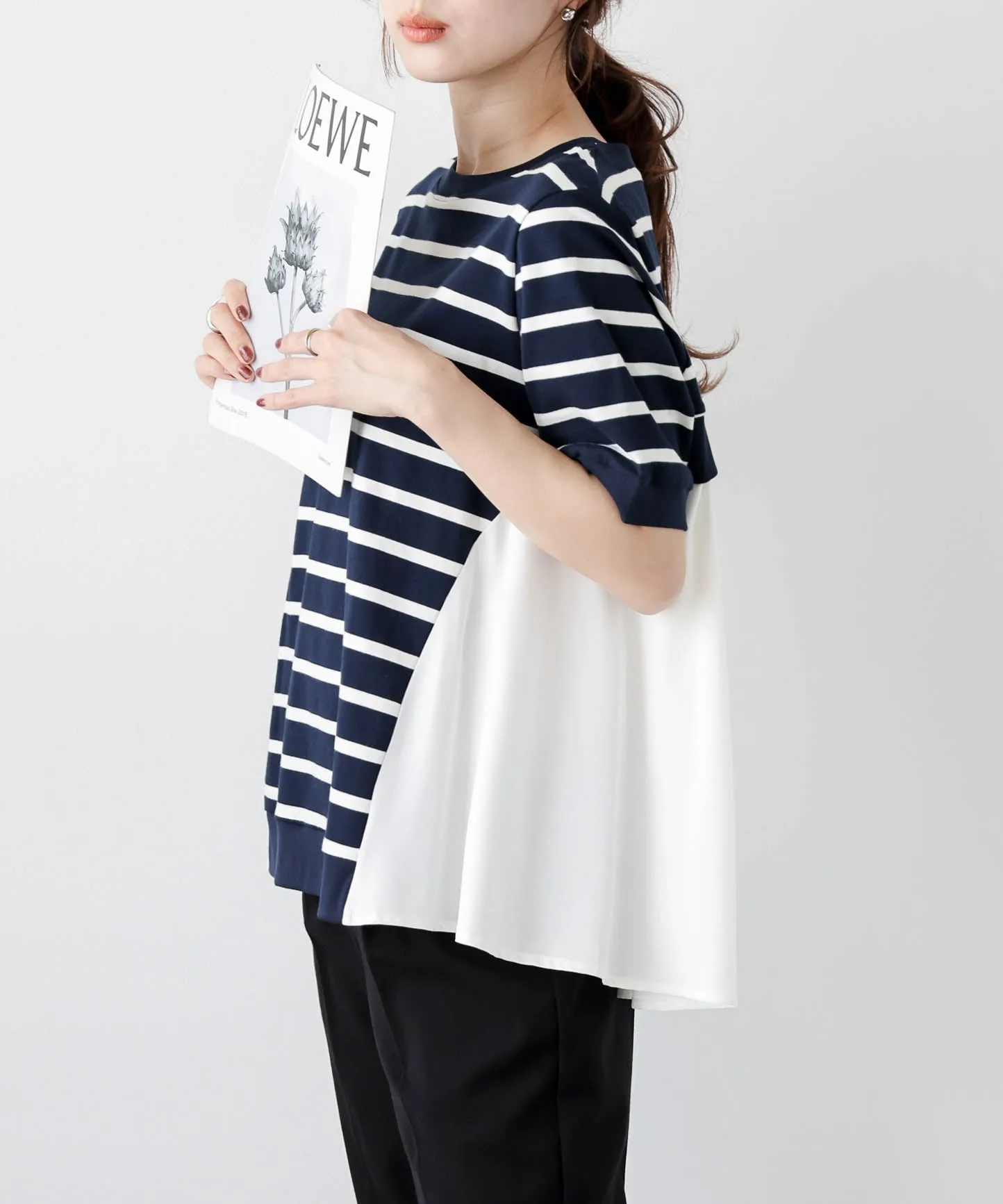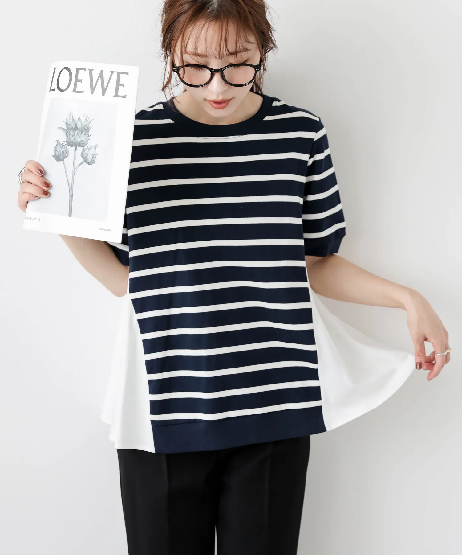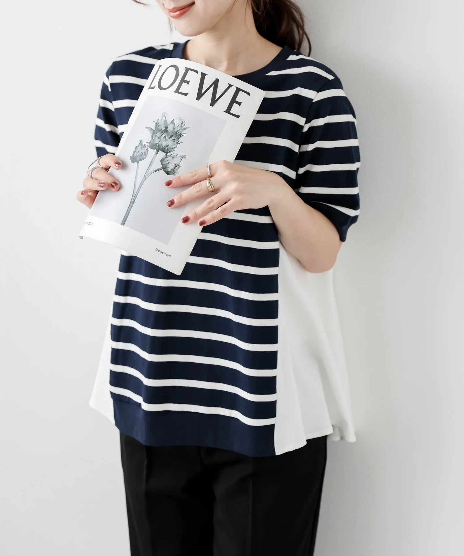 Этот топ выполнен из полосатой ткани, создающей непринужденный взрослый образ, в сочетании с расклешенной спинкой, добавляющей нотку женственной элегантности. Сочетайте его с простыми брюками, например, прямыми брюками, для создания идеально милого образа сзади. ◎