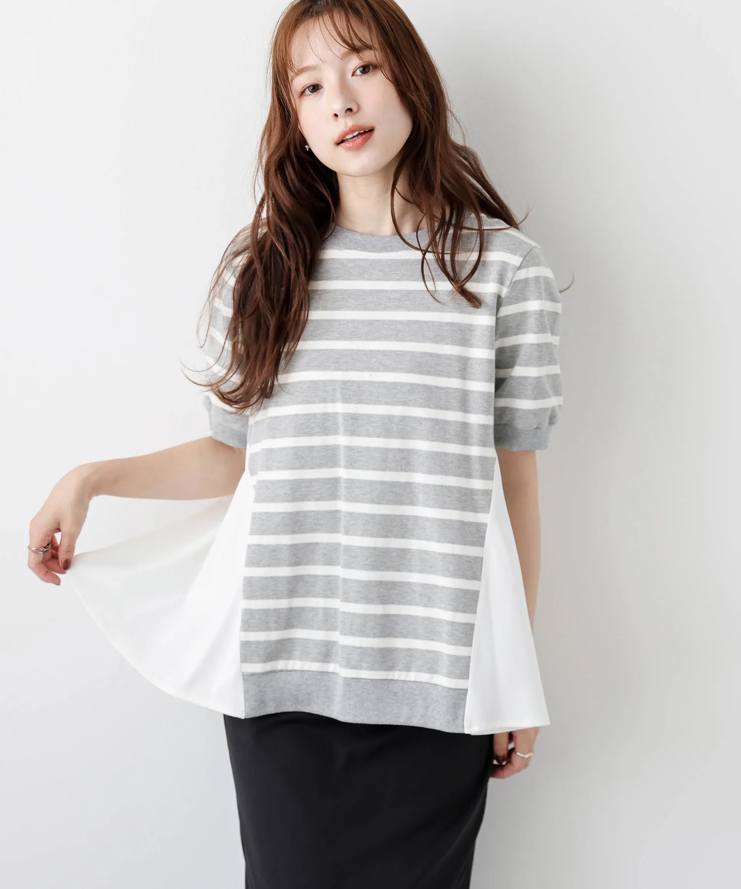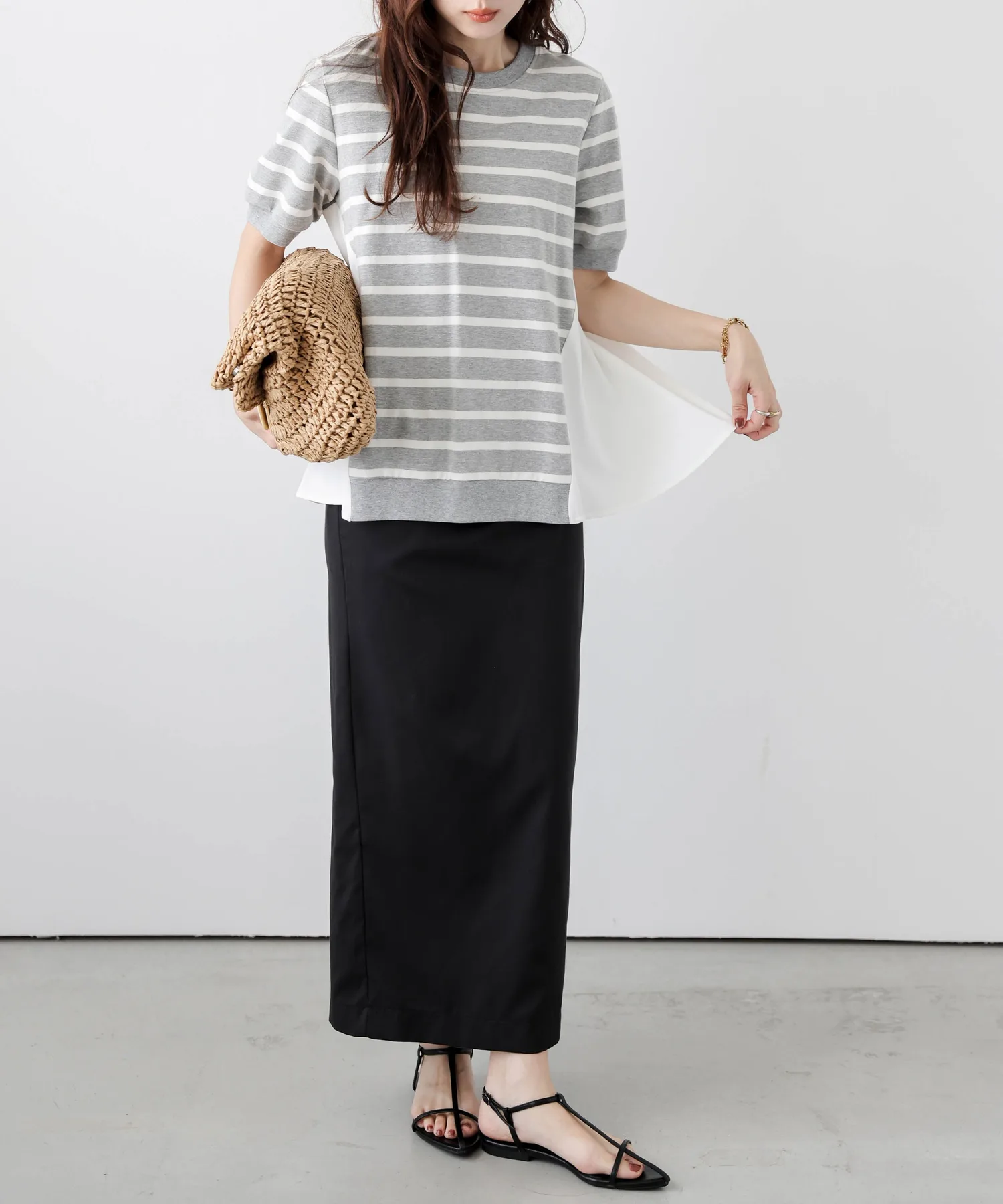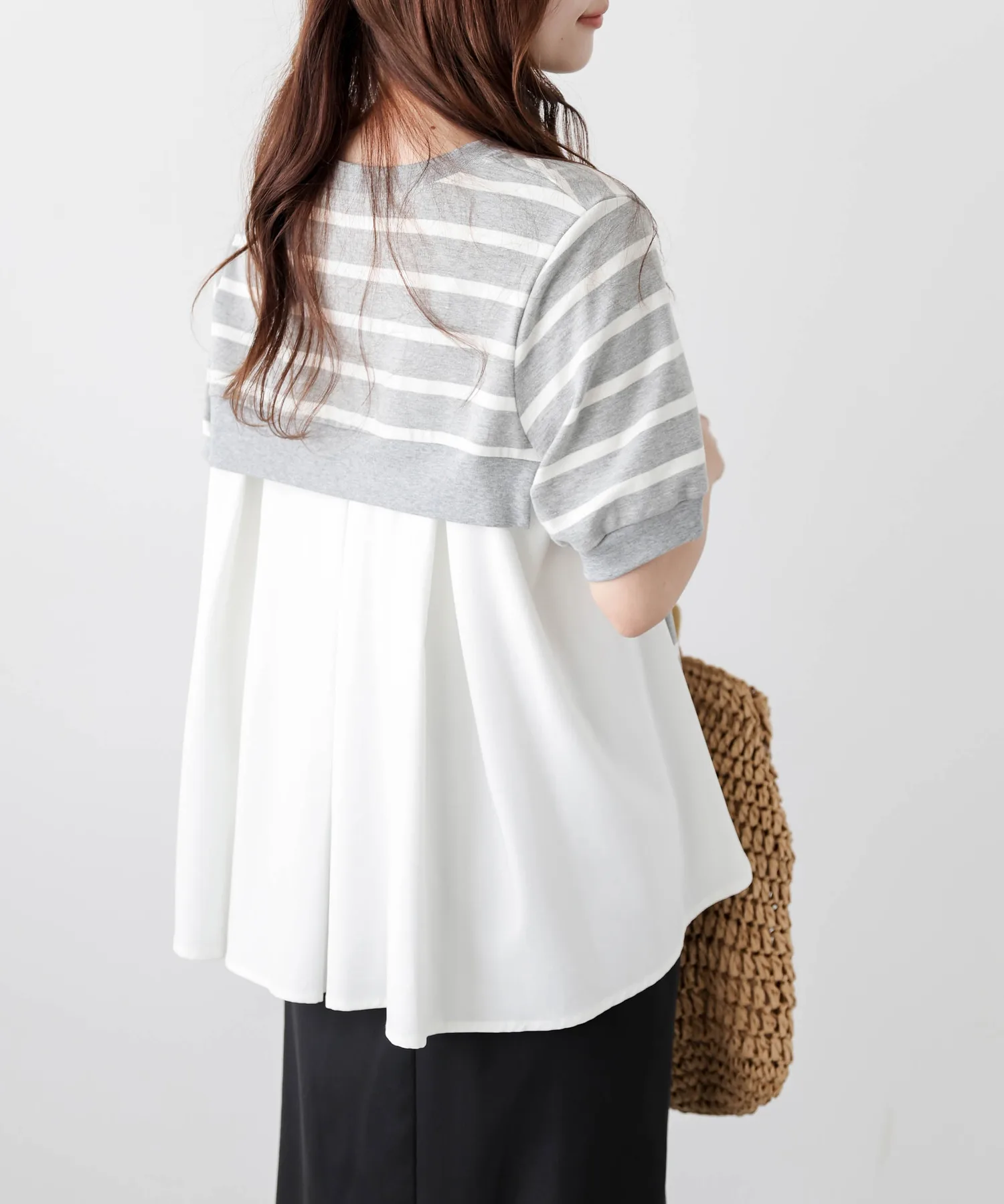 Этот топ выполнен из полосатой ткани, создающей непринужденный взрослый образ, в сочетании с расклешенной спинкой, добавляющей нотку женственной элегантности. Сочетайте его с простыми брюками, например, прямыми брюками, для создания идеально милого образа сзади. ◎