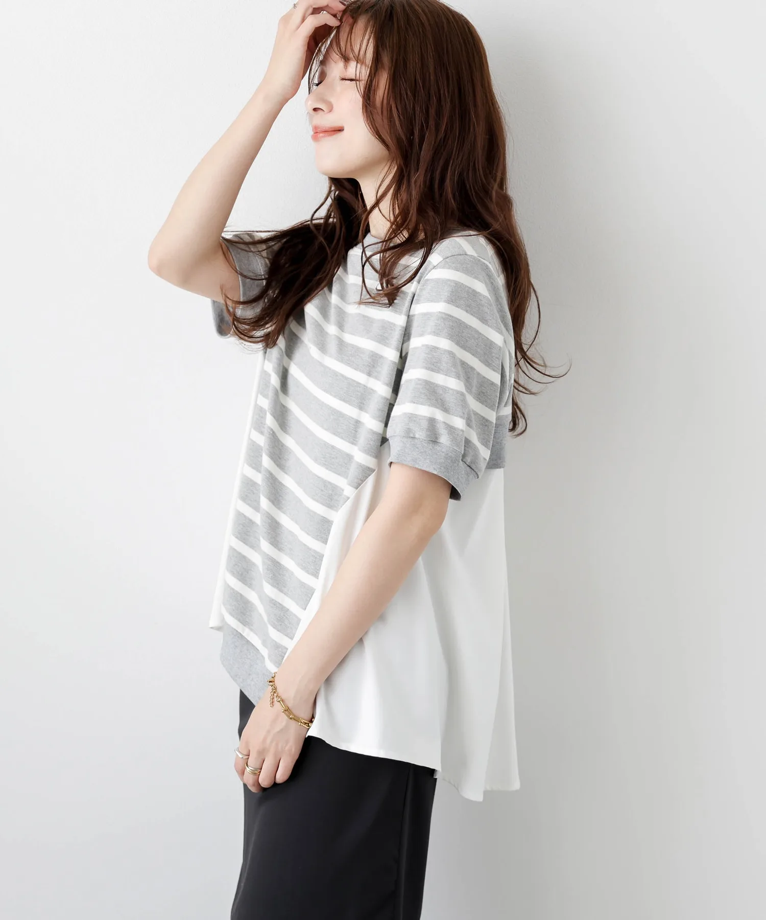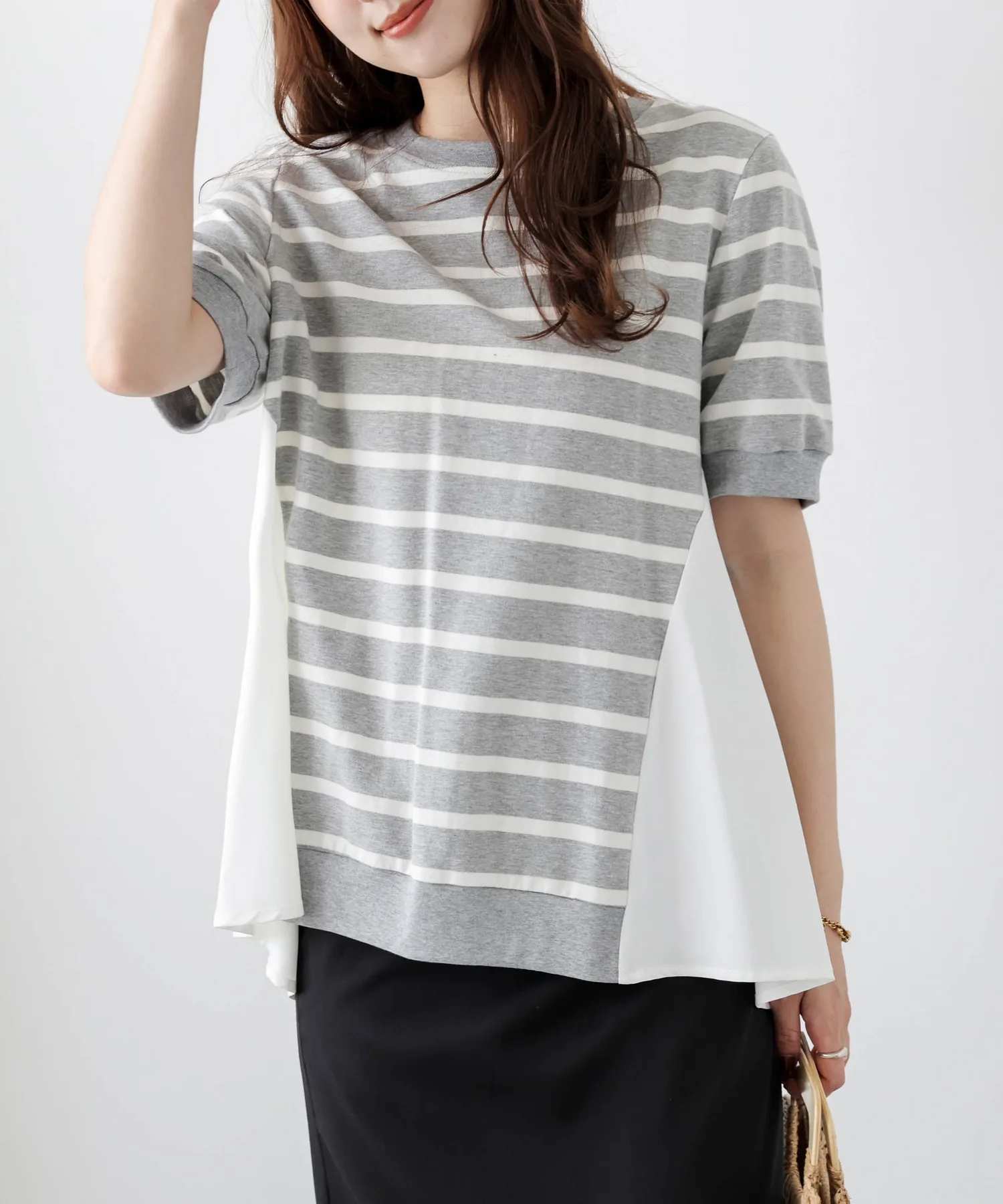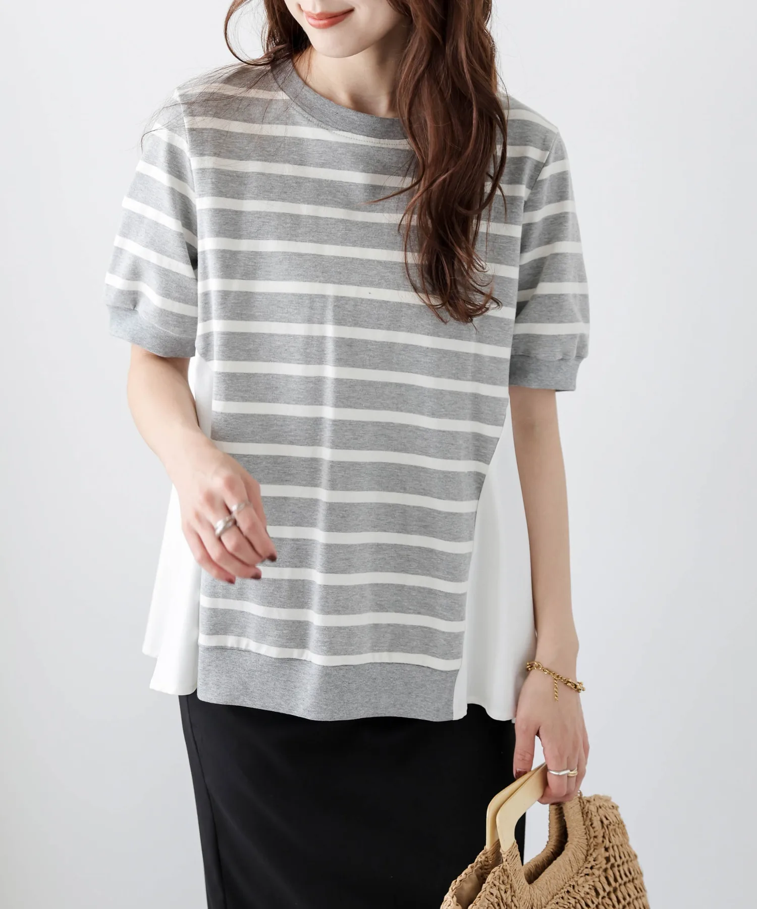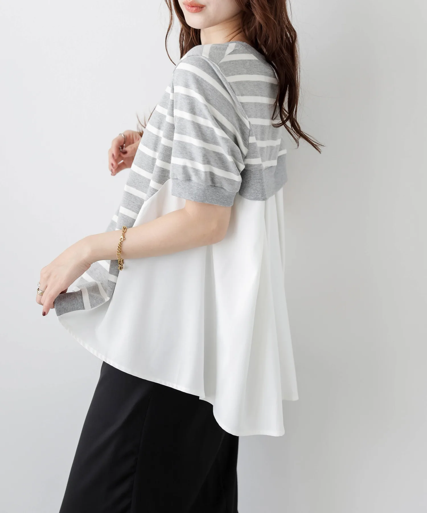 Этот топ выполнен из полосатой ткани, создающей непринужденный взрослый образ, в сочетании с расклешенной спинкой, добавляющей нотку женственной элегантности. Сочетайте его с простыми брюками, например, прямыми брюками, для создания идеально милого образа сзади. ◎