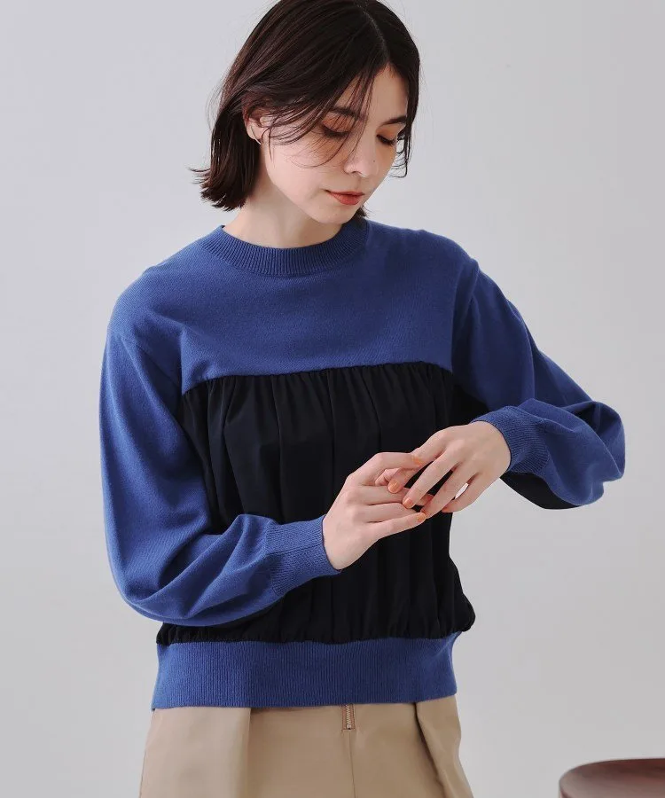- Вязаный пуловер с дизайном, в котором различные ткани соединяются и переходят от области груди к подрукавникам.