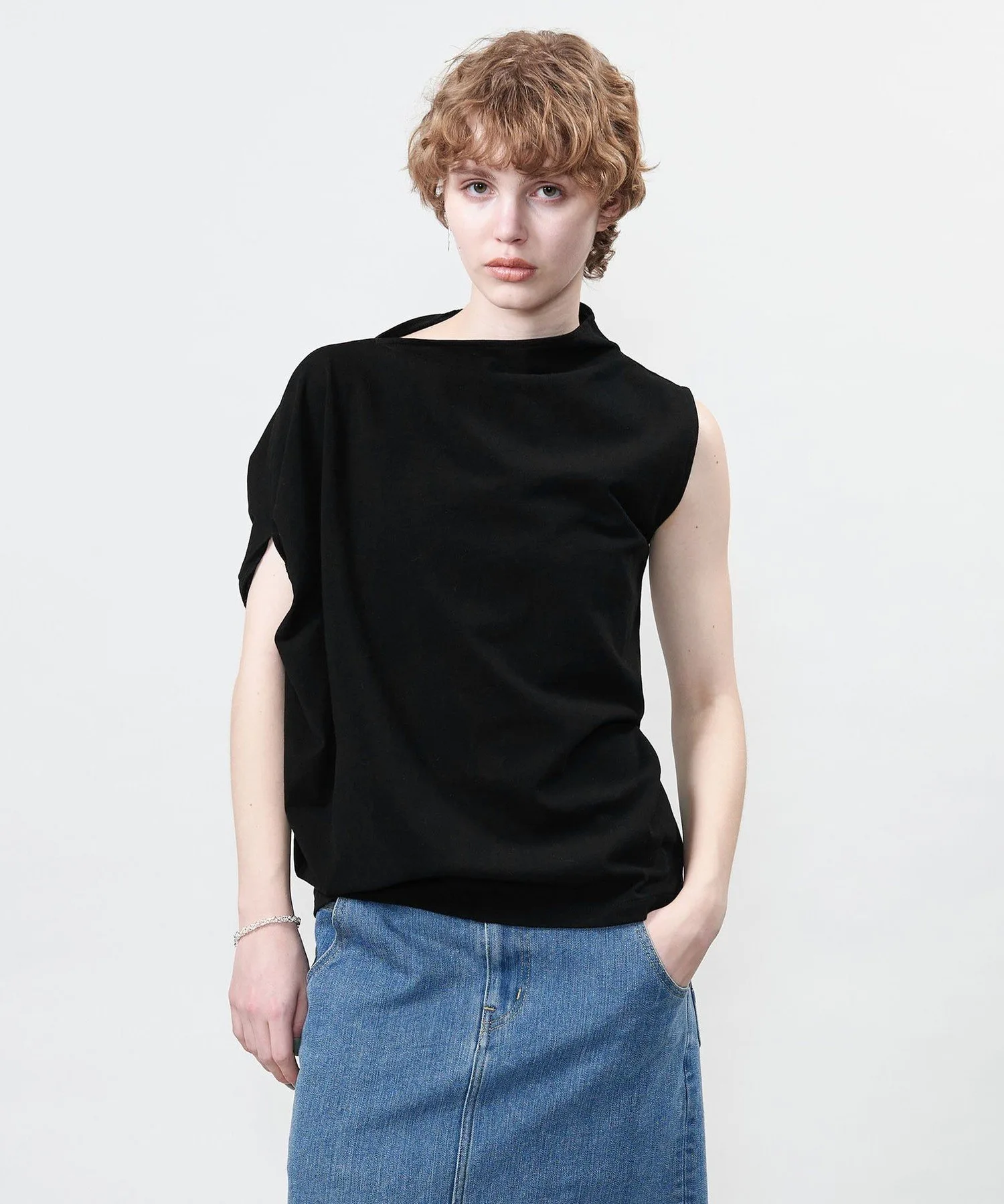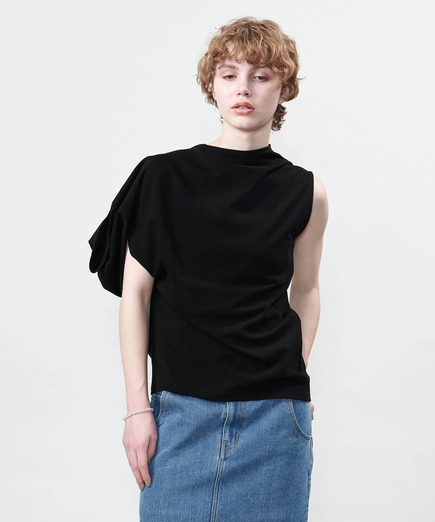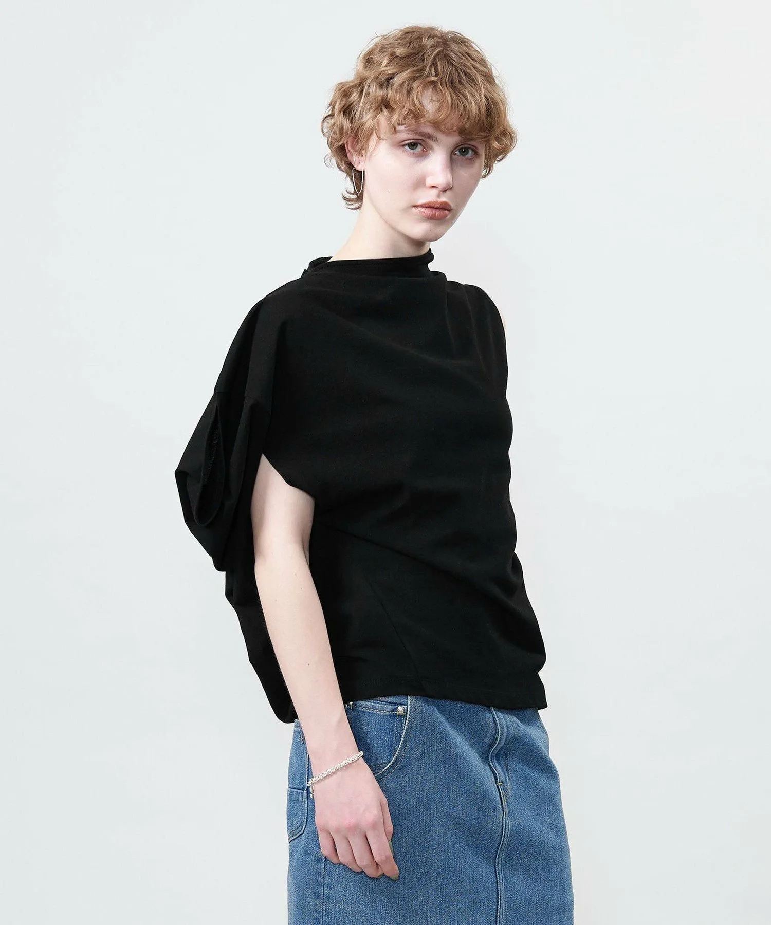 Костюм с асимметричным дизайном, позволяющий менять способ ношения, выбирая расположение рукавов.
