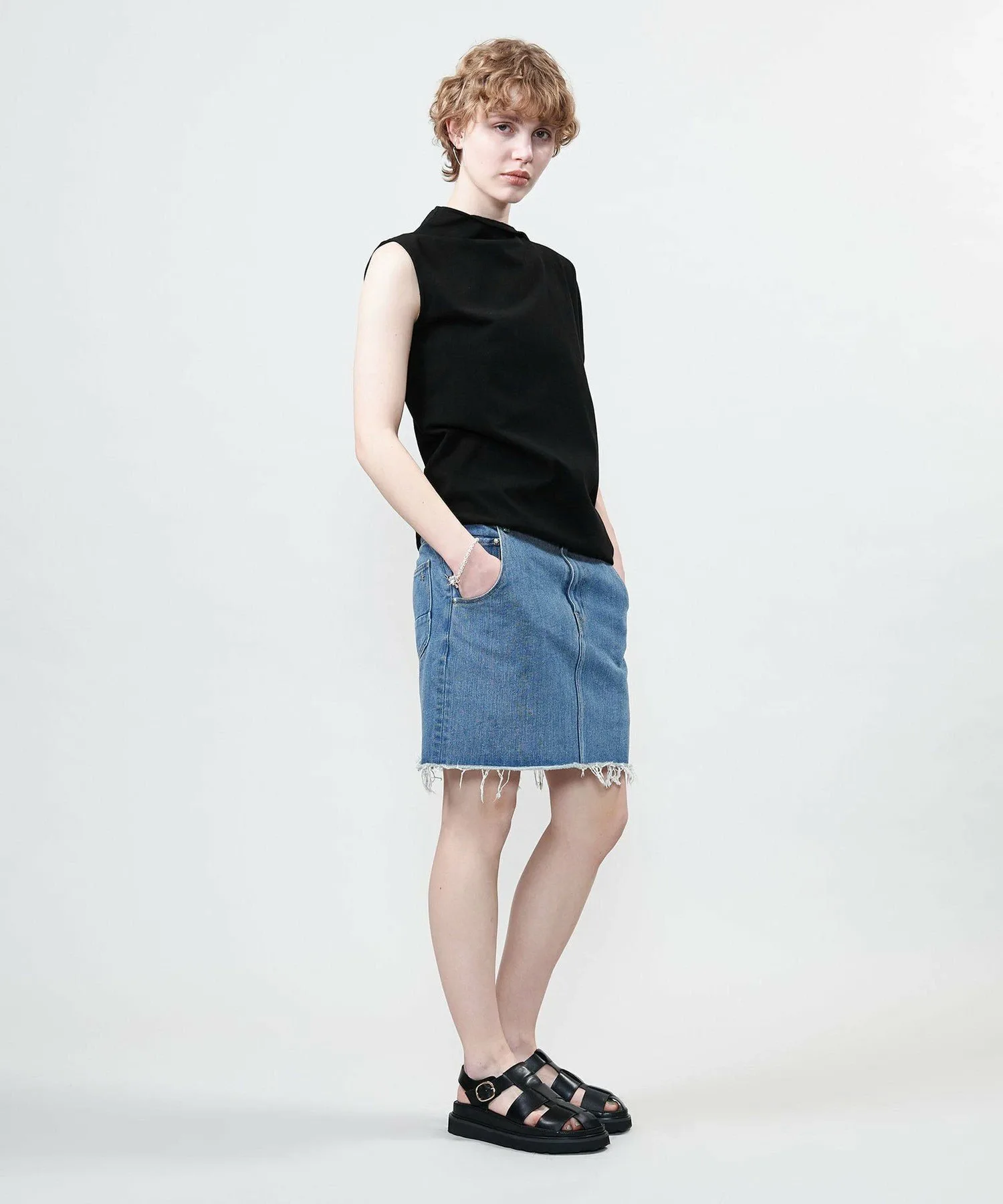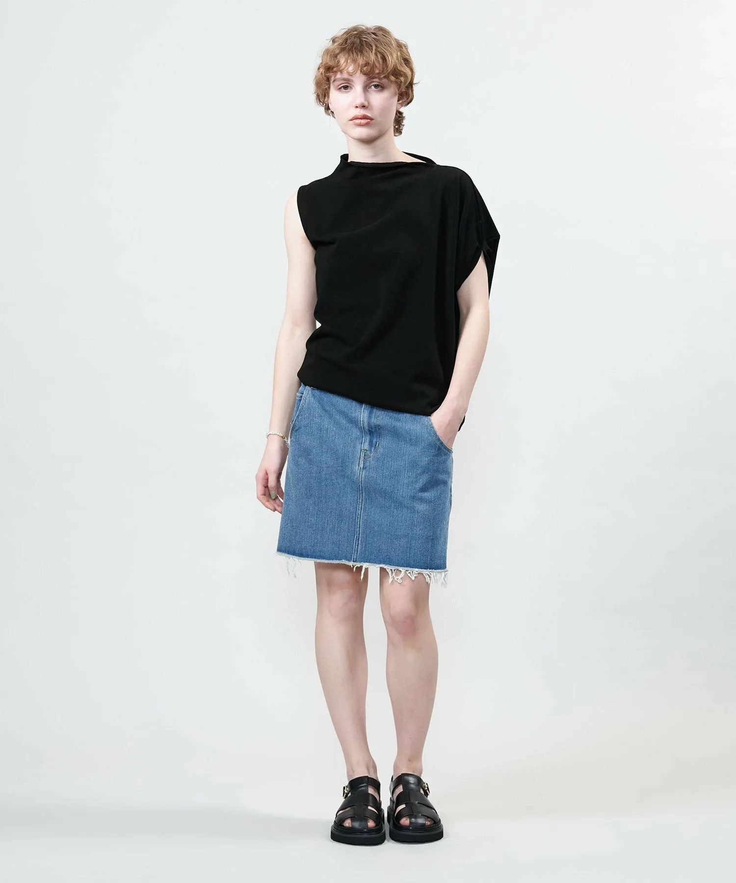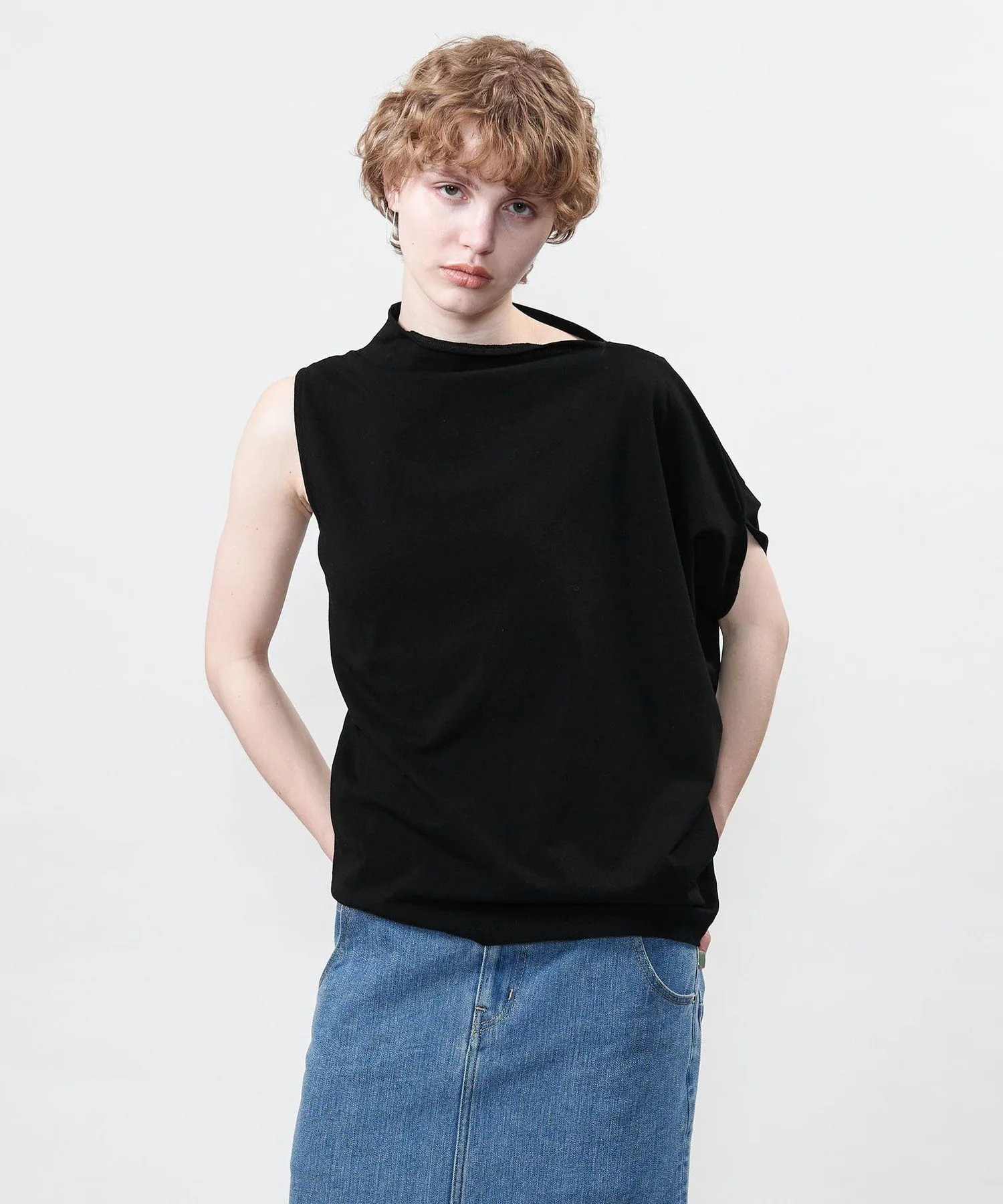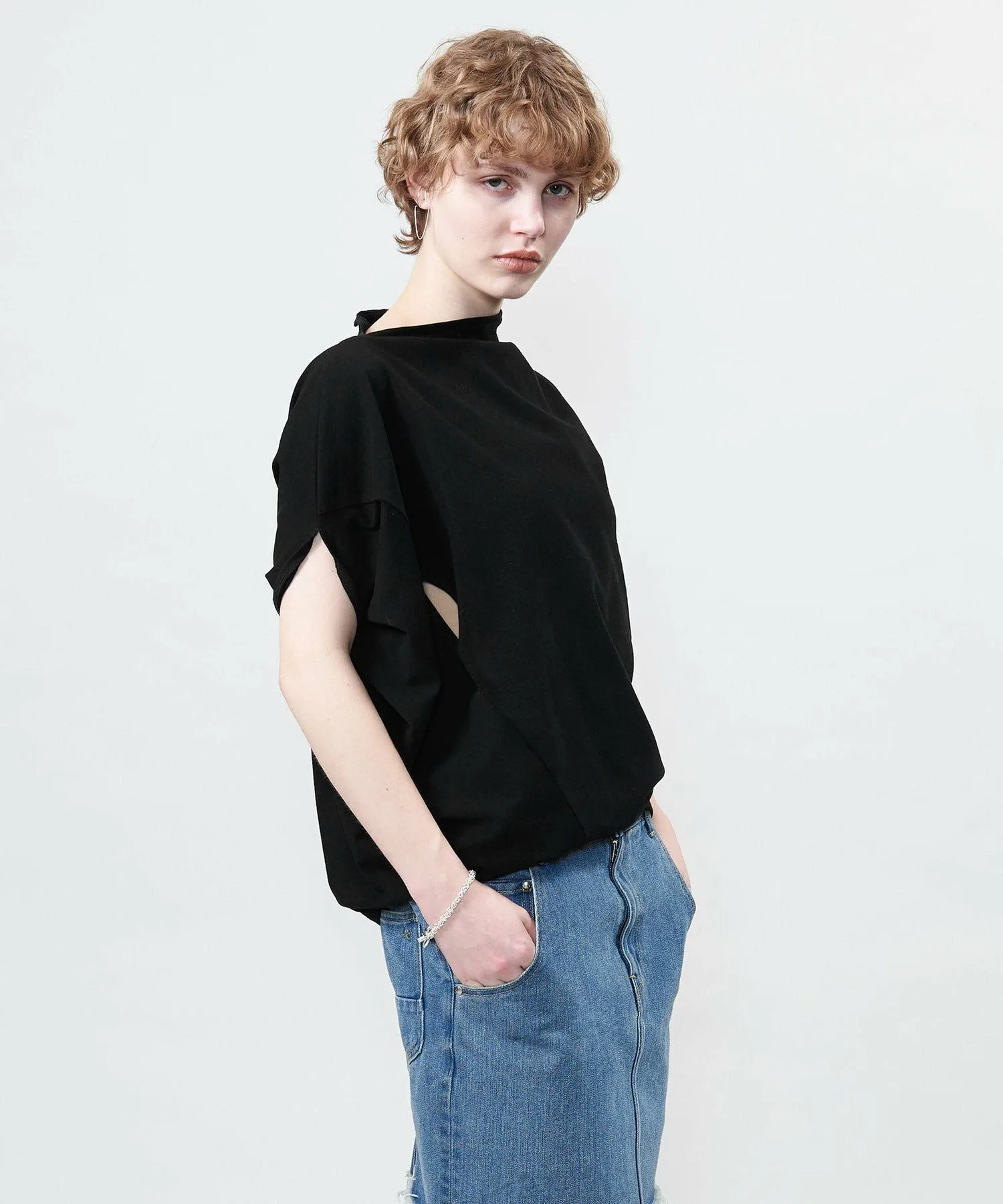 Костюм с асимметричным дизайном, позволяющий менять способ ношения, выбирая расположение рукавов.