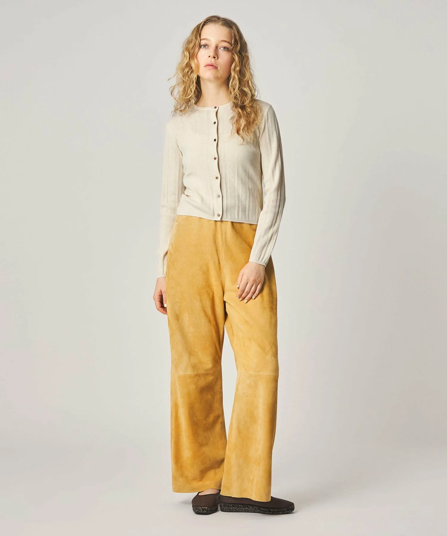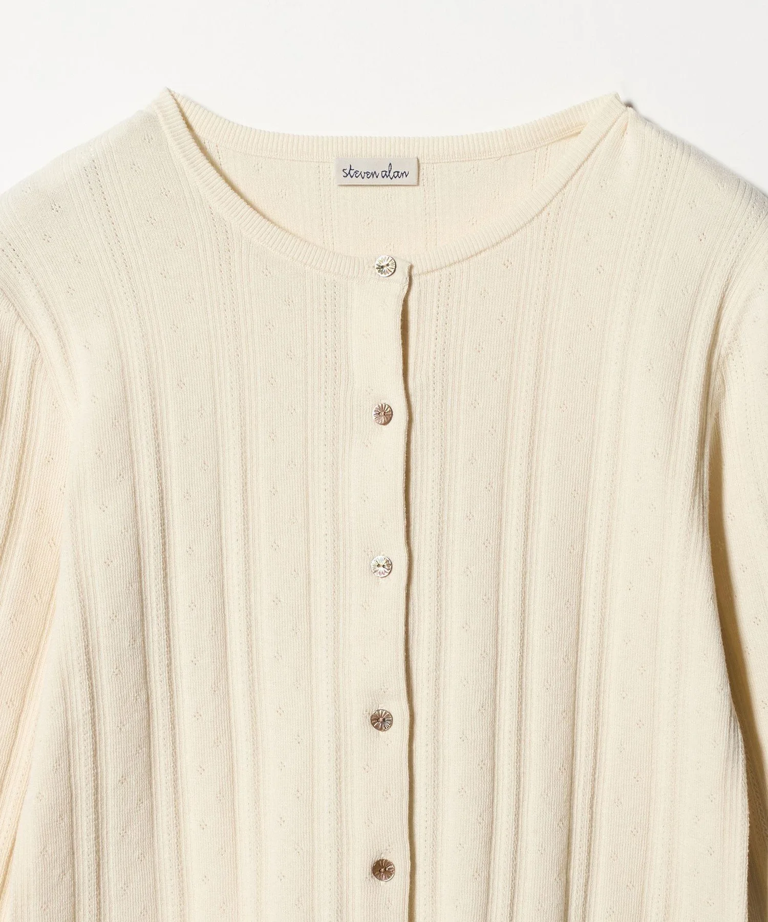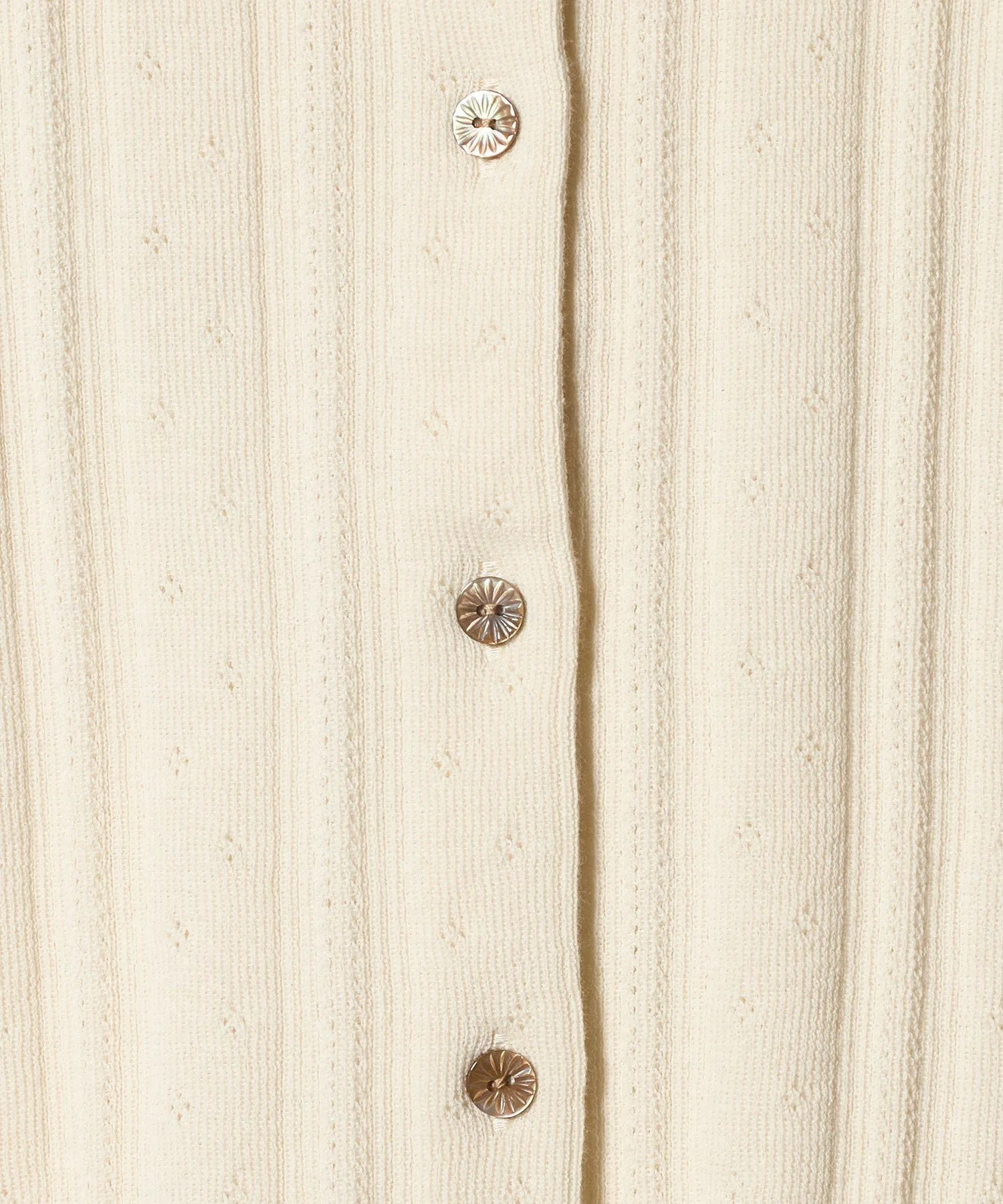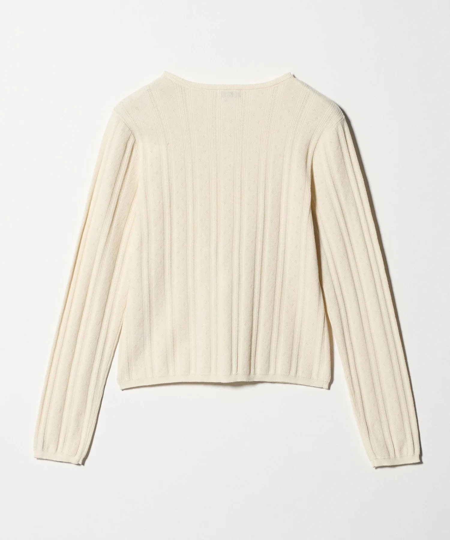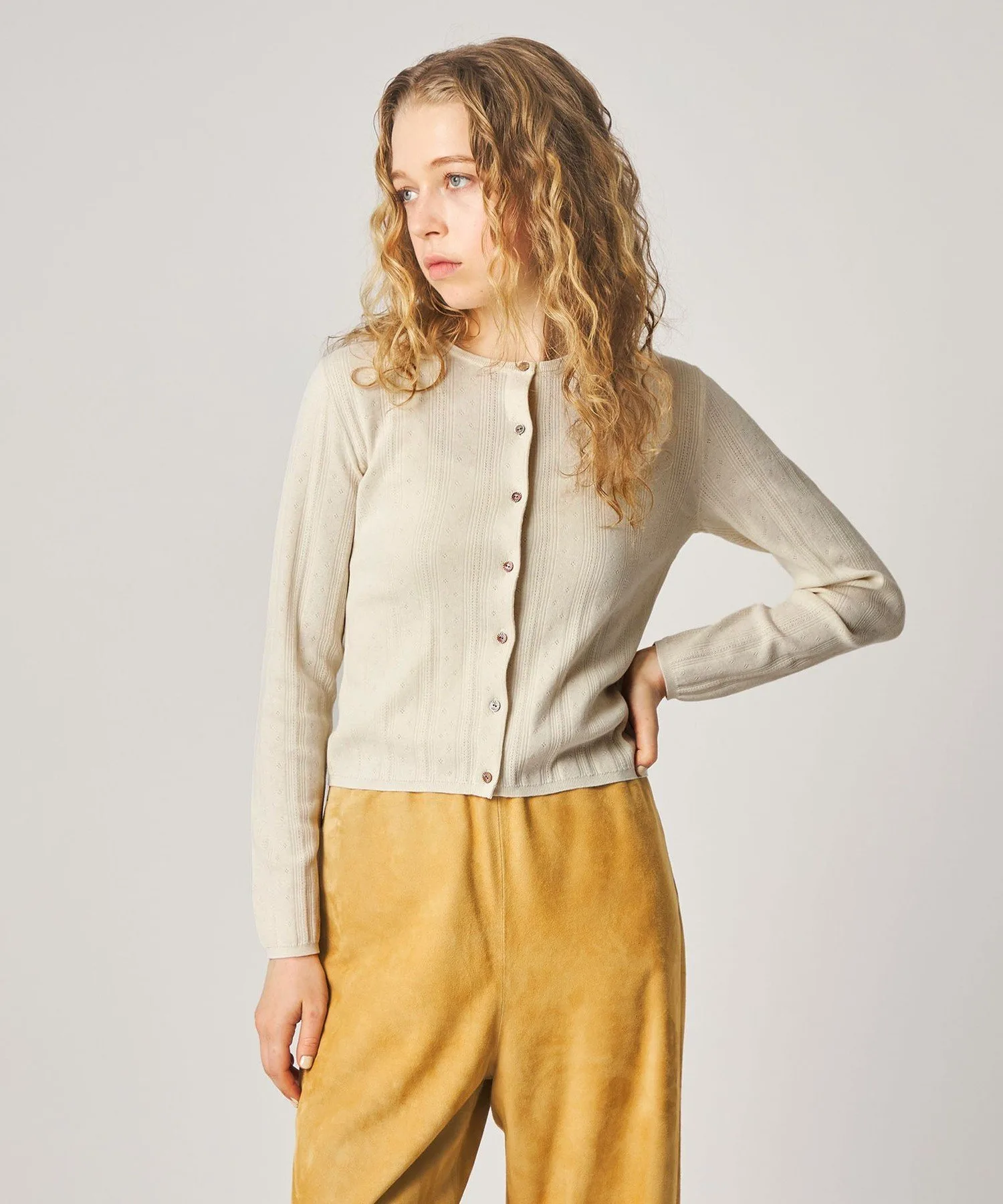 Этот кардиган украшен пуговицами с вырезом спереди. Изготовленный из гладкой хлопково-полиэстерной пряжи, полностью вязаный дизайн с люверсами добавляет изысканную текстуру. Приталенный силуэт плотно облегает тело, что делает его достаточно универсальным, чтобы носить его как жакет или застегнуть на пуговицы самостоятельно. Он легко сочетается с любыми брюками и юбками, что делает его универсальным как для повседневной носки, так и для создания изысканных образов. В этой же серии также доступен пуловер.