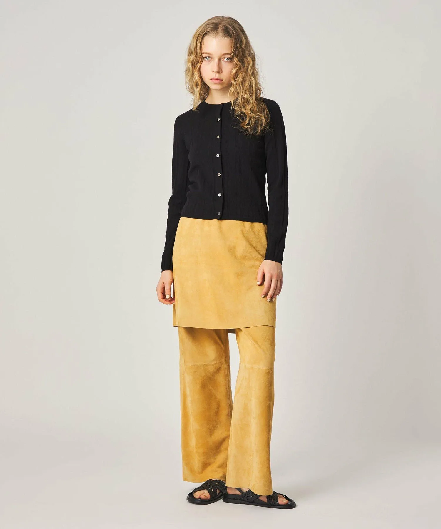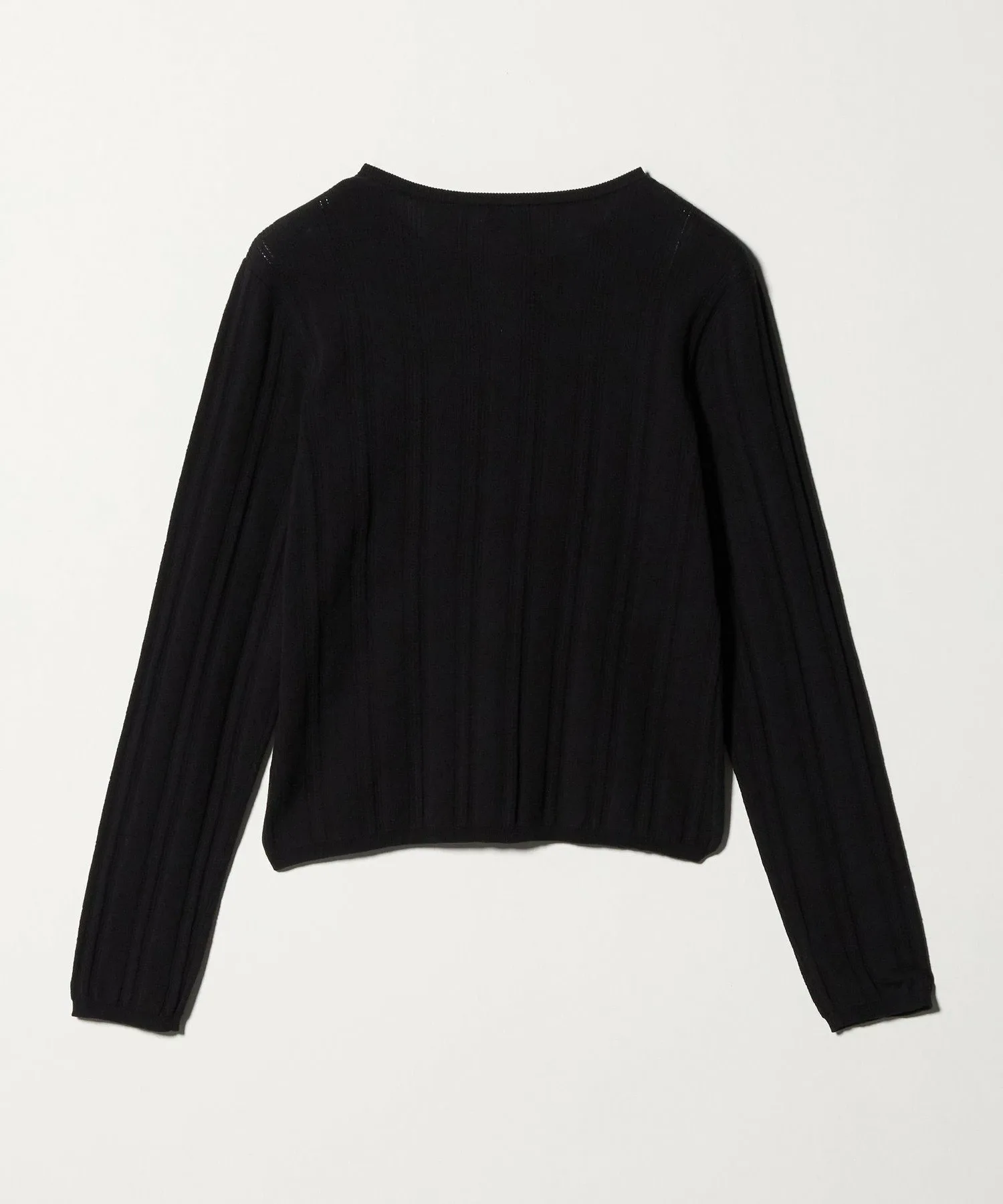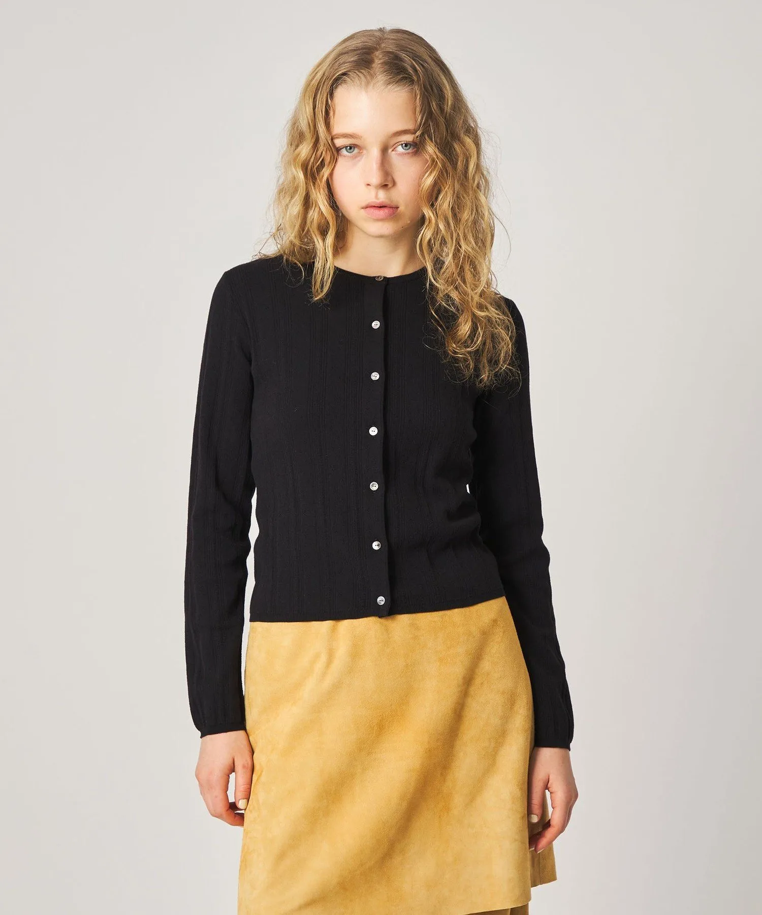 Этот кардиган украшен пуговицами с вырезом спереди. Изготовленный из гладкой хлопково-полиэстерной пряжи, полностью вязаный дизайн с люверсами добавляет изысканную текстуру. Приталенный силуэт плотно облегает тело, что делает его достаточно универсальным, чтобы носить его как жакет или застегнуть на пуговицы самостоятельно. Он легко сочетается с любыми брюками и юбками, что делает его универсальным как для повседневной носки, так и для создания изысканных образов. В этой же серии также доступен пуловер.