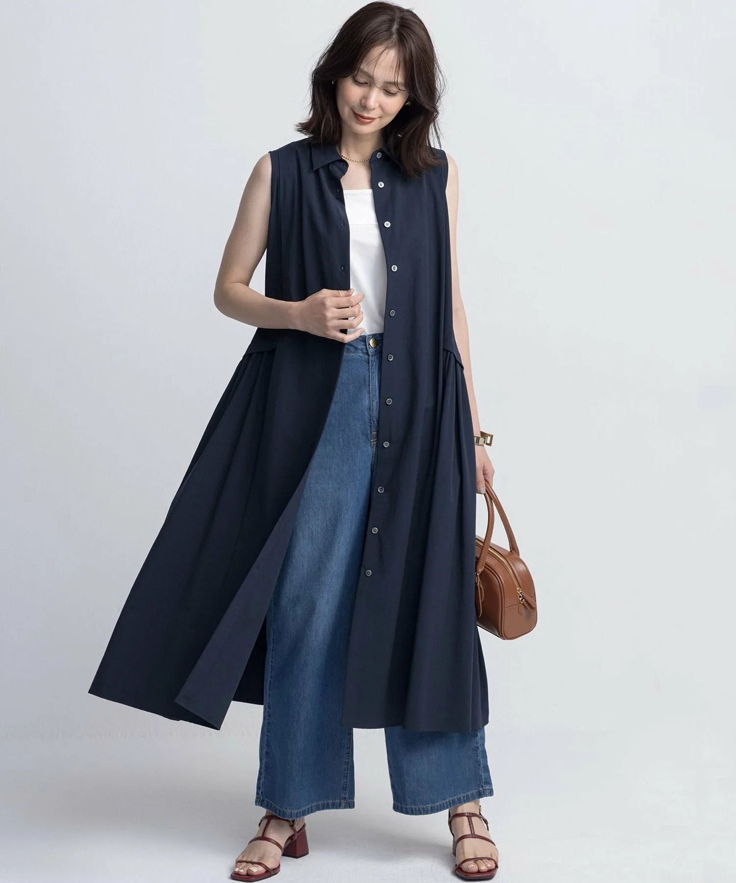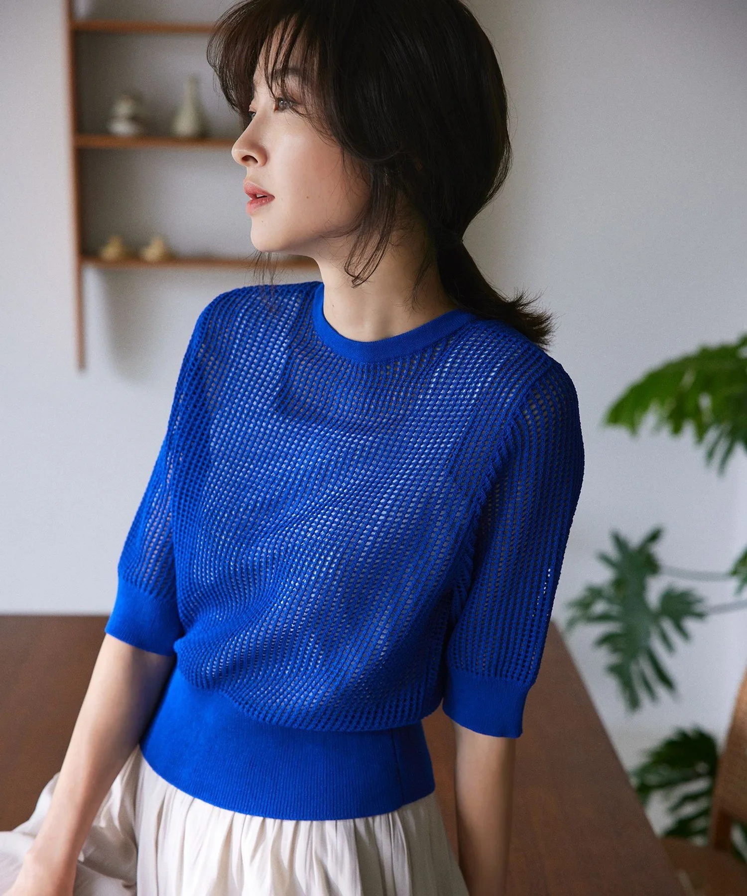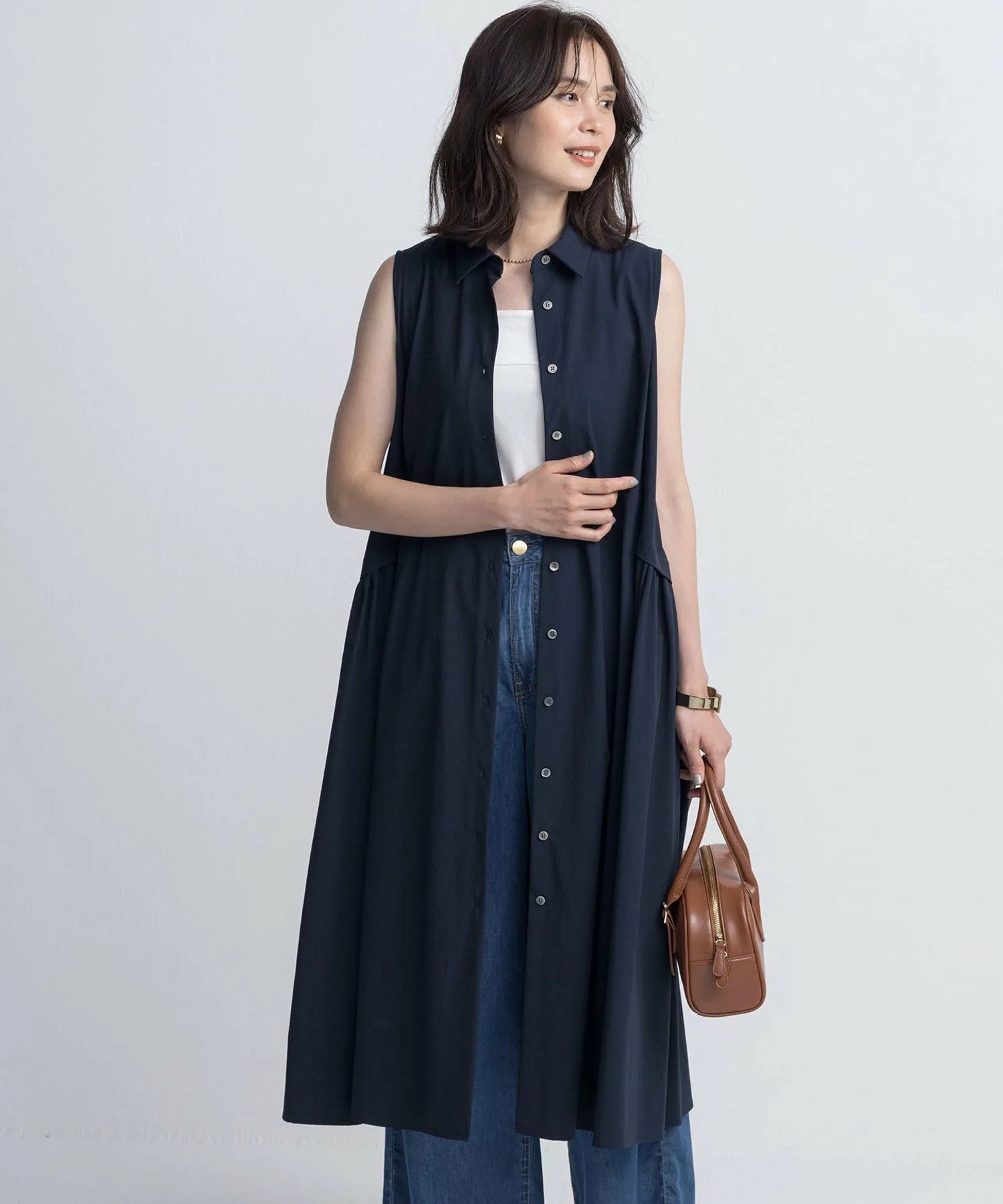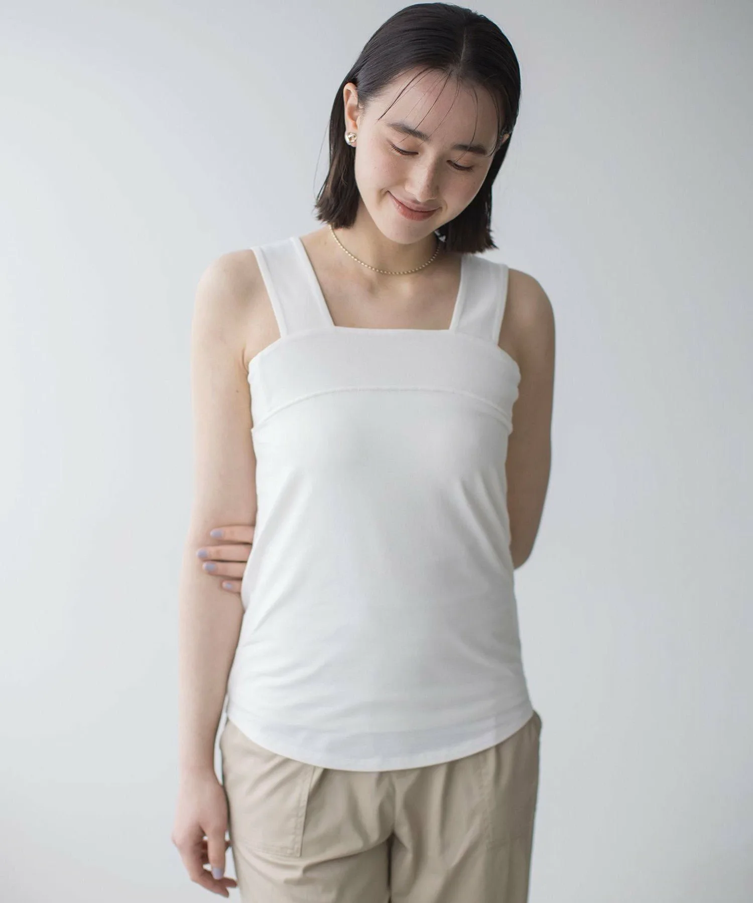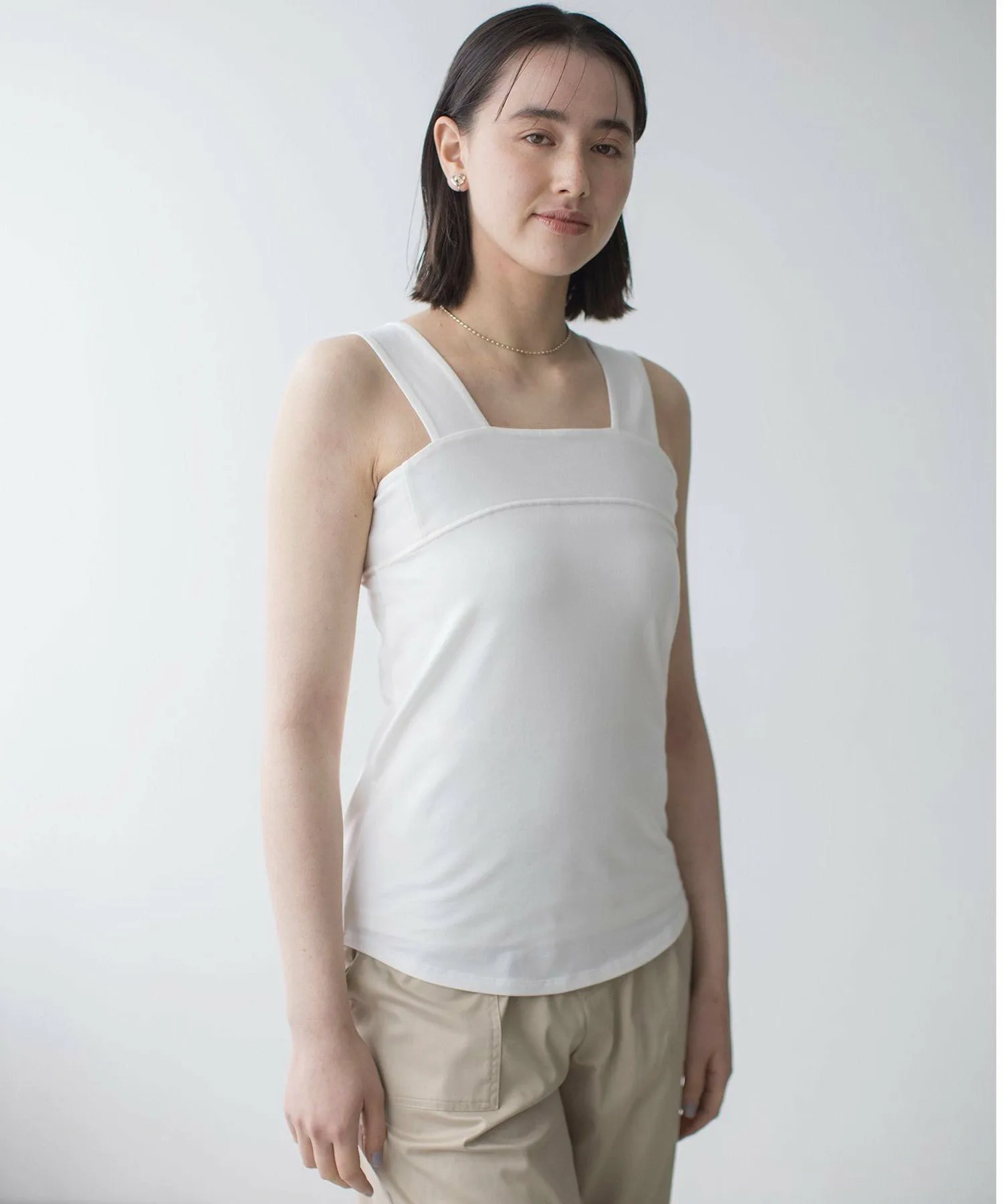 Дизайн・Квадратная майка с открытым верхом, с широкими бретелями, скрывающими грудь и бретели нижнего белья. ・Неглубокий квадратный вырез создает аккуратный силуэт вокруг груди и обеспечивает достаточное покрытие до подмышек. ・Эластичный материал облегает тело, а контрастная ткань над грудью предотвращает чрезмерное обнажение. ・Грудная часть имеет двойной слой для непрозрачного вида. ・Чередование плетения ткани в области подмышек (вертикальное спереди и горизонтальное сзади) обеспечивает плотное прикрытие подмышек, которые часто являются наиболее чувствительной зоной, создавая аккуратный вид.