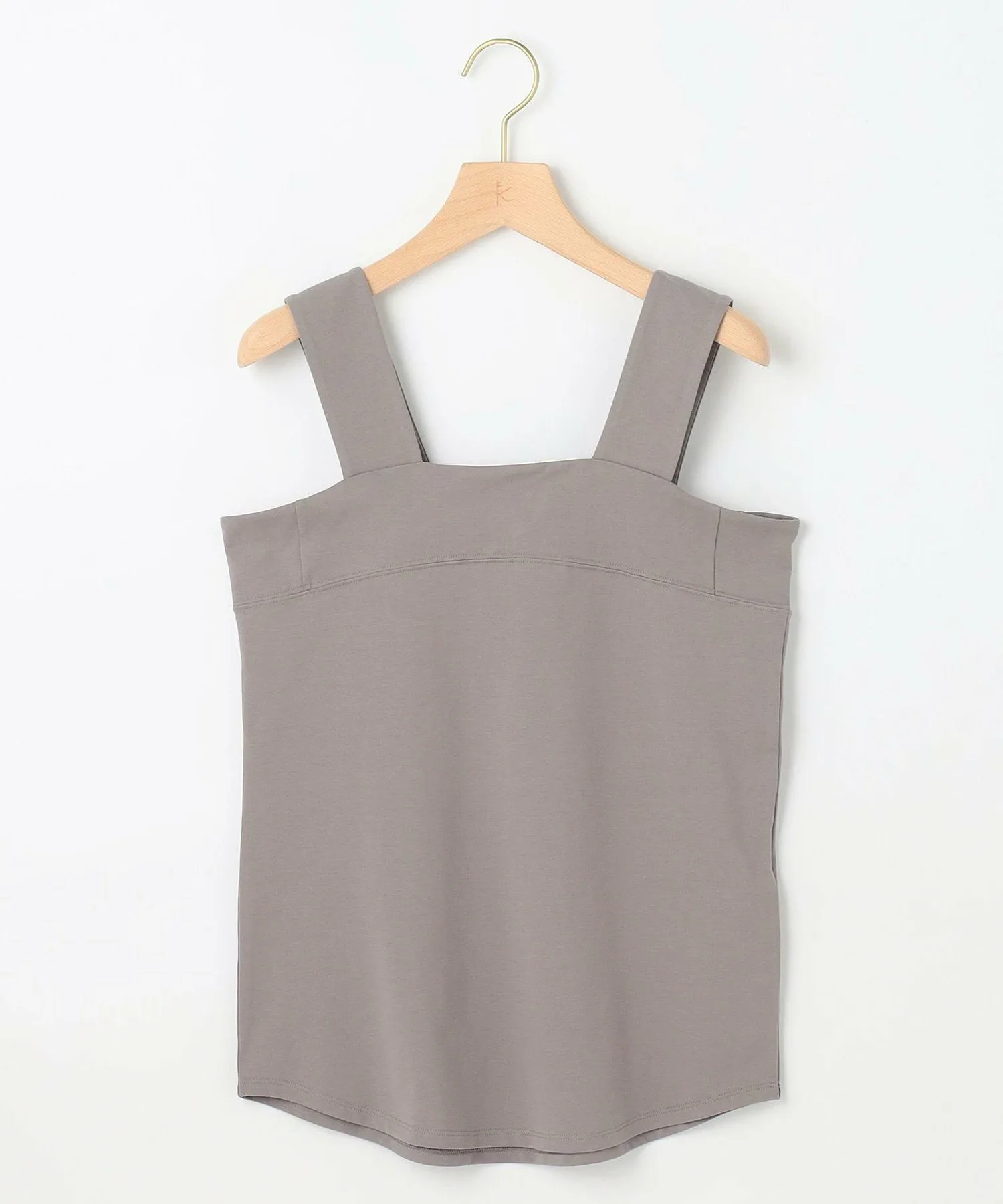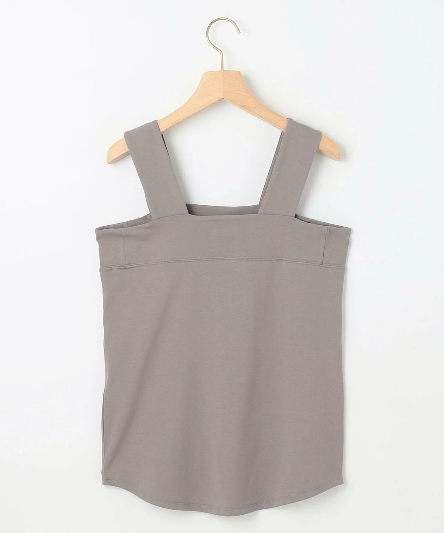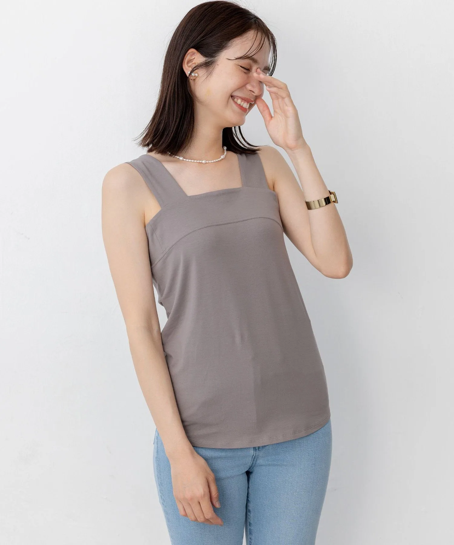 Дизайн・Квадратная майка с открытым верхом, с широкими бретелями, скрывающими грудь и бретели нижнего белья. ・Неглубокий квадратный вырез создает аккуратный силуэт вокруг груди и обеспечивает достаточное покрытие до подмышек. ・Эластичный материал облегает тело, а контрастная ткань над грудью предотвращает чрезмерное обнажение. ・Грудная часть имеет двойной слой для непрозрачного вида. ・Чередование плетения ткани в области подмышек (вертикальное спереди и горизонтальное сзади) обеспечивает плотное прикрытие подмышек, которые часто являются наиболее чувствительной зоной, создавая аккуратный вид.