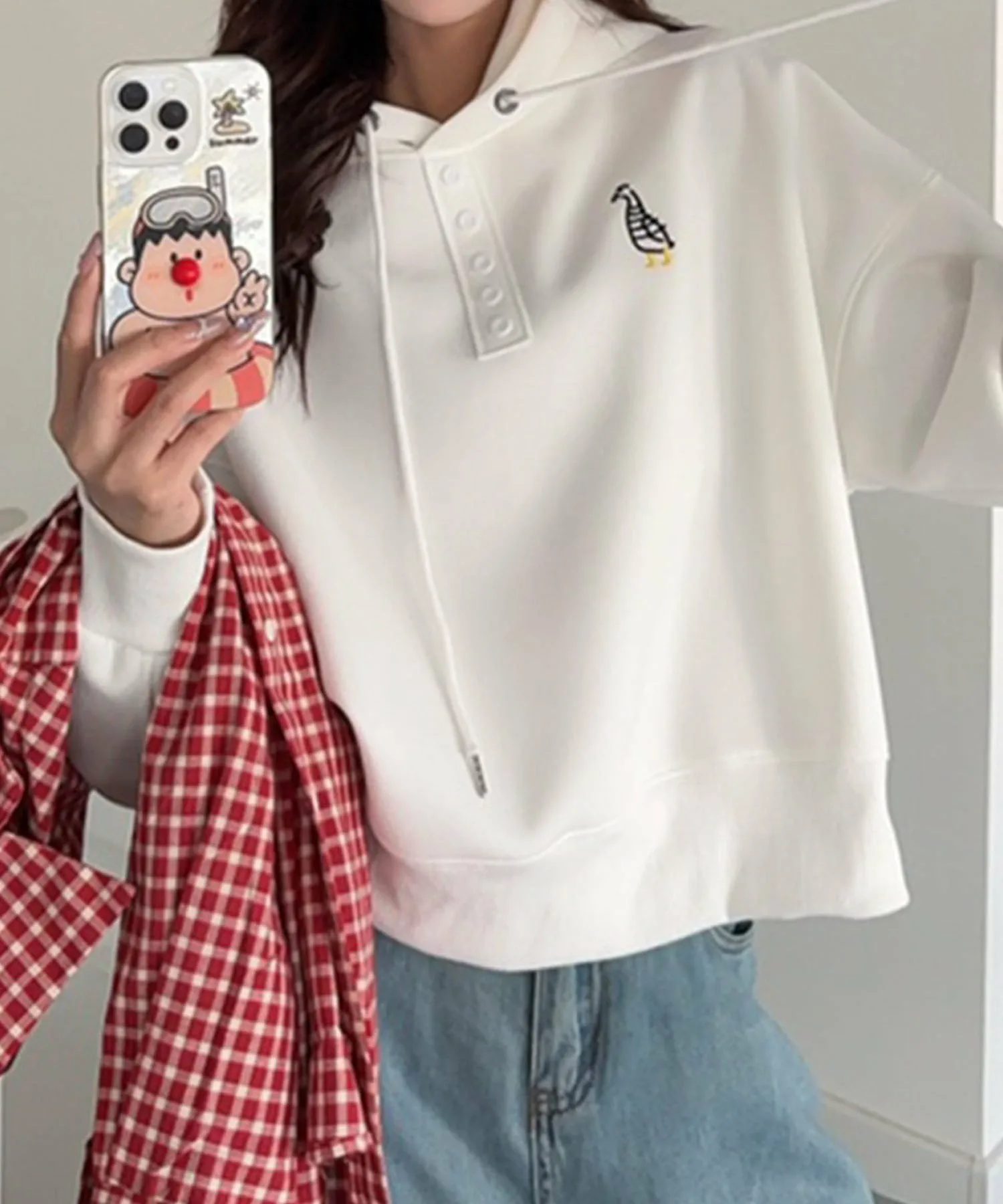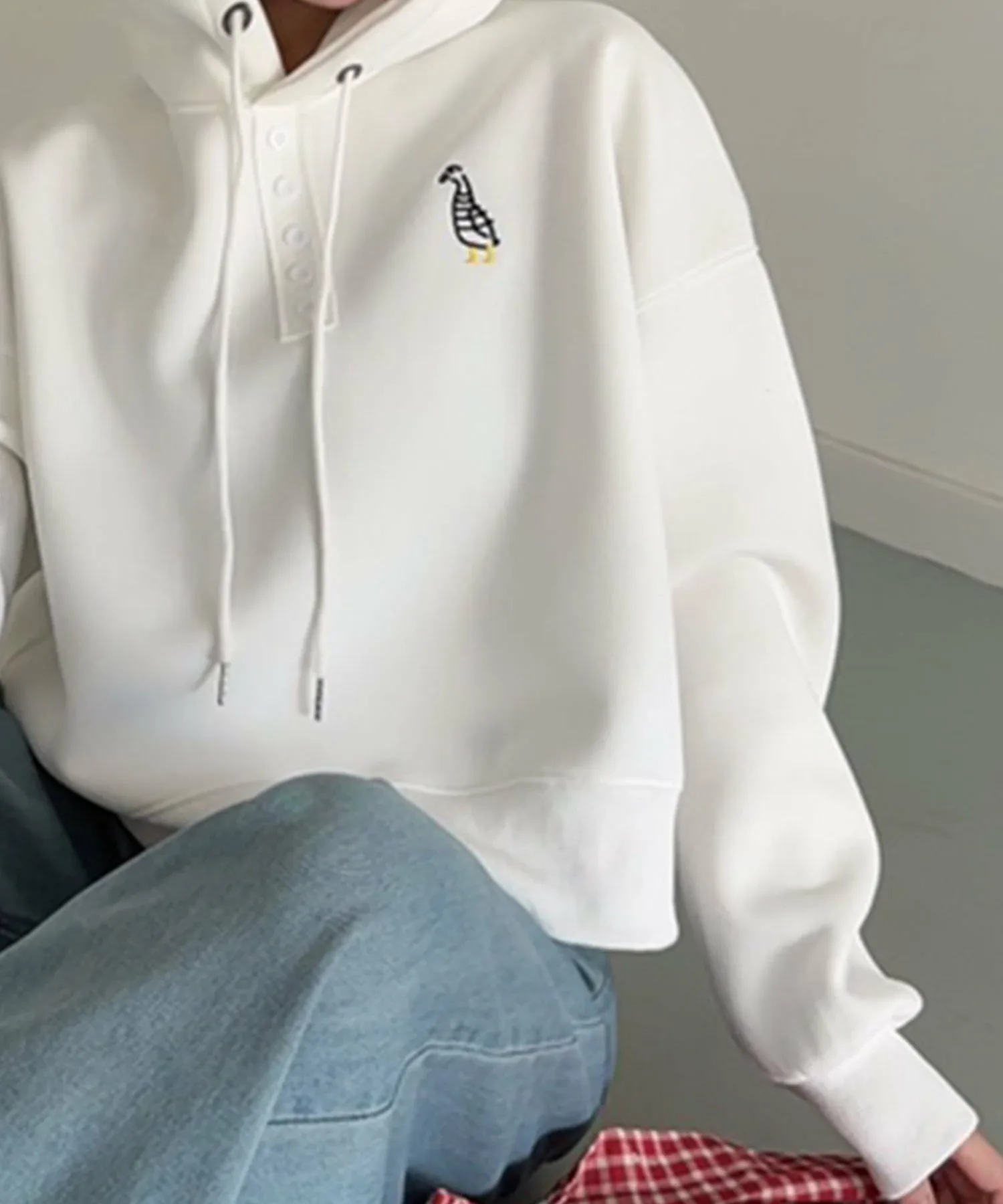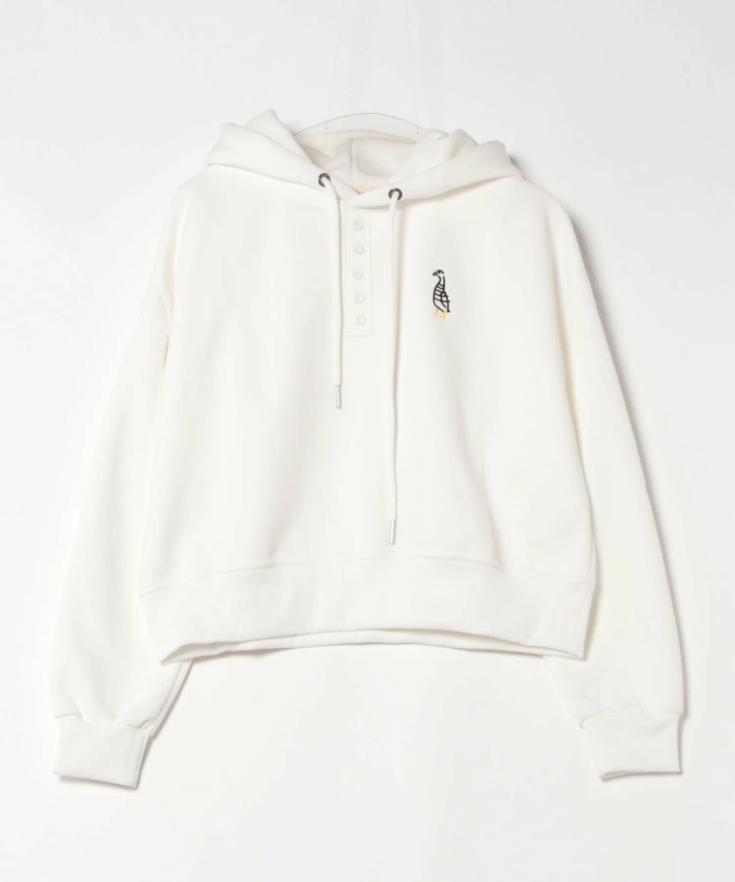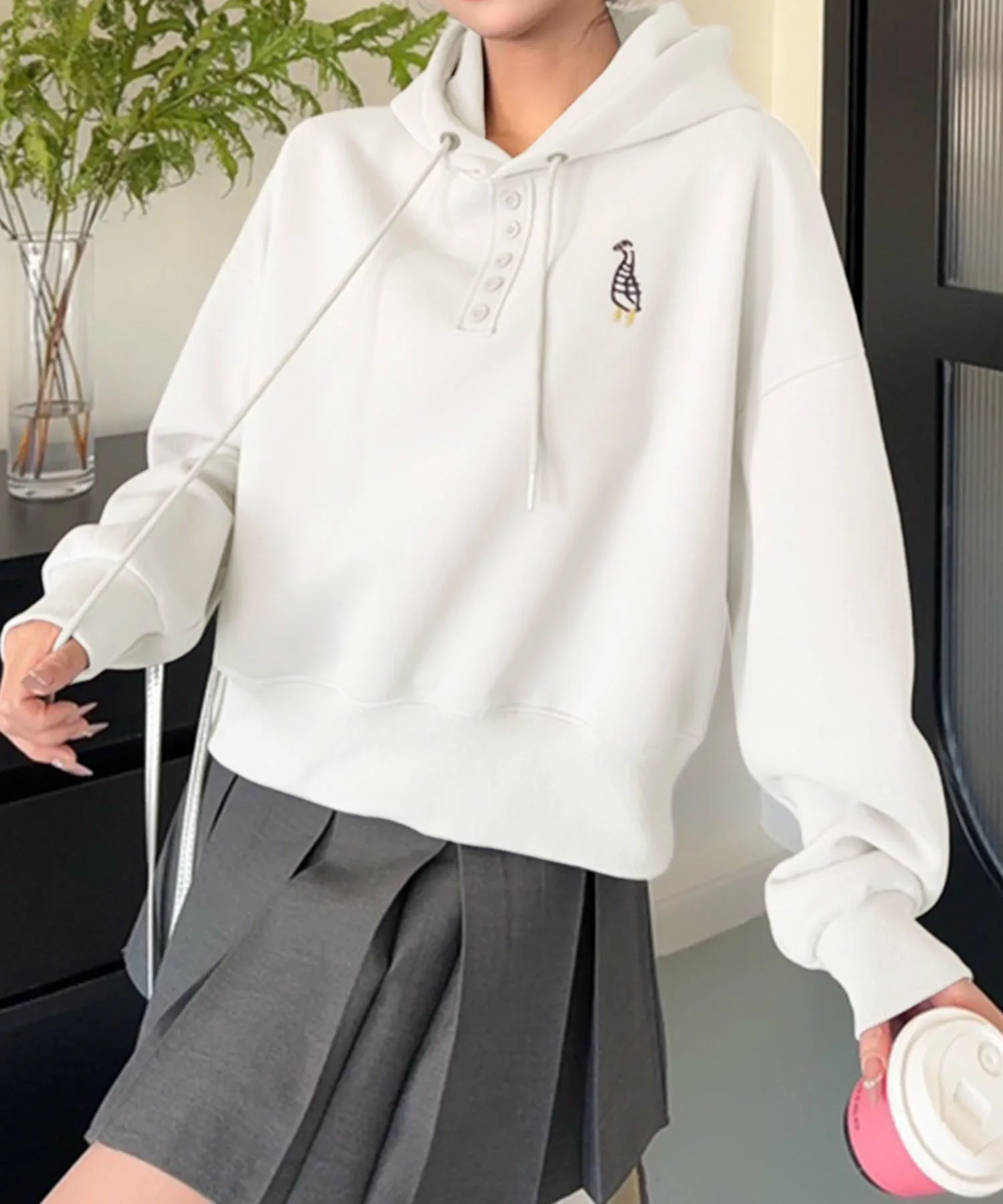 Она украшена небольшим логотипом спереди, имеет регулируемый капюшон на шнурке и свободный силуэт. Это вещь, которую можно носить как с простым, так и с элегантным образом.