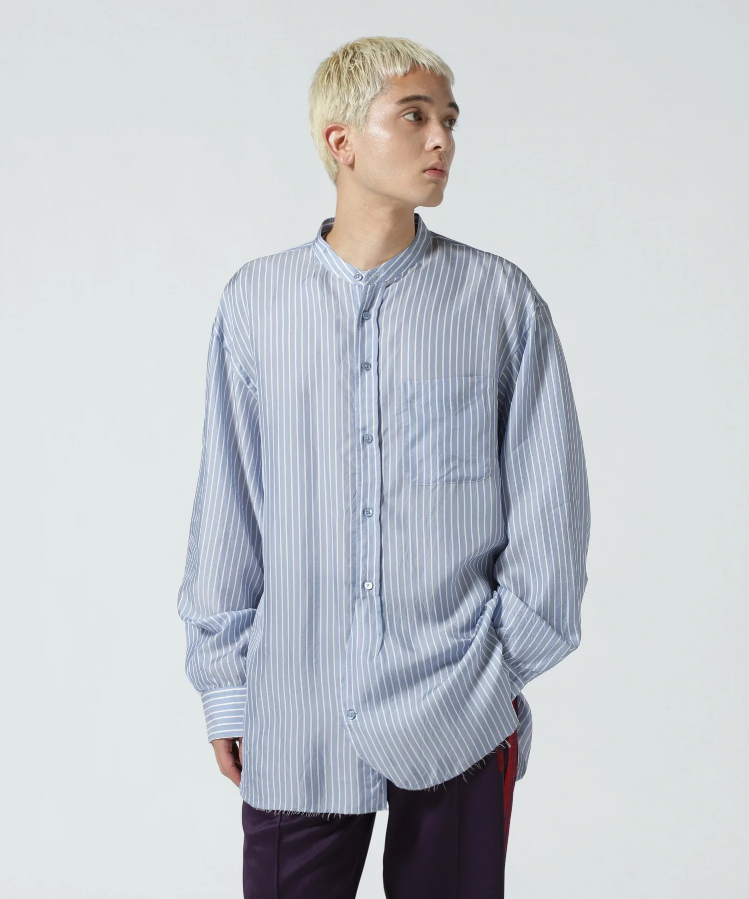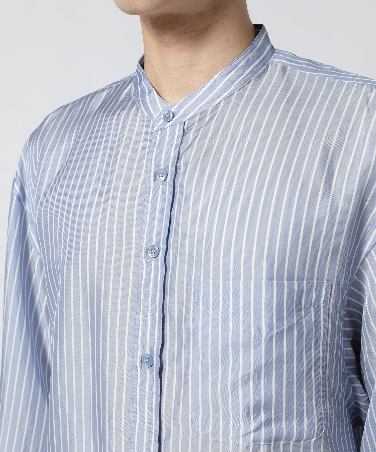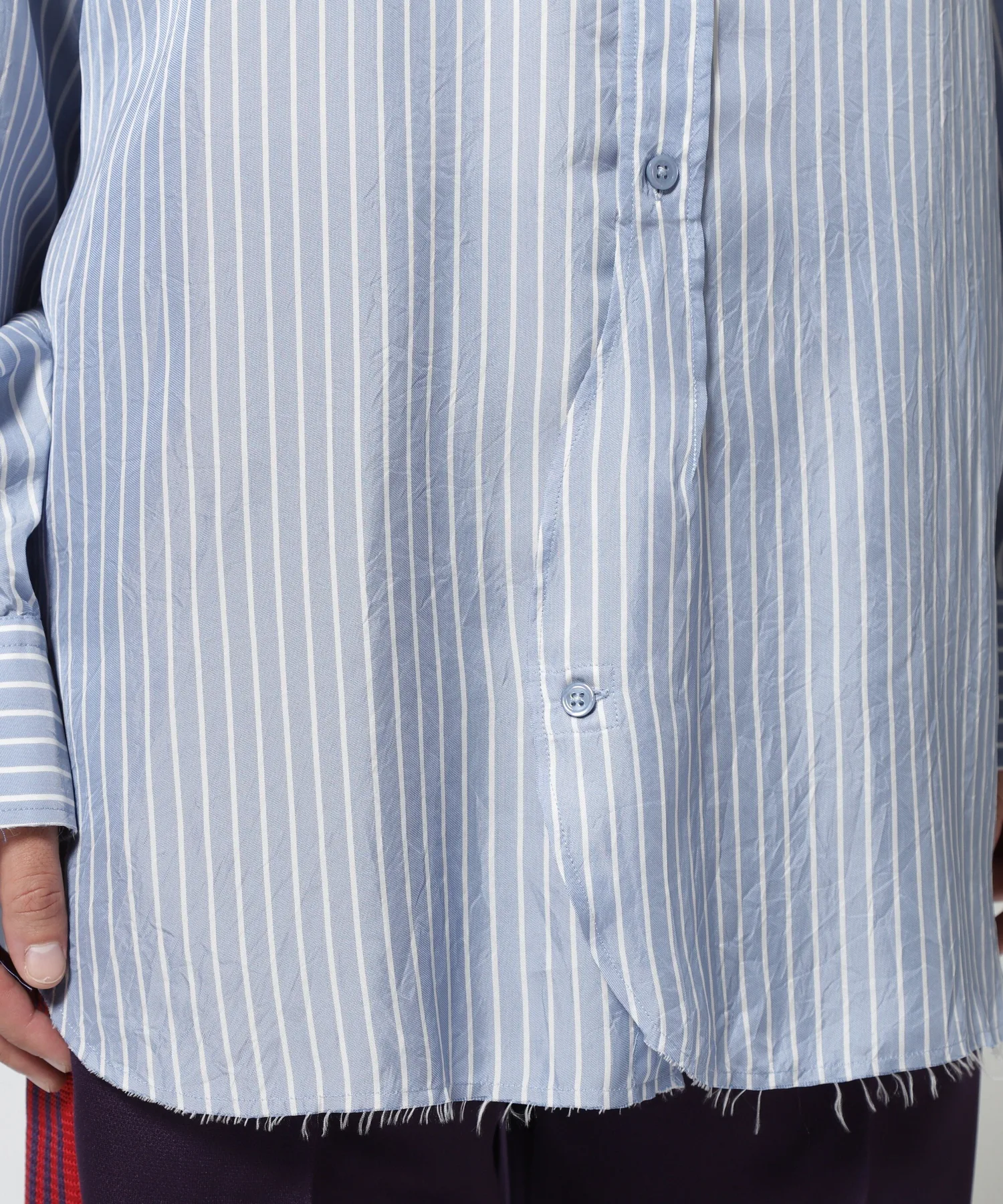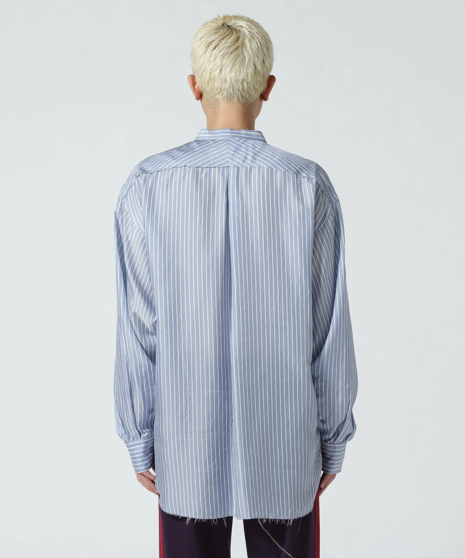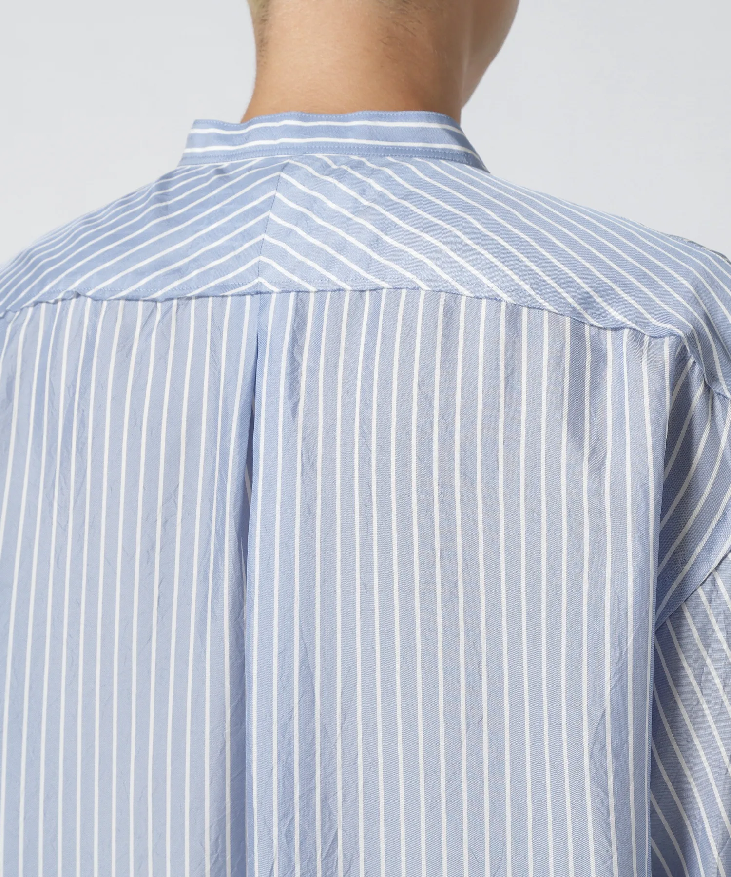 Воротник с окантовкой. Сохраняя классические детали рубашки, такие как кокетка, выполненная по косой, треугольная вставка и складки, задняя кокетка и нижний край выполнены в необработанном виде, что придает изделию современный вид. Планка не доходит до низа, плавно переходя в нижнюю часть ниже шестой пуговицы, чтобы уменьшить жесткость при заправке в брюки. Нижняя петля для пуговицы вывернута набок и усилена тканью, чтобы ее не забыли застегнуть. На манжетах расположены регулируемые пуговицы, а в месте крепления манжеты созданы две складки, образующие свободный, цельный рукав без швов.