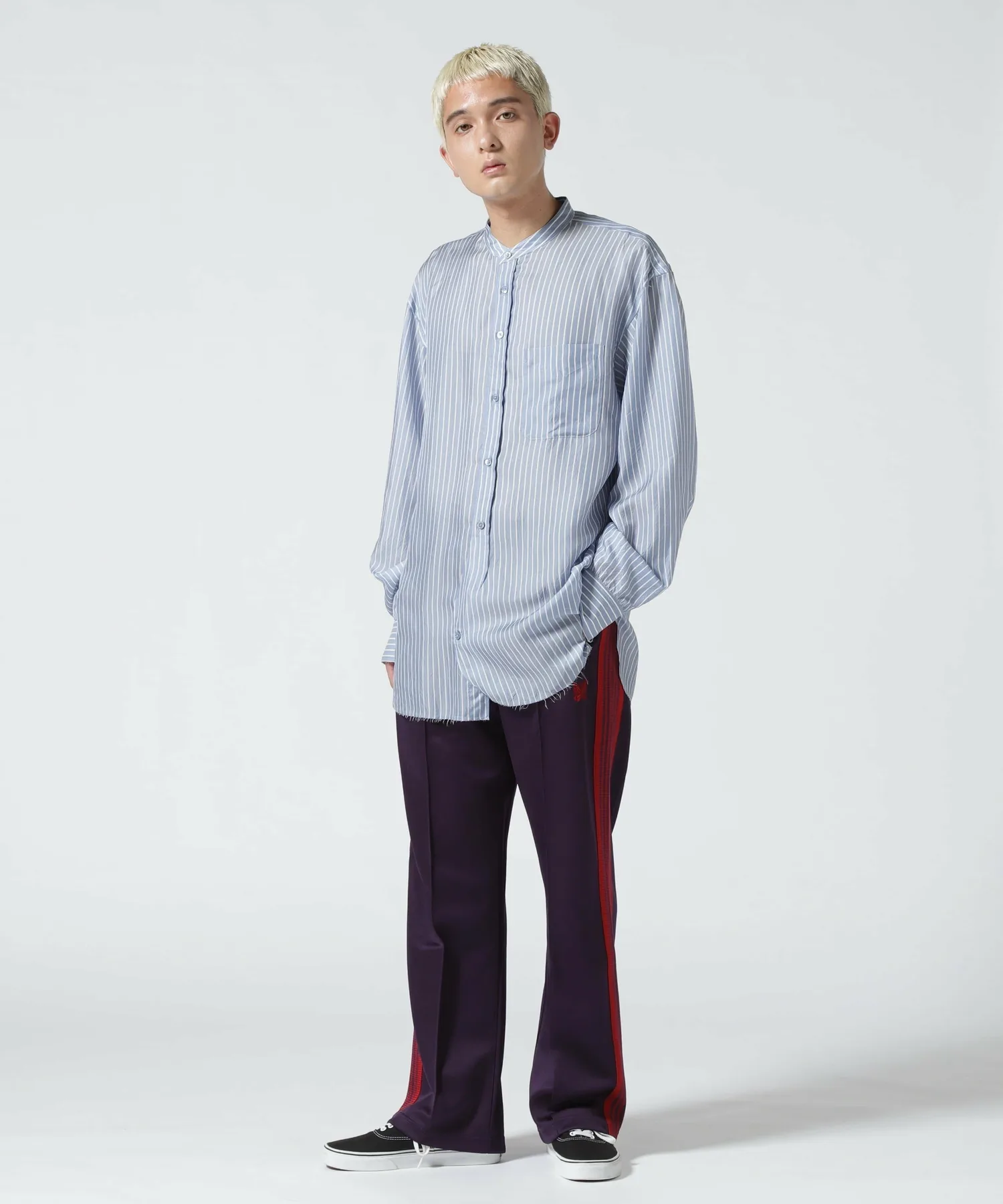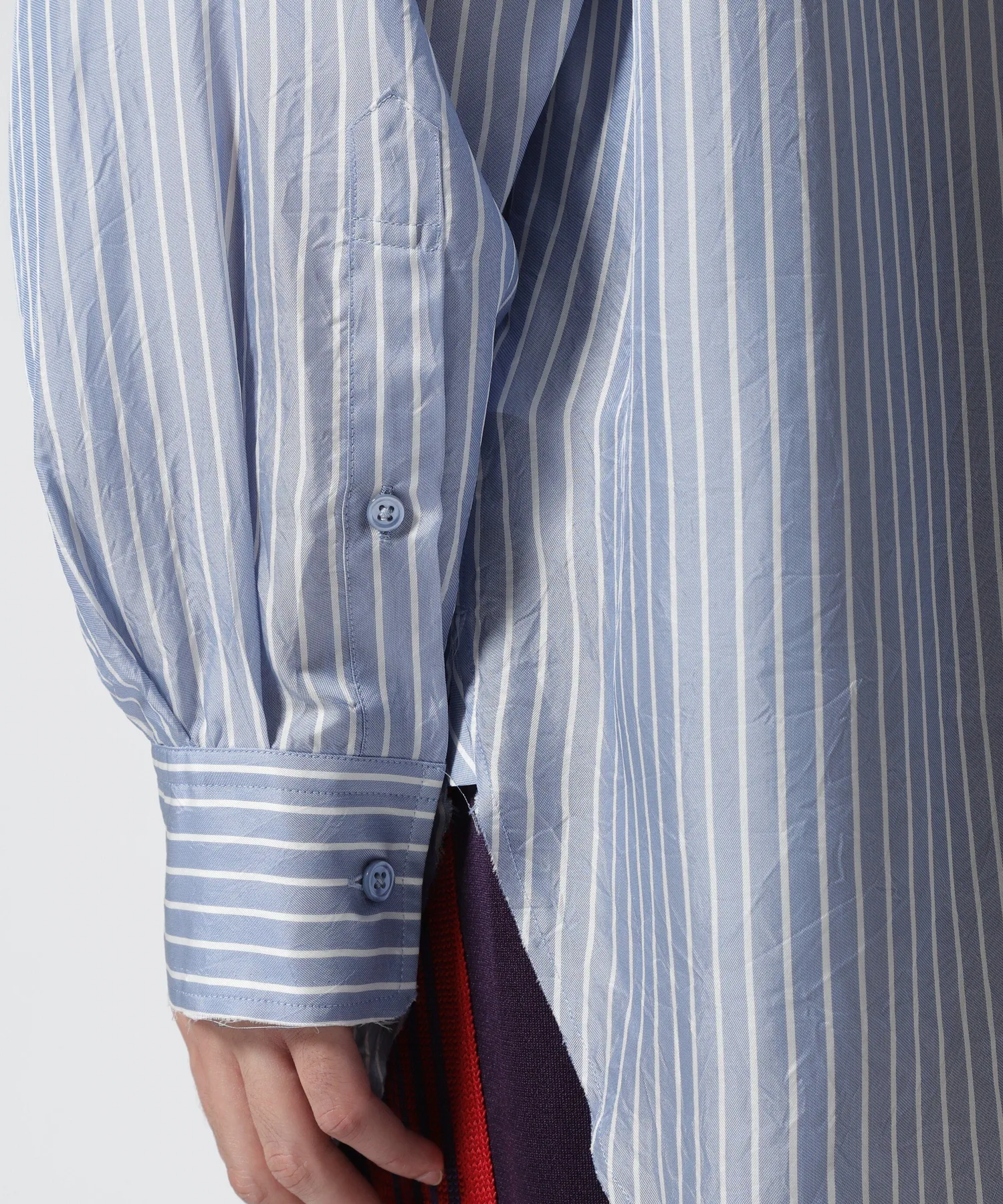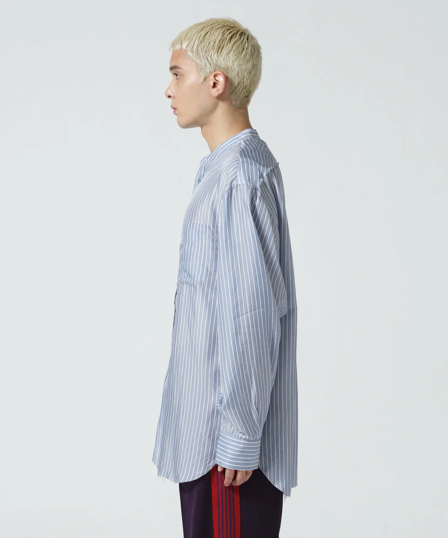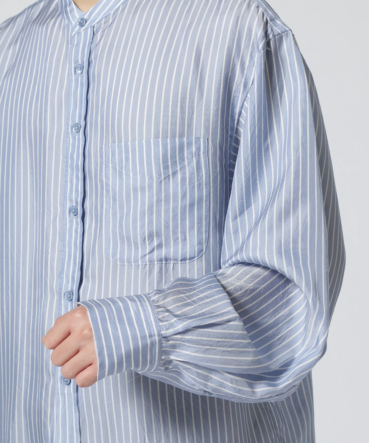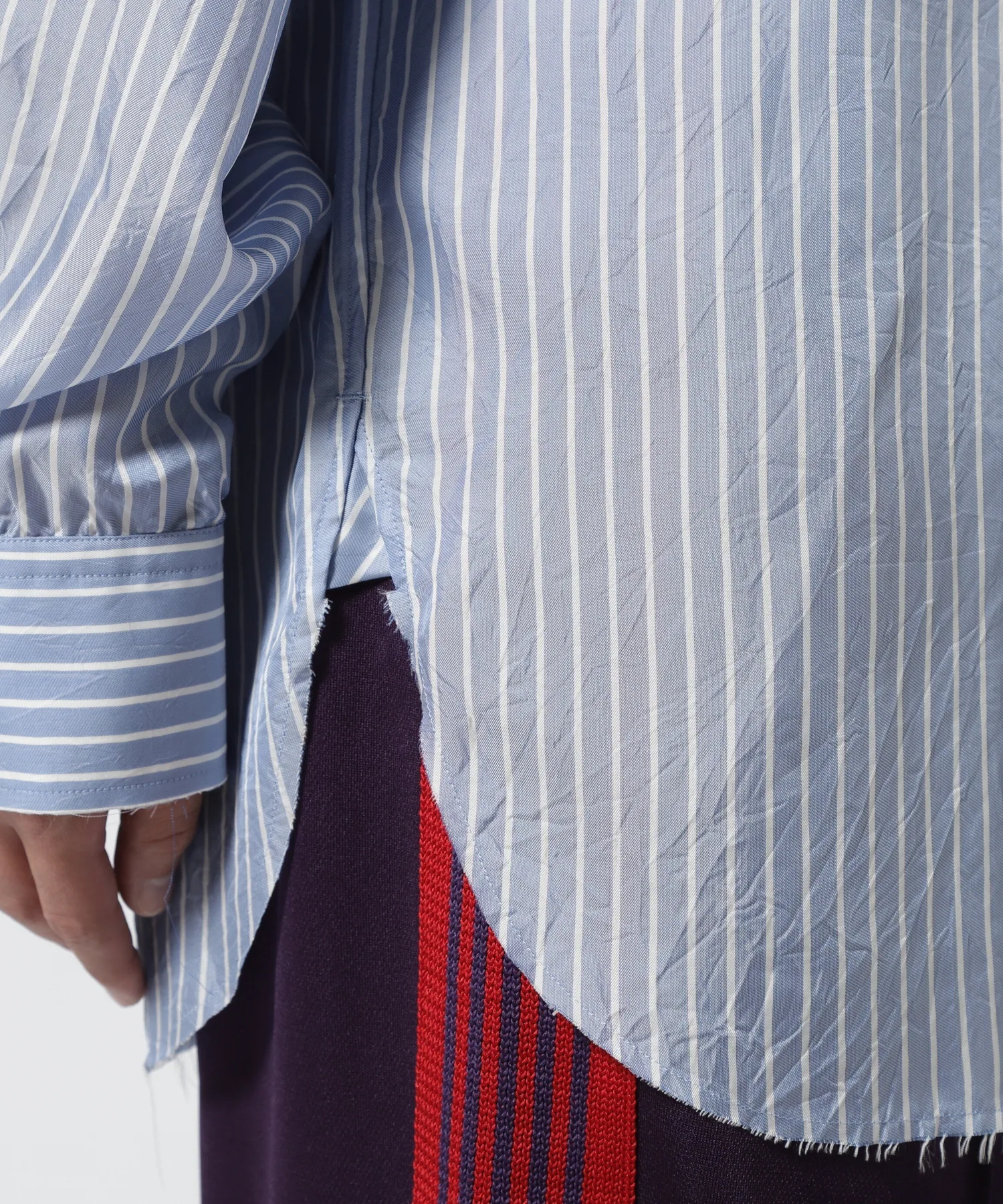 Воротник с окантовкой. Сохраняя классические детали рубашки, такие как кокетка, выполненная по косой, треугольная вставка и складки, задняя кокетка и нижний край выполнены в необработанном виде, что придает изделию современный вид. Планка не доходит до низа, плавно переходя в нижнюю часть ниже шестой пуговицы, чтобы уменьшить жесткость при заправке в брюки. Нижняя петля для пуговицы вывернута набок и усилена тканью, чтобы ее не забыли застегнуть. На манжетах расположены регулируемые пуговицы, а в месте крепления манжеты созданы две складки, образующие свободный, цельный рукав без швов.