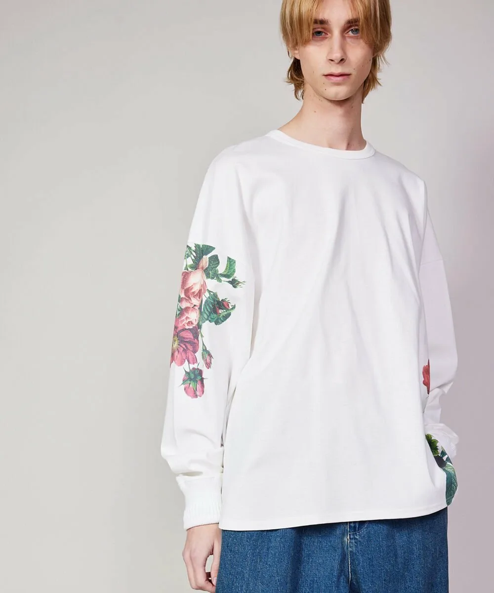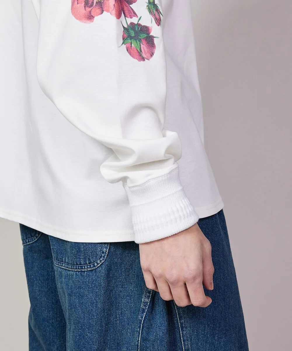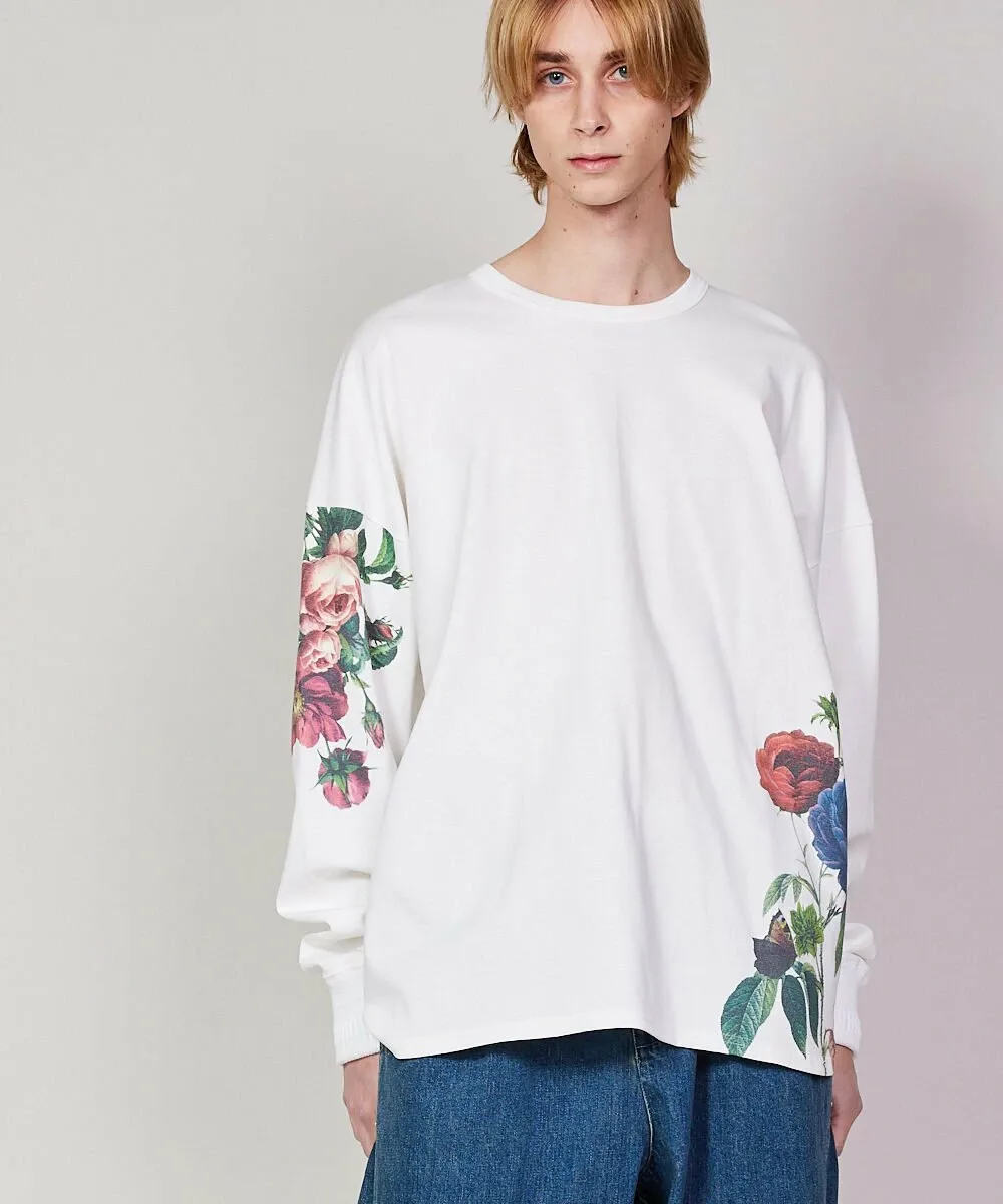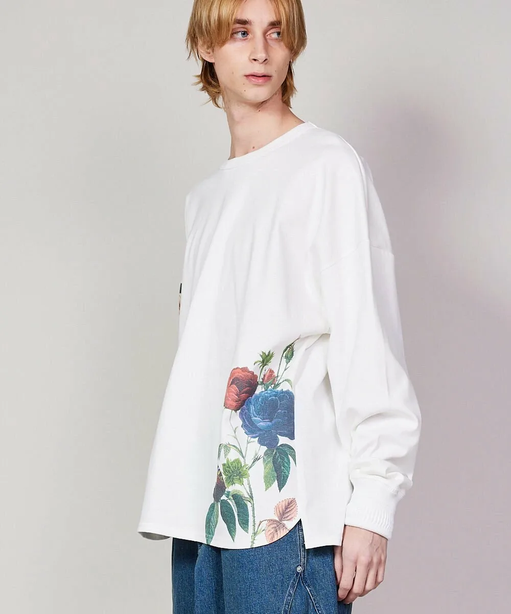 Этот крой и пошив украшен растительным узором, напечатанным на подоле и рукавах, напоминающим винтажные гербарные образцы, а также текстурированным цветочным узором, нарисованным акриловыми красками, что создает визуально привлекательный вид.