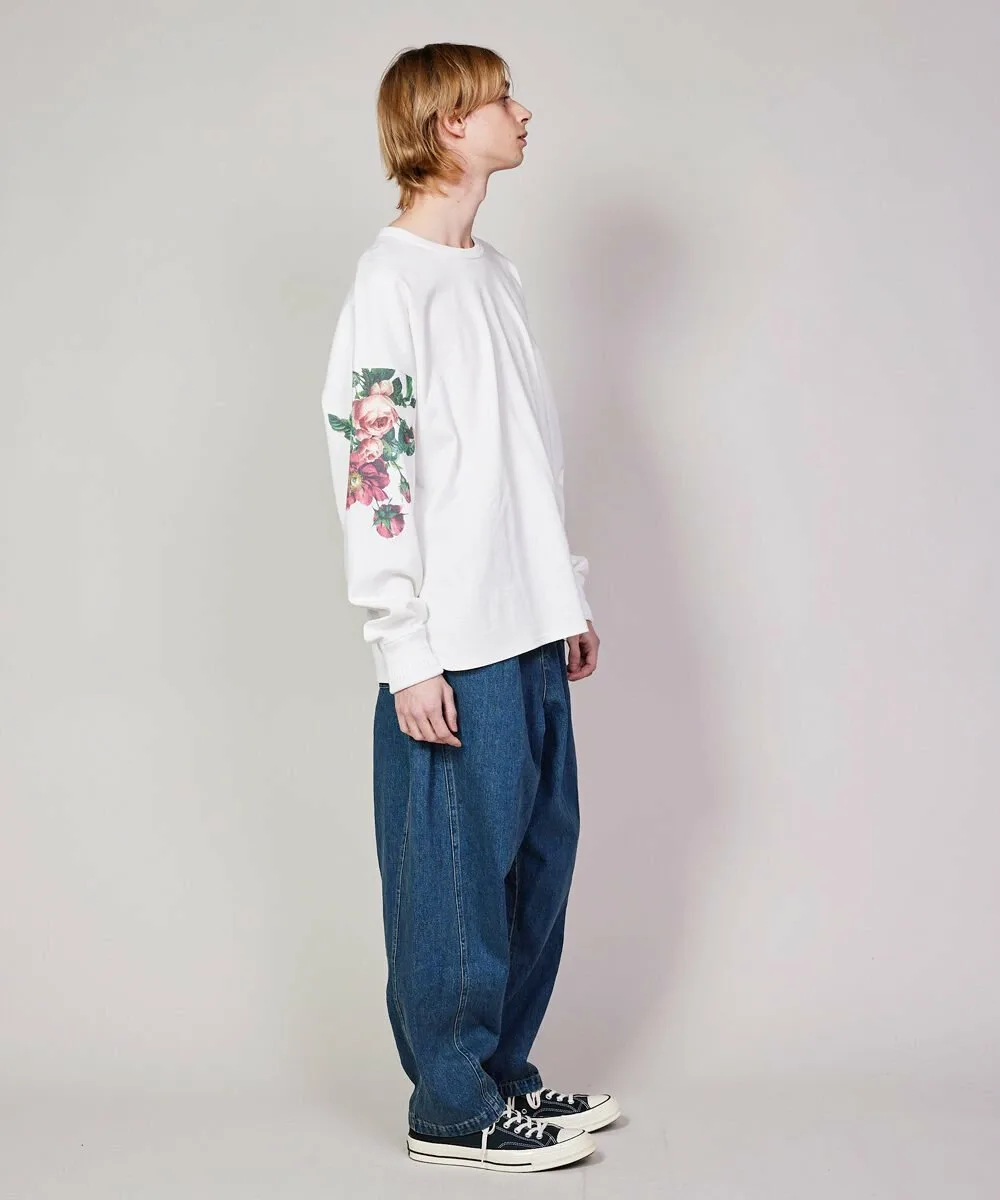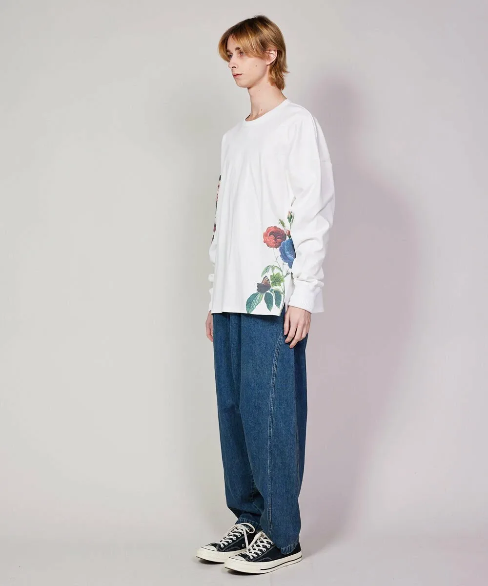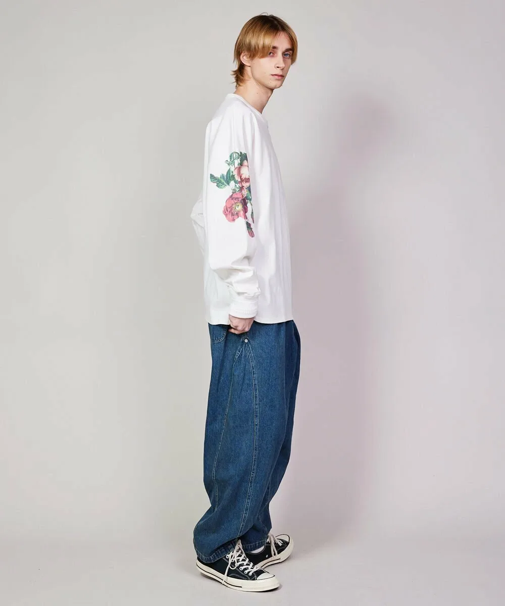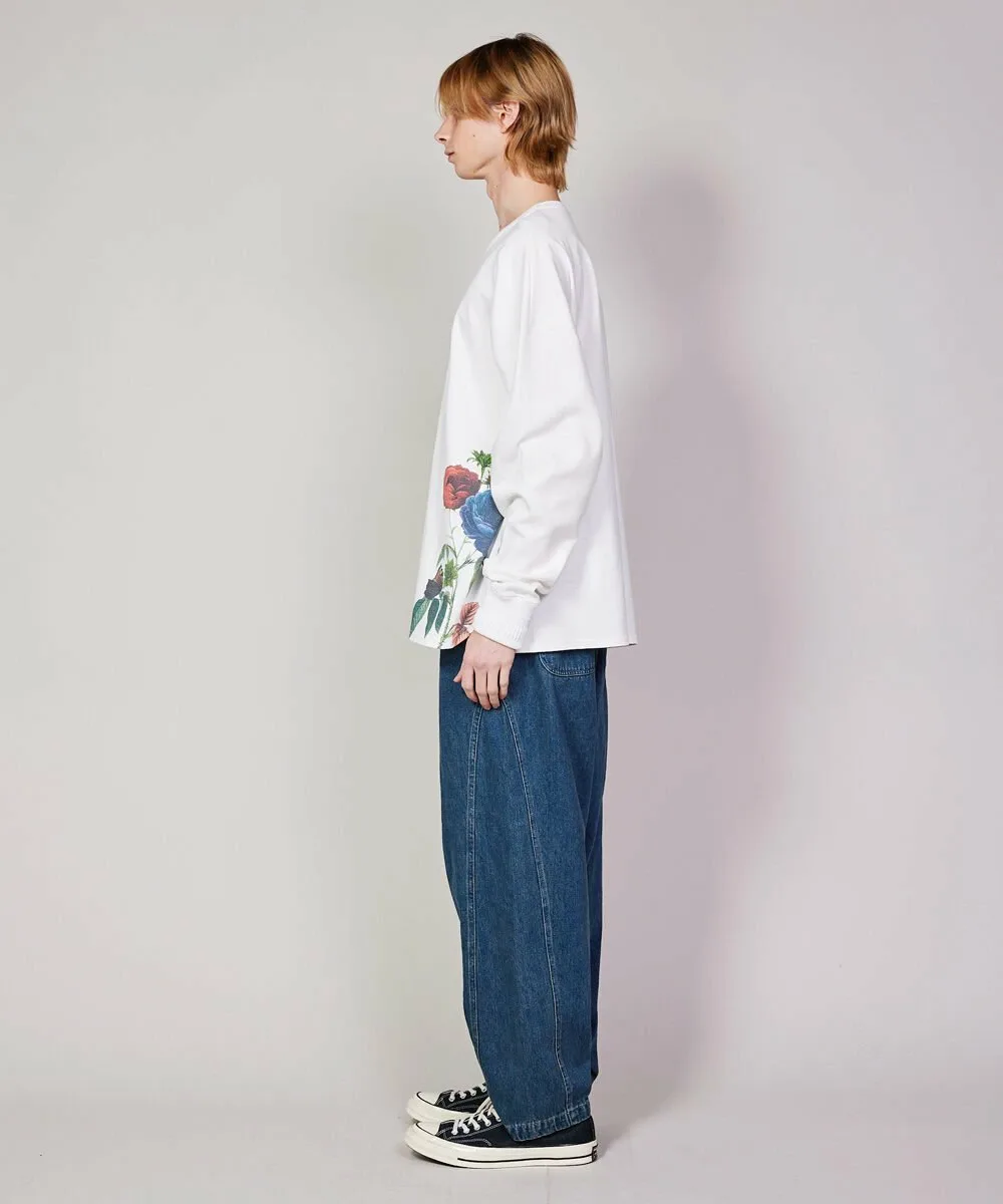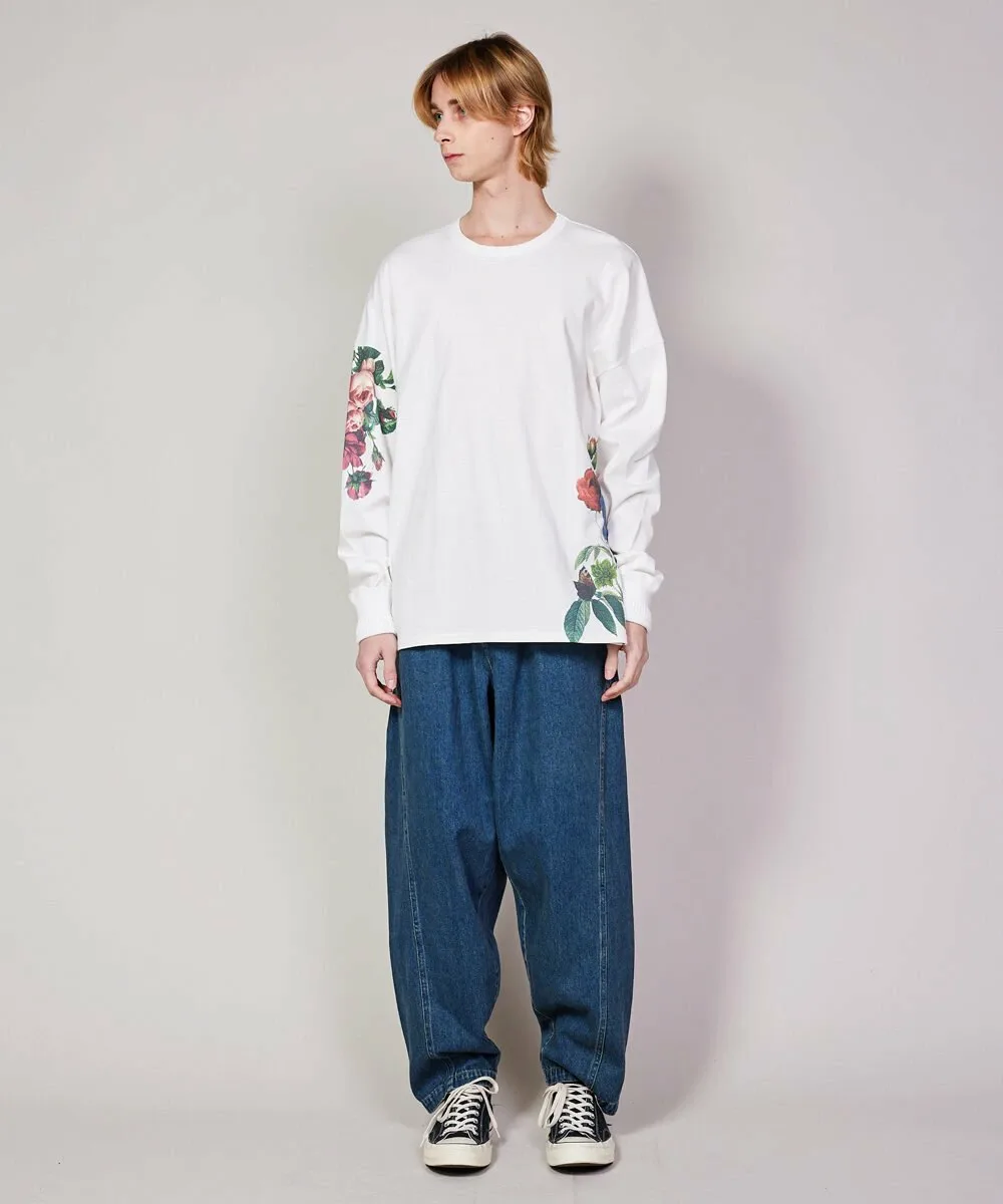 Этот крой и пошив украшен растительным узором, напечатанным на подоле и рукавах, напоминающим винтажные гербарные образцы, а также текстурированным цветочным узором, нарисованным акриловыми красками, что создает визуально привлекательный вид.