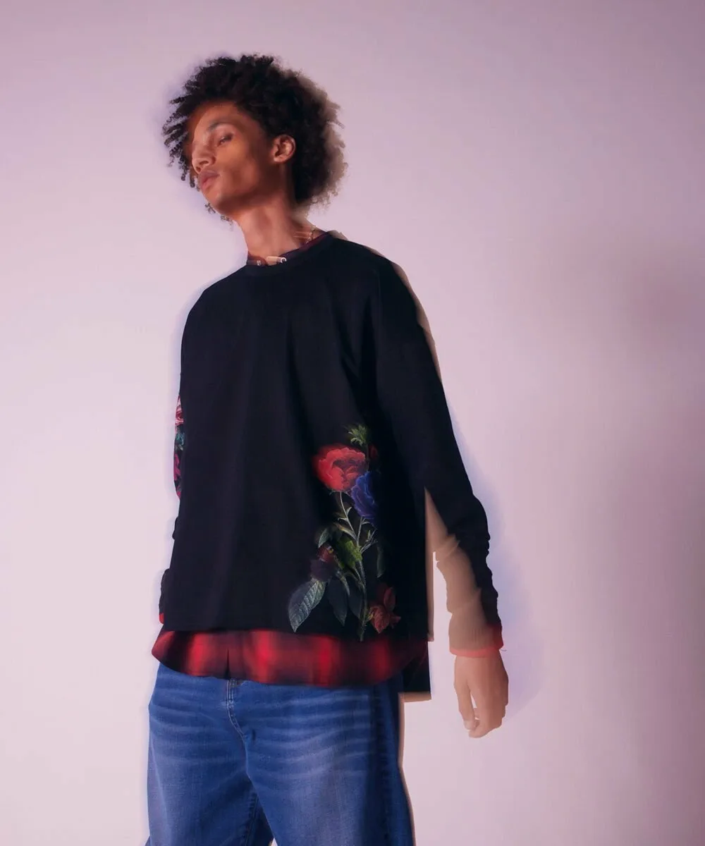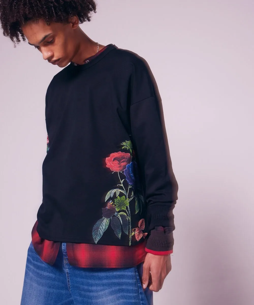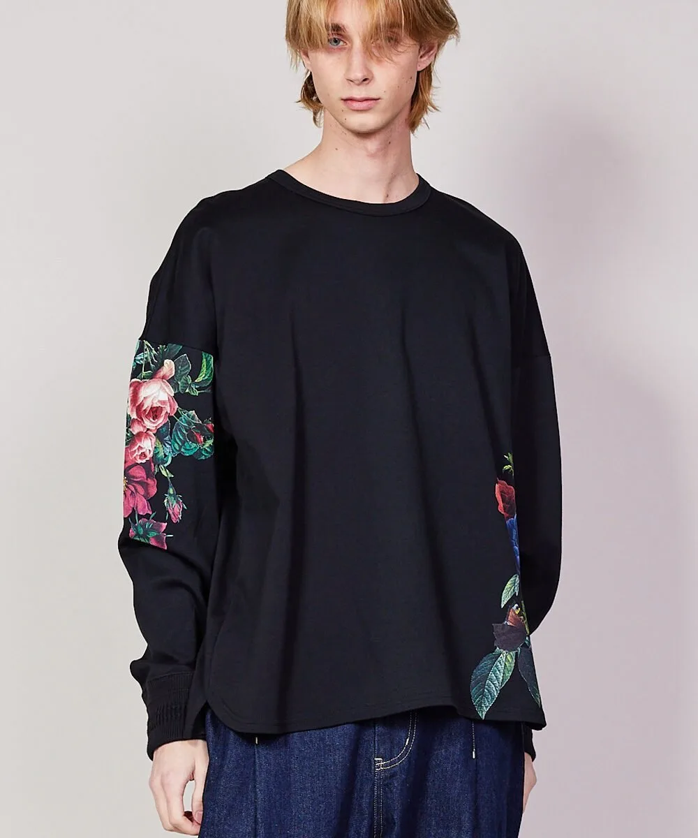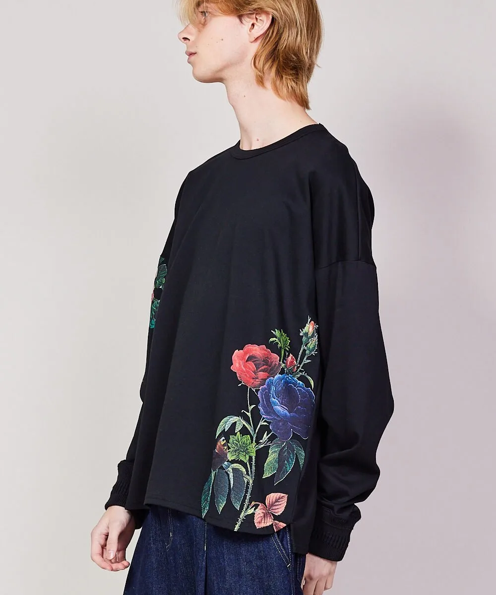 Этот крой и пошив украшен растительным узором, напечатанным на подоле и рукавах, напоминающим винтажные гербарные образцы, а также текстурированным цветочным узором, нарисованным акриловыми красками, что создает визуально привлекательный вид.