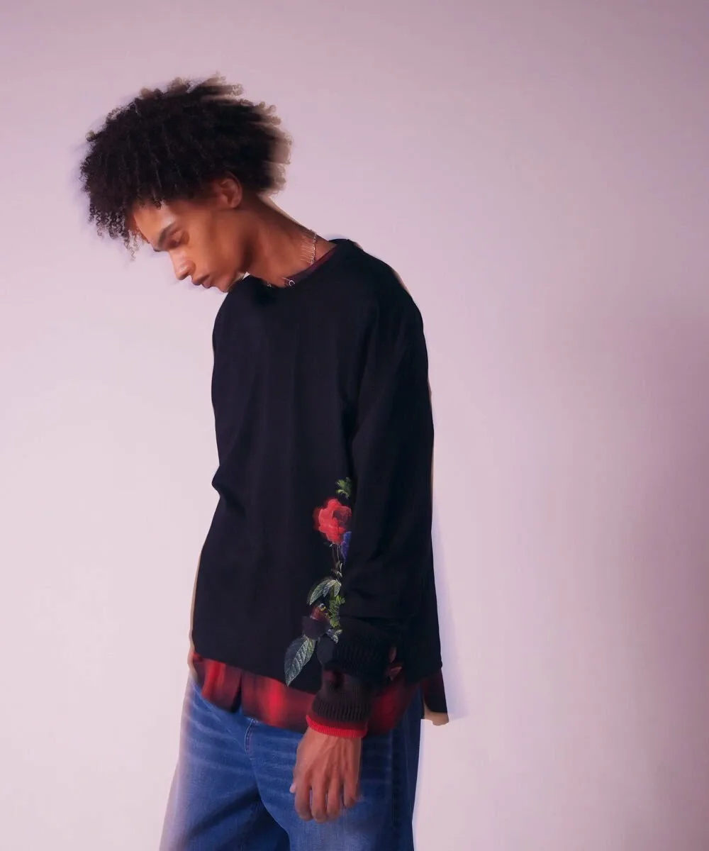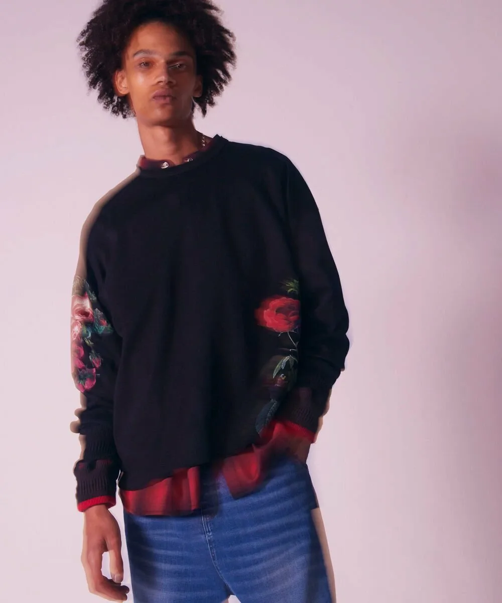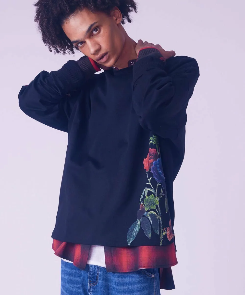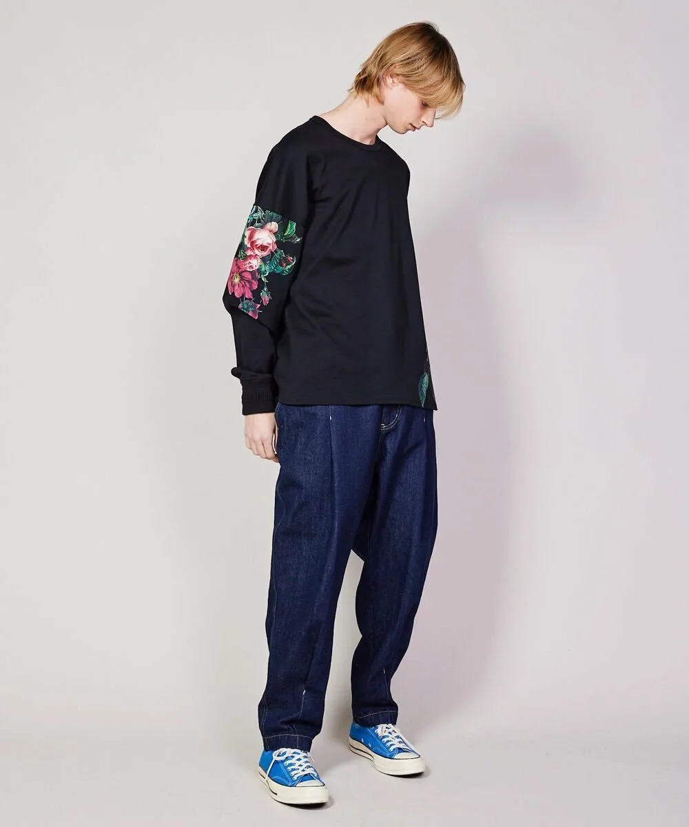 Этот крой и пошив украшен растительным узором, напечатанным на подоле и рукавах, напоминающим винтажные гербарные образцы, а также текстурированным цветочным узором, нарисованным акриловыми красками, что создает визуально привлекательный вид.