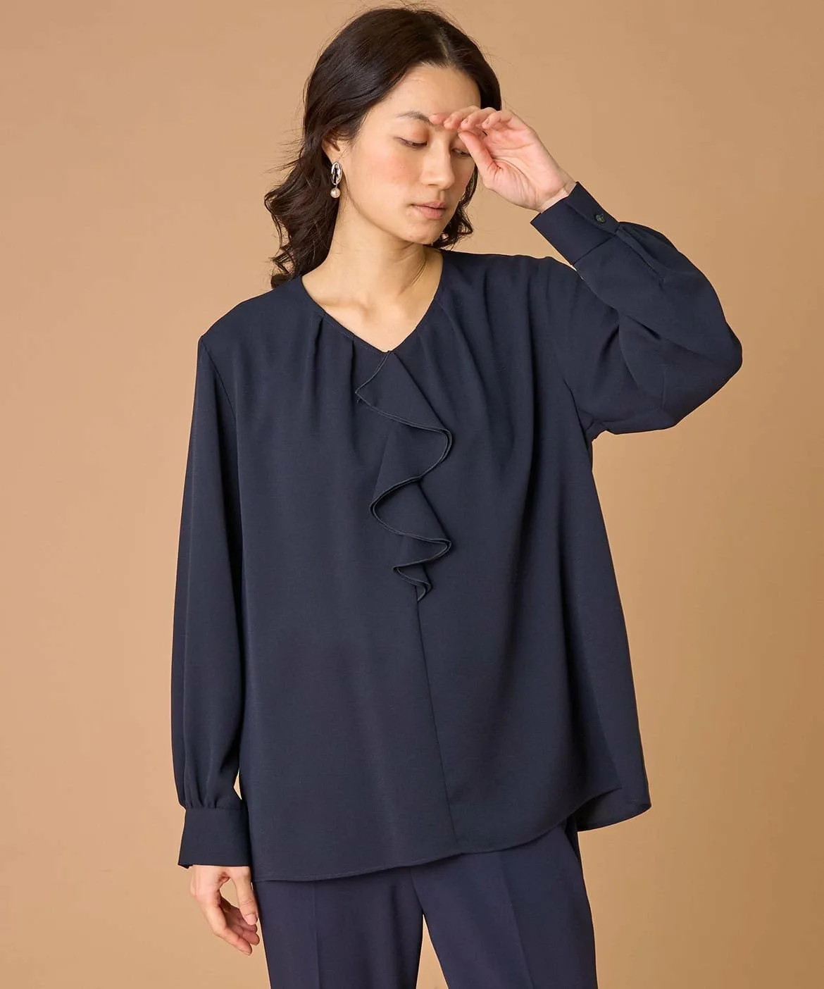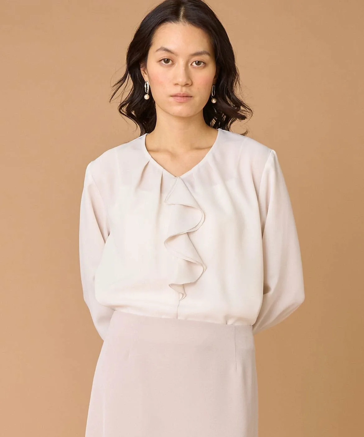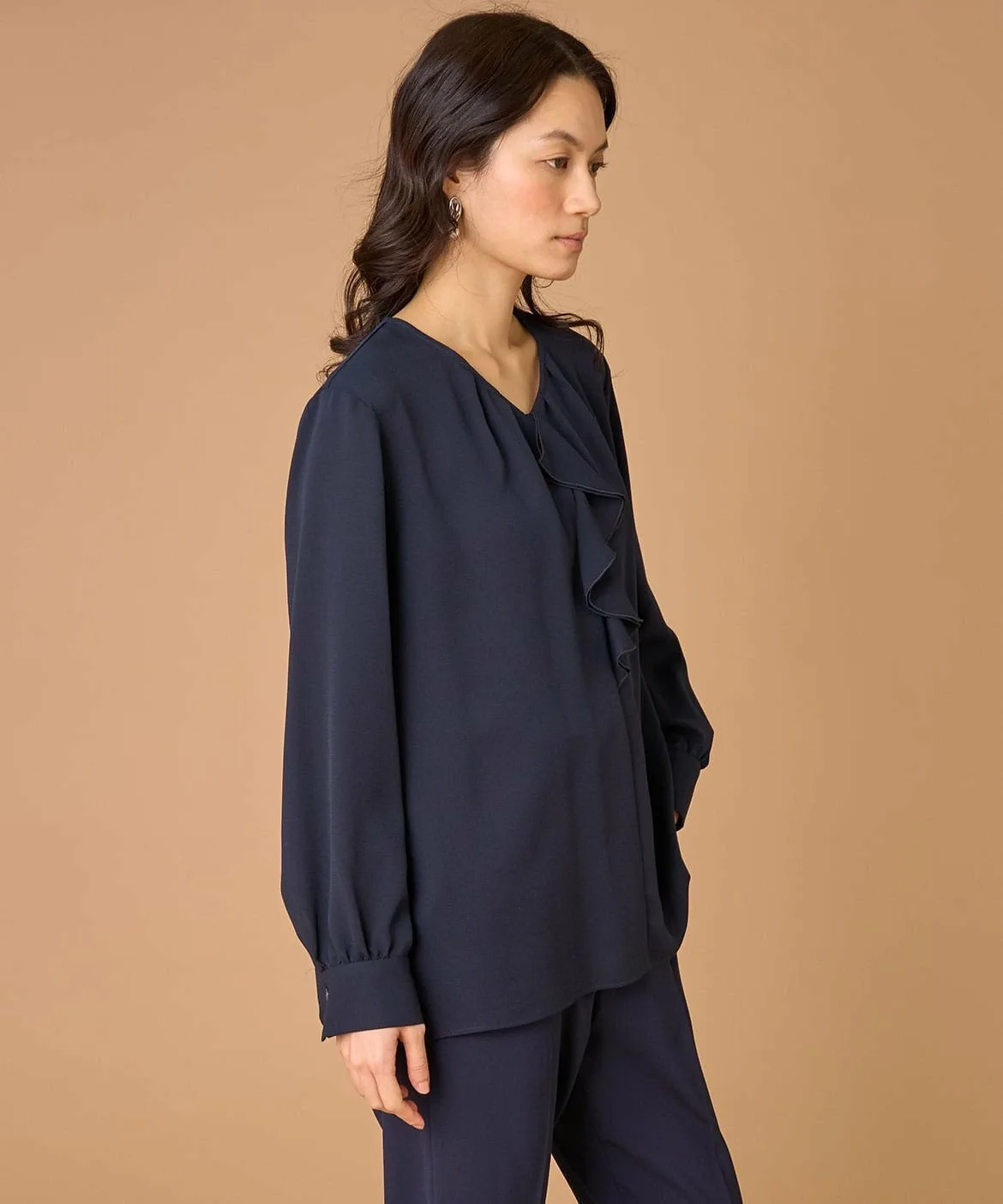 Эта блузка украшена великолепными оборками с защипами на вырезе. Четкий силуэт и V-образный вырез создают утонченный и непринужденный образ. В заправленном виде оборки не свисают с талии, создавая эффектный и лаконичный вид. Эту блузку можно носить как основной топ или под жакет, что делает ее универсальной вещью, которую можно носить круглый год.