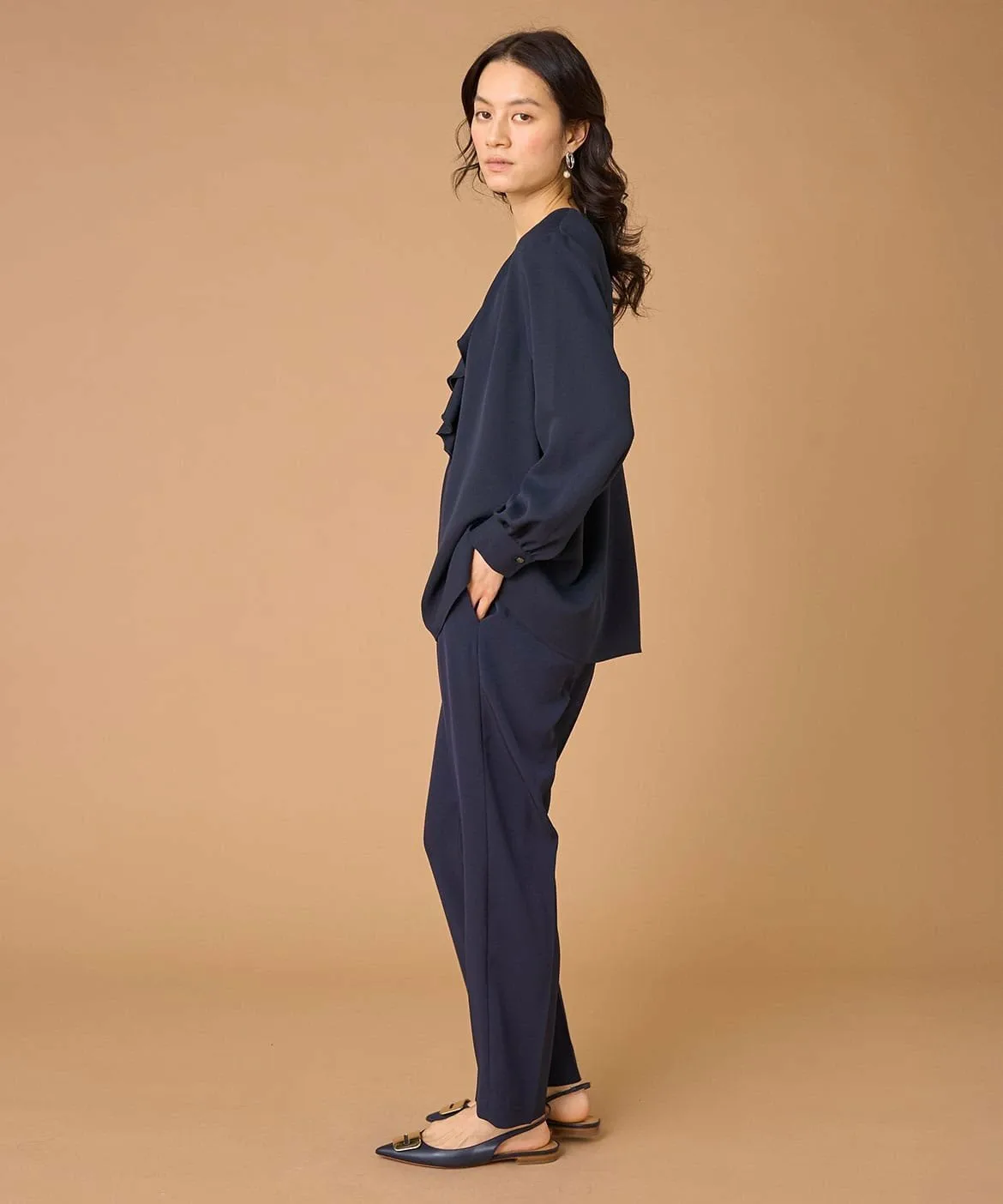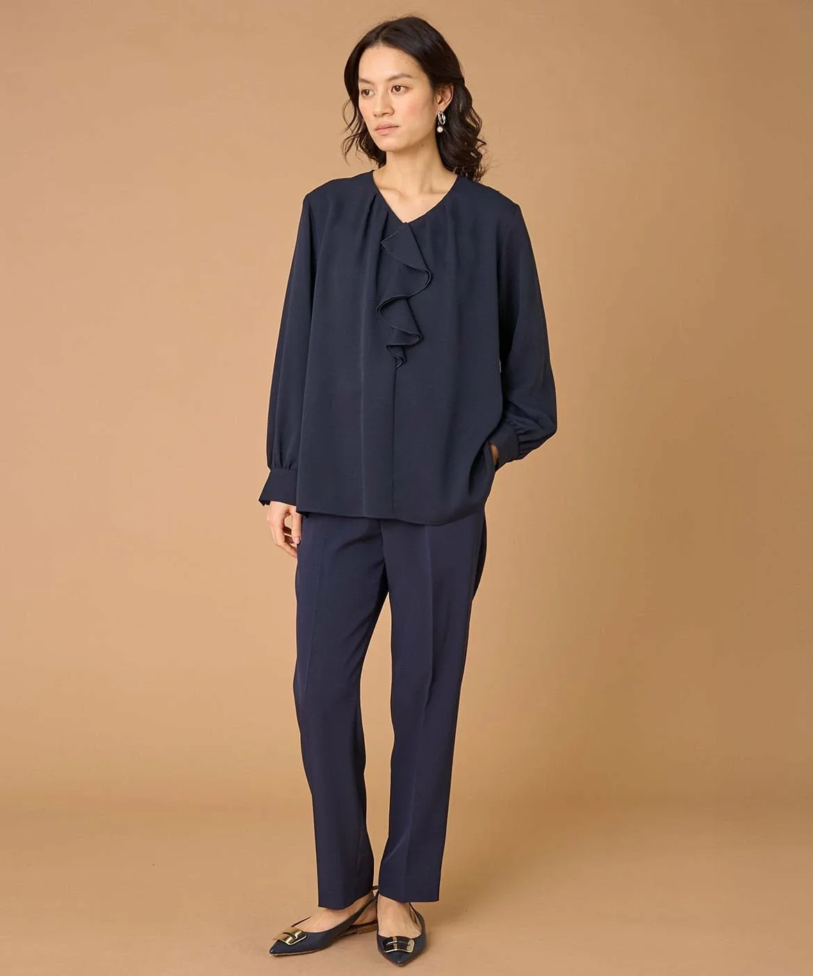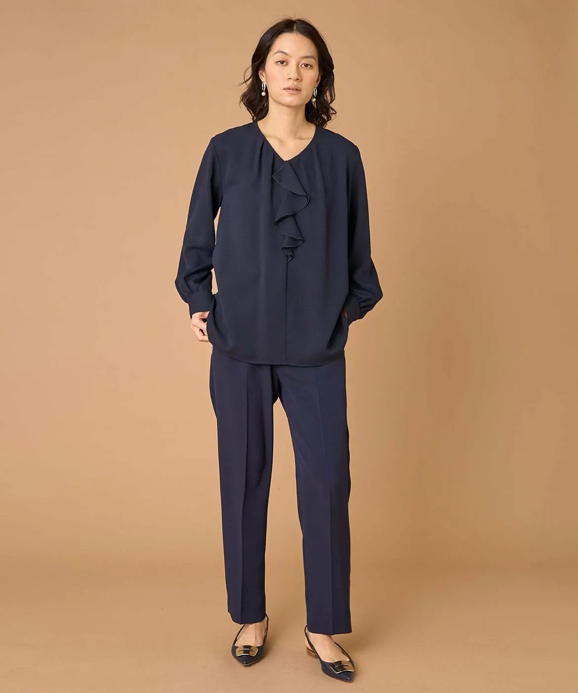 Эта блузка украшена великолепными оборками с защипами на вырезе. Четкий силуэт и V-образный вырез создают утонченный и непринужденный образ. В заправленном виде оборки не свисают с талии, создавая эффектный и лаконичный вид. Эту блузку можно носить как основной топ или под жакет, что делает ее универсальной вещью, которую можно носить круглый год.