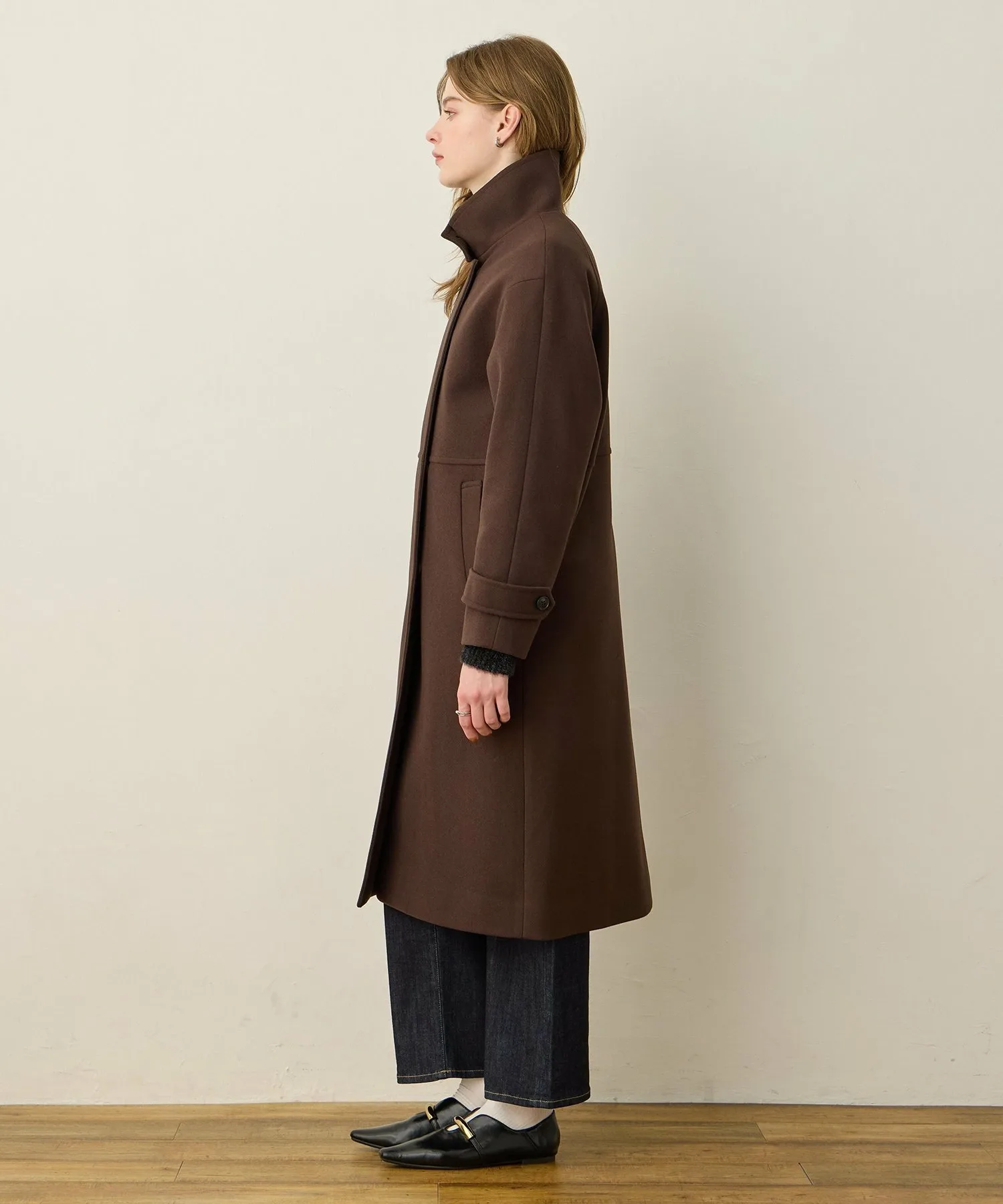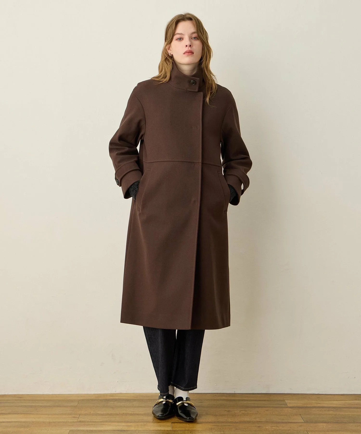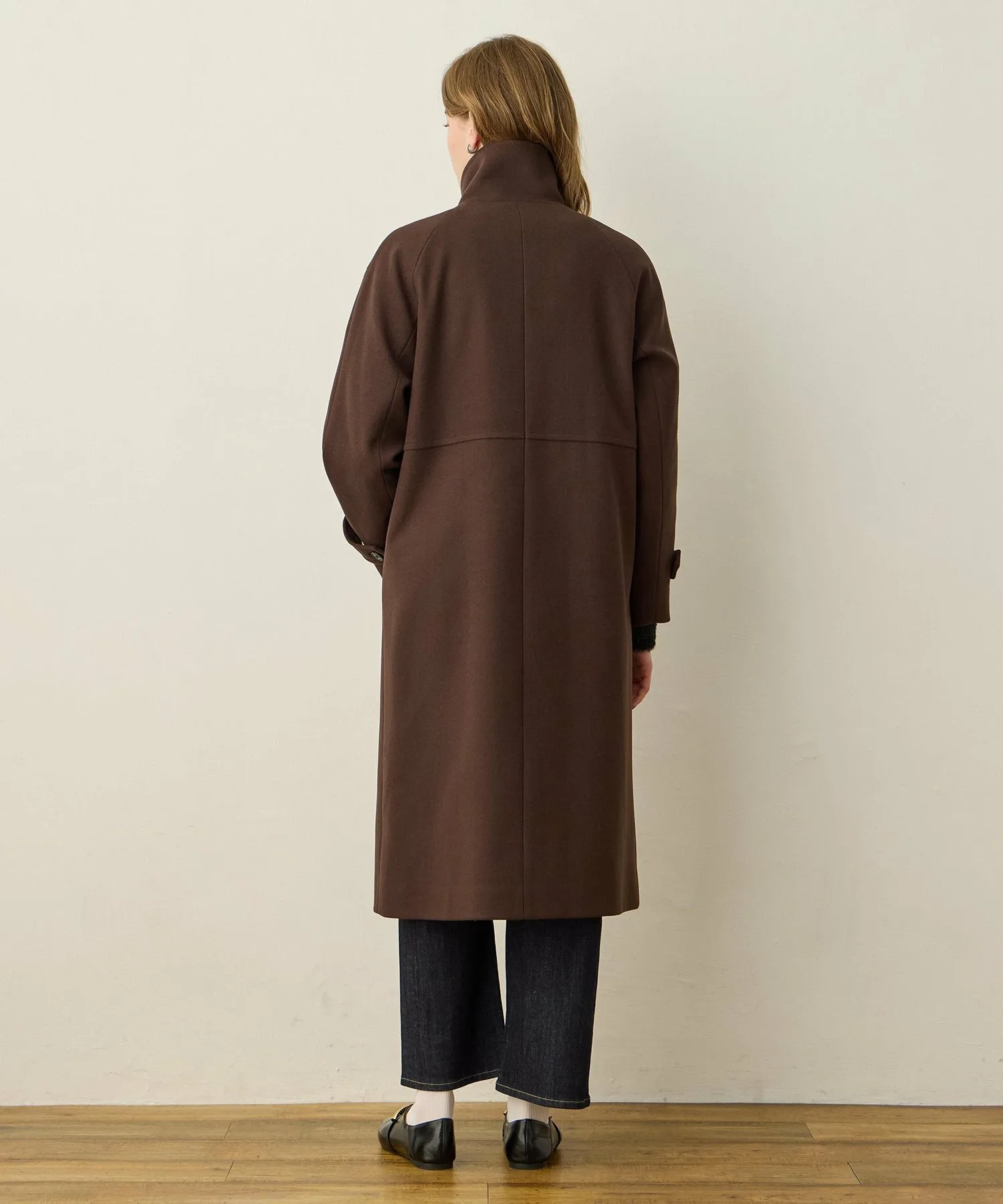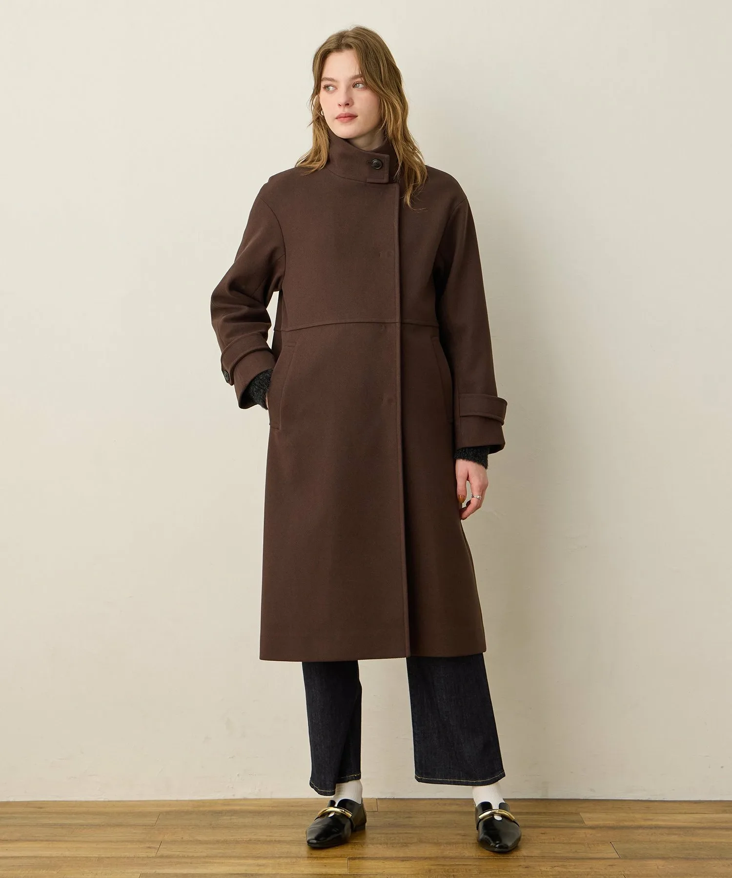 Элегантное длинное пальто-стойка с достойным внешним видом
