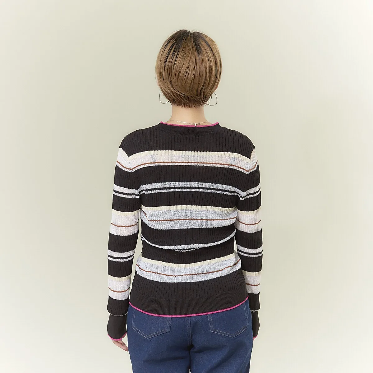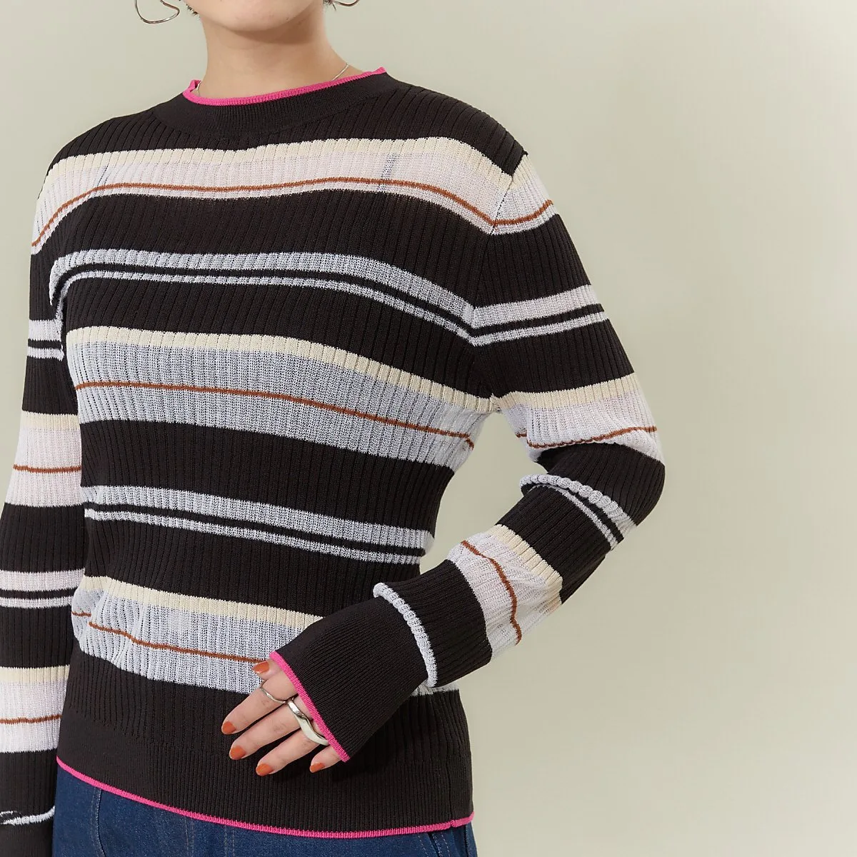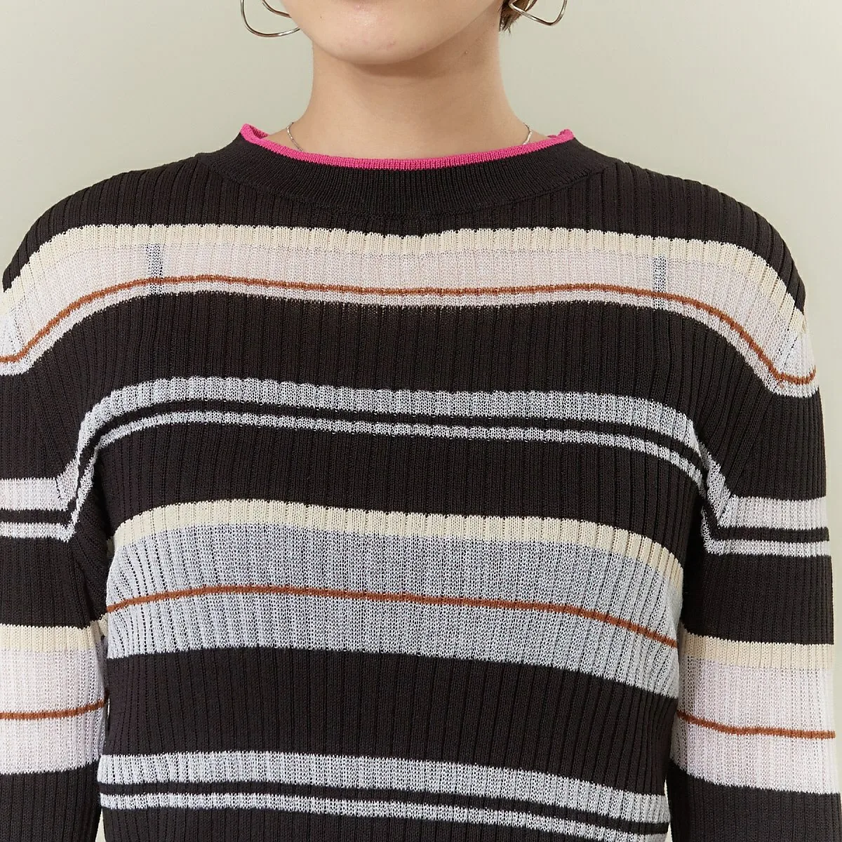Полосатый трикотаж с совершенно оригинальным узором NOMINE, сочетающий в себе прозрачные и непрозрачные нити с каймой.