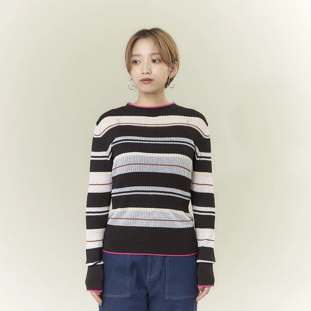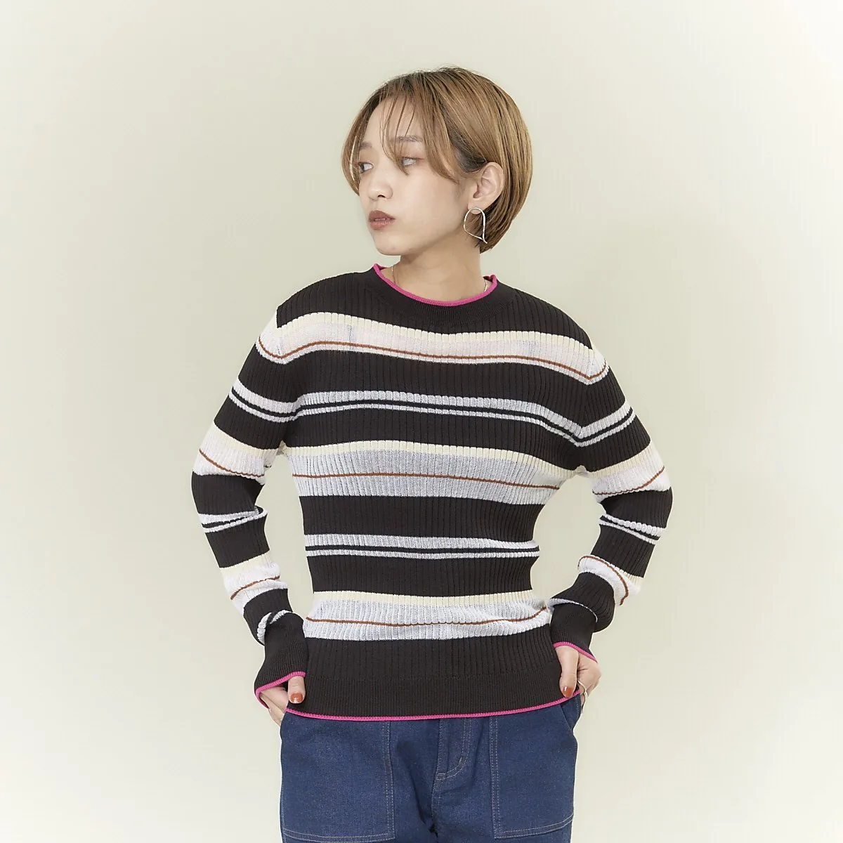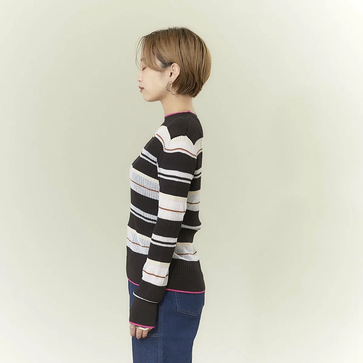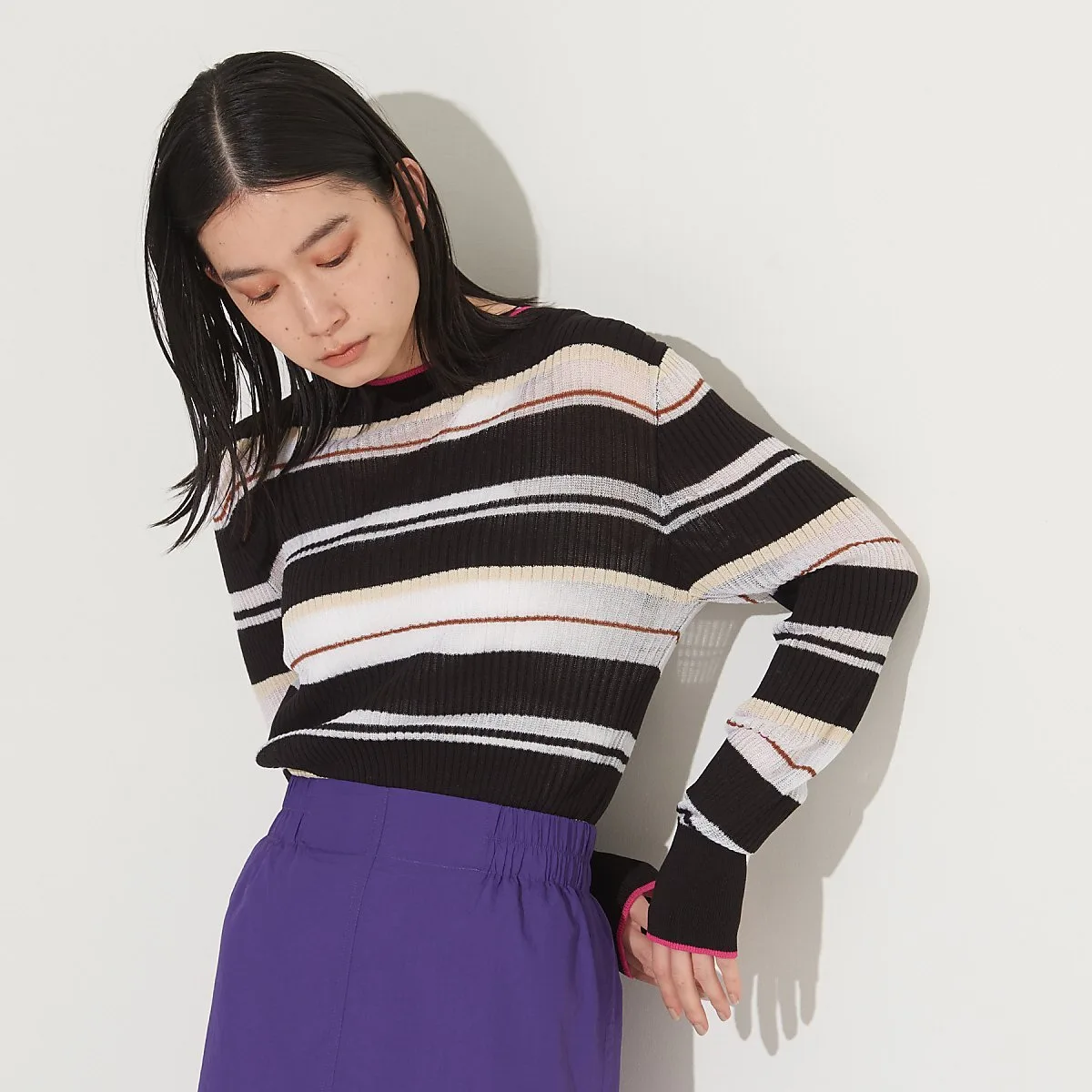Полосатый трикотаж с совершенно оригинальным узором NOMINE, сочетающий в себе прозрачные и непрозрачные нити с каймой.