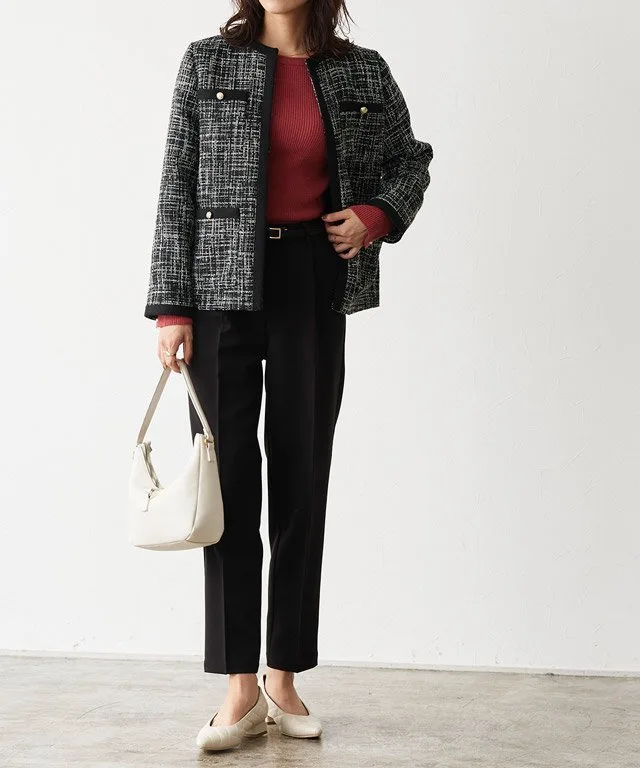 Гладкий материал со стежкой добавляет стильный акцент, а черный твид придает образу солидность и соответствует сезонному настроению.