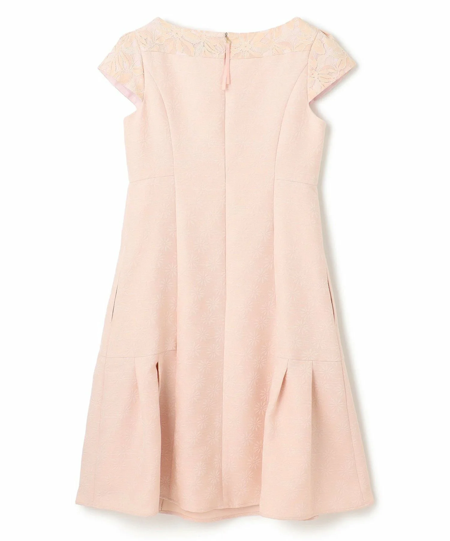Это платье выглядит изысканно, сочетая кружево с жаккардовой тканью, сотканной с культовым цветком ромашки TOCCA. Высокая талия также выгодно подчеркивает фигуру.