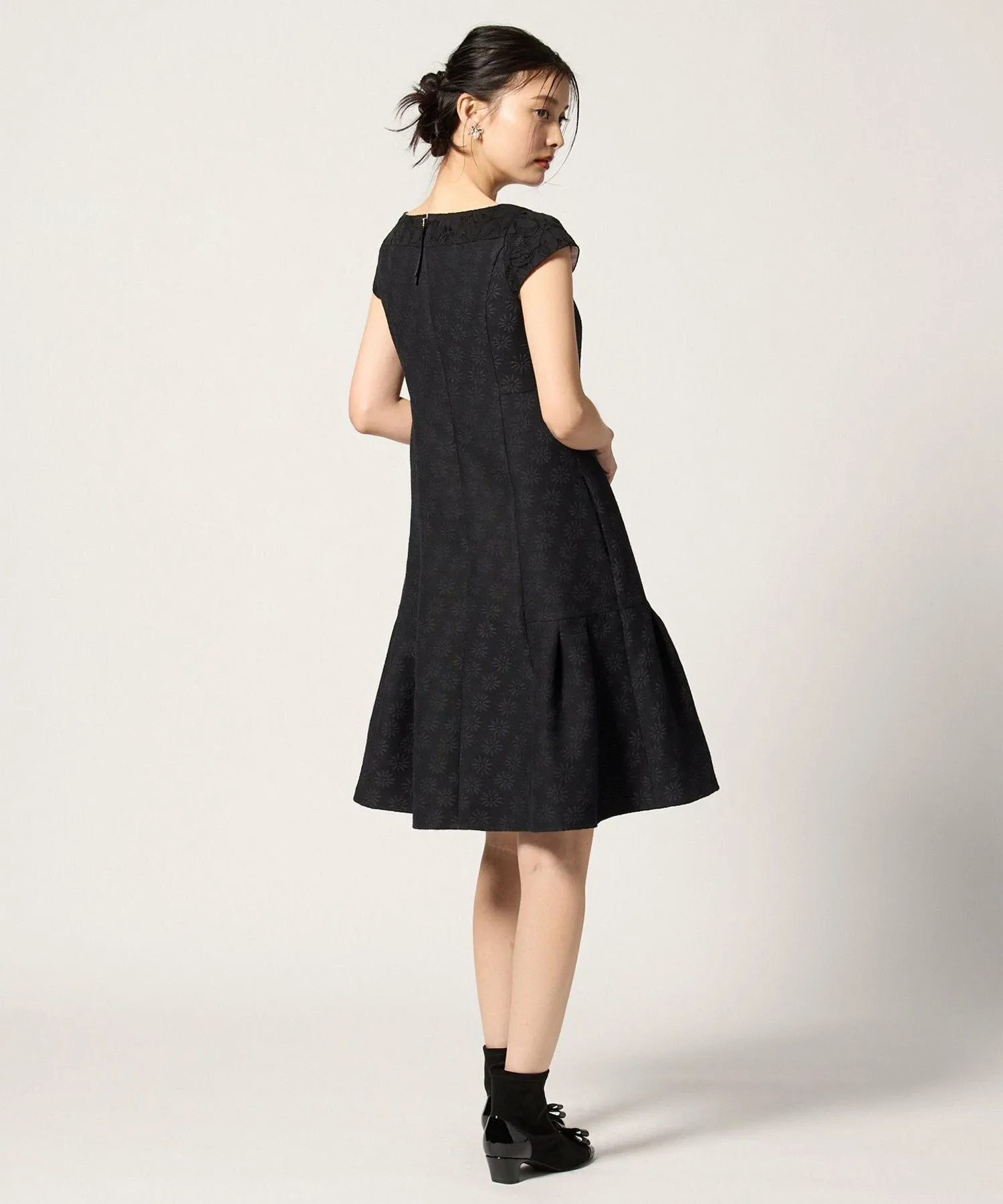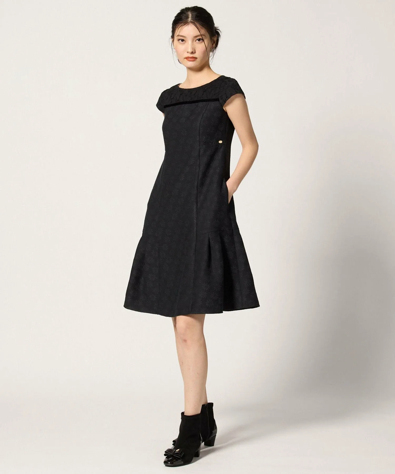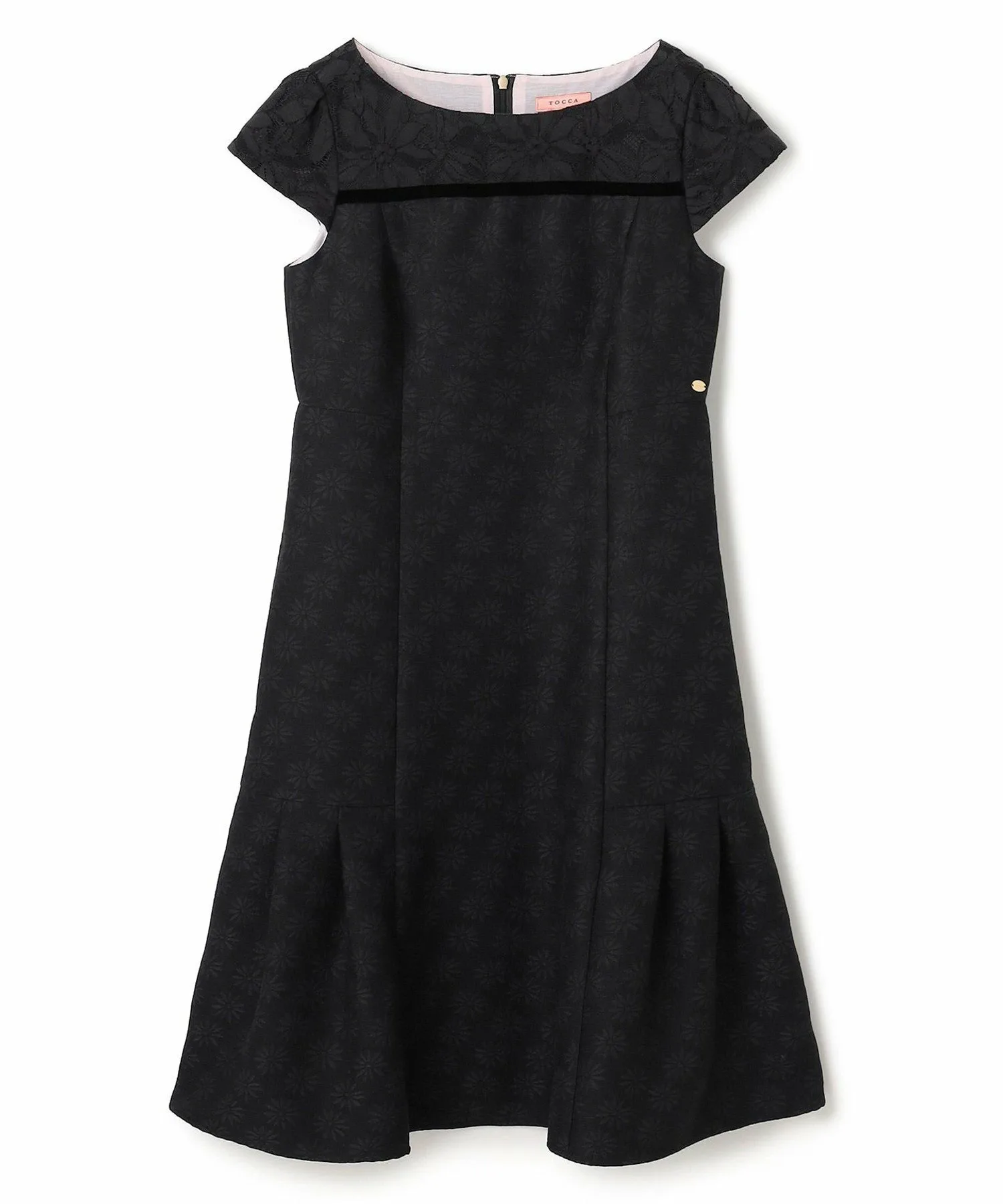 Это платье выглядит изысканно, сочетая кружево с жаккардовой тканью, сотканной с культовым цветком ромашки TOCCA. Высокая талия также выгодно подчеркивает фигуру.
