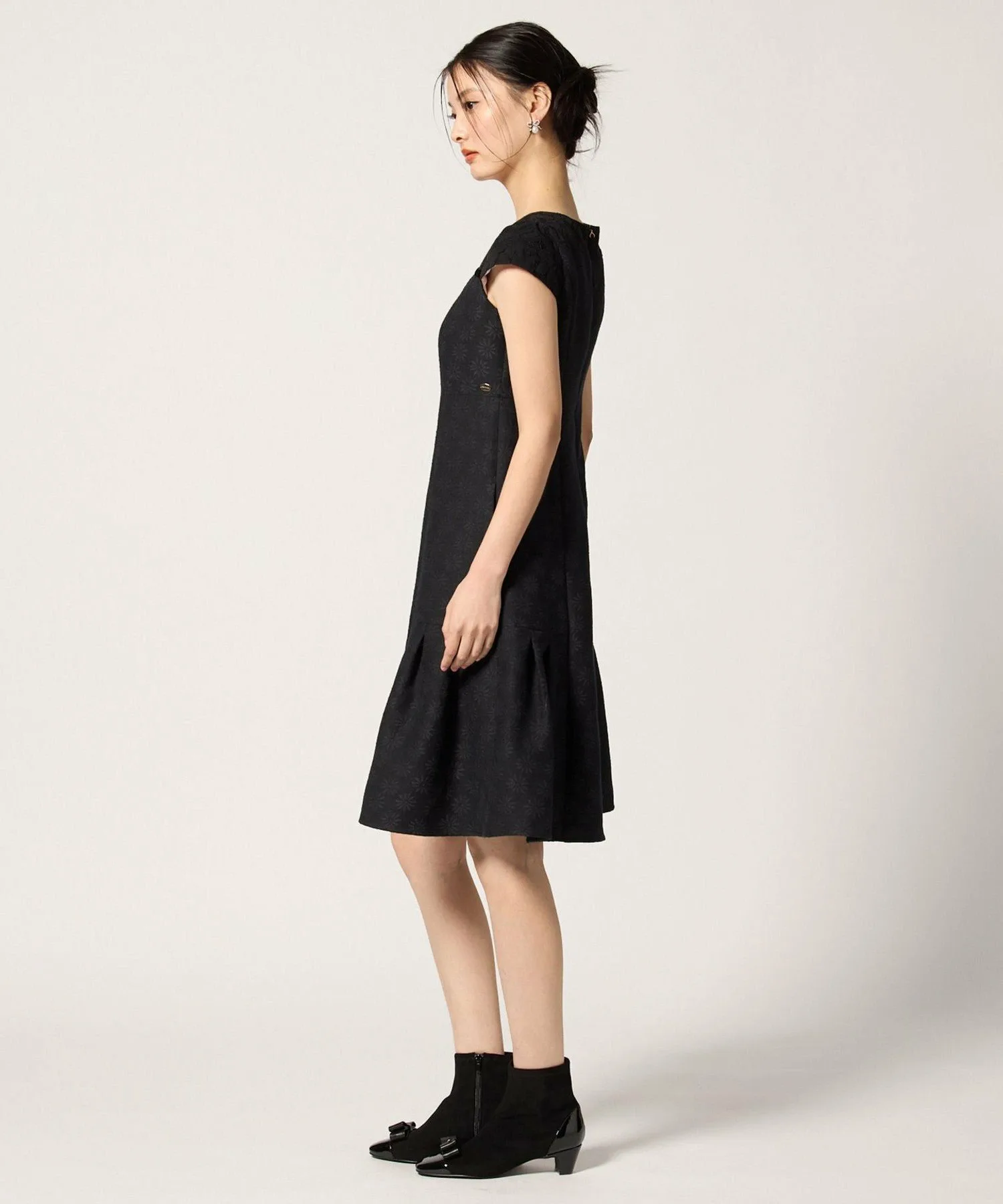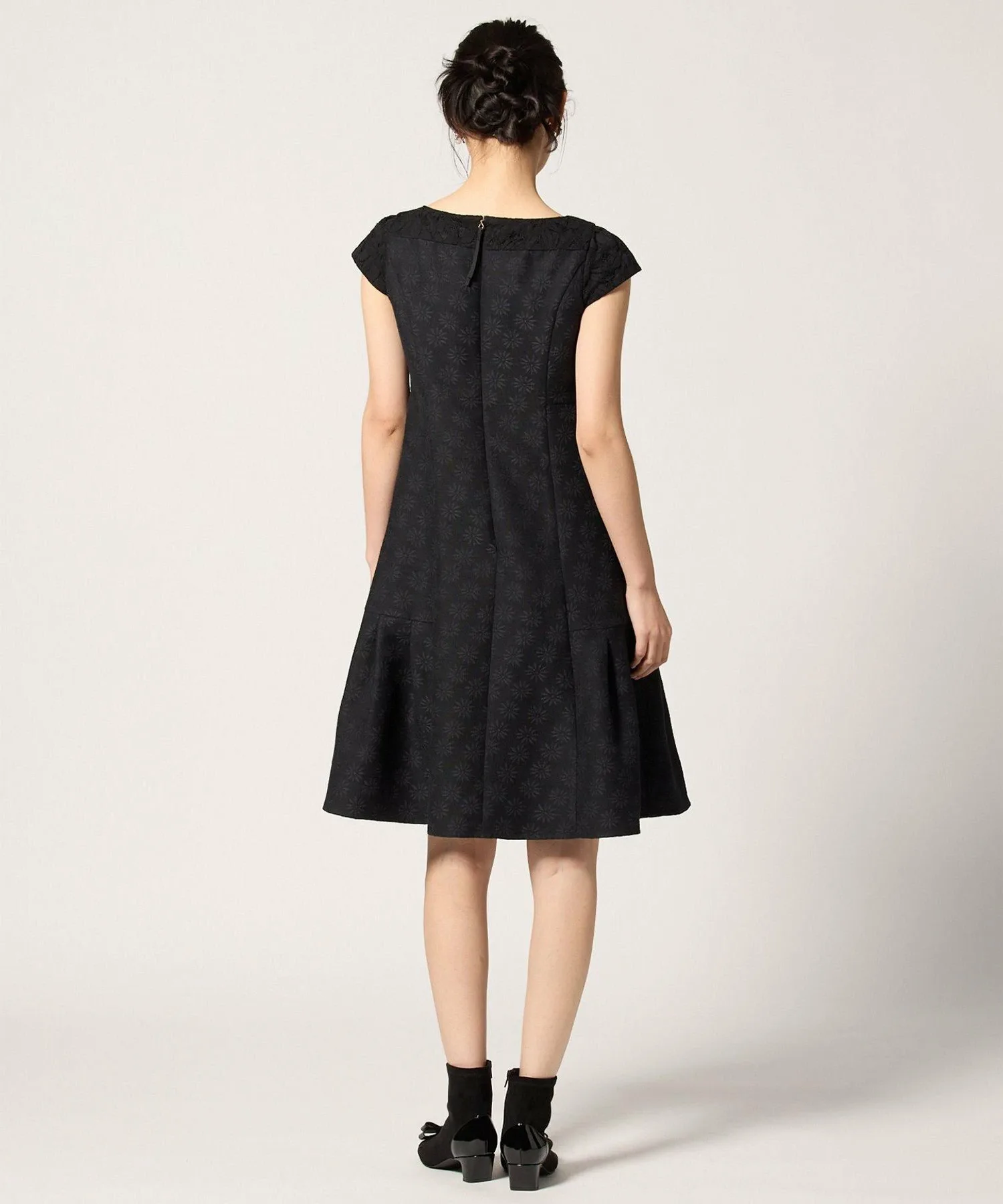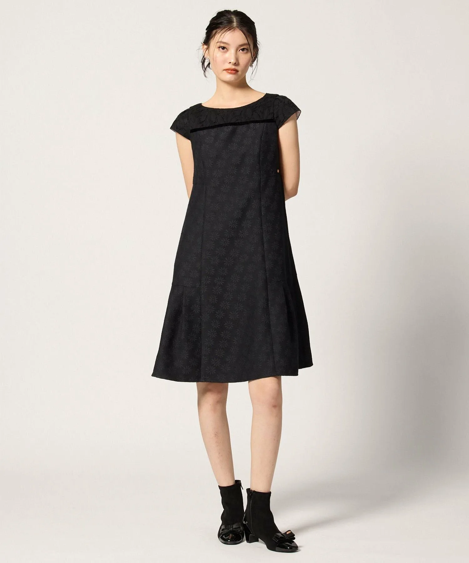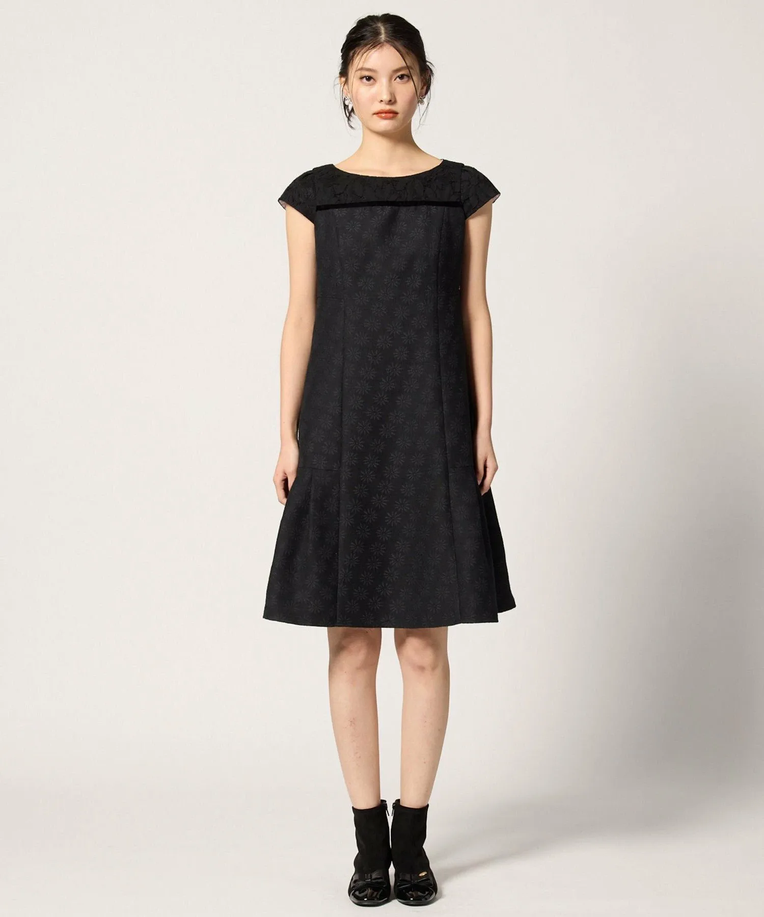 Это платье выглядит изысканно, сочетая кружево с жаккардовой тканью, сотканной с культовым цветком ромашки TOCCA. Высокая талия также выгодно подчеркивает фигуру.