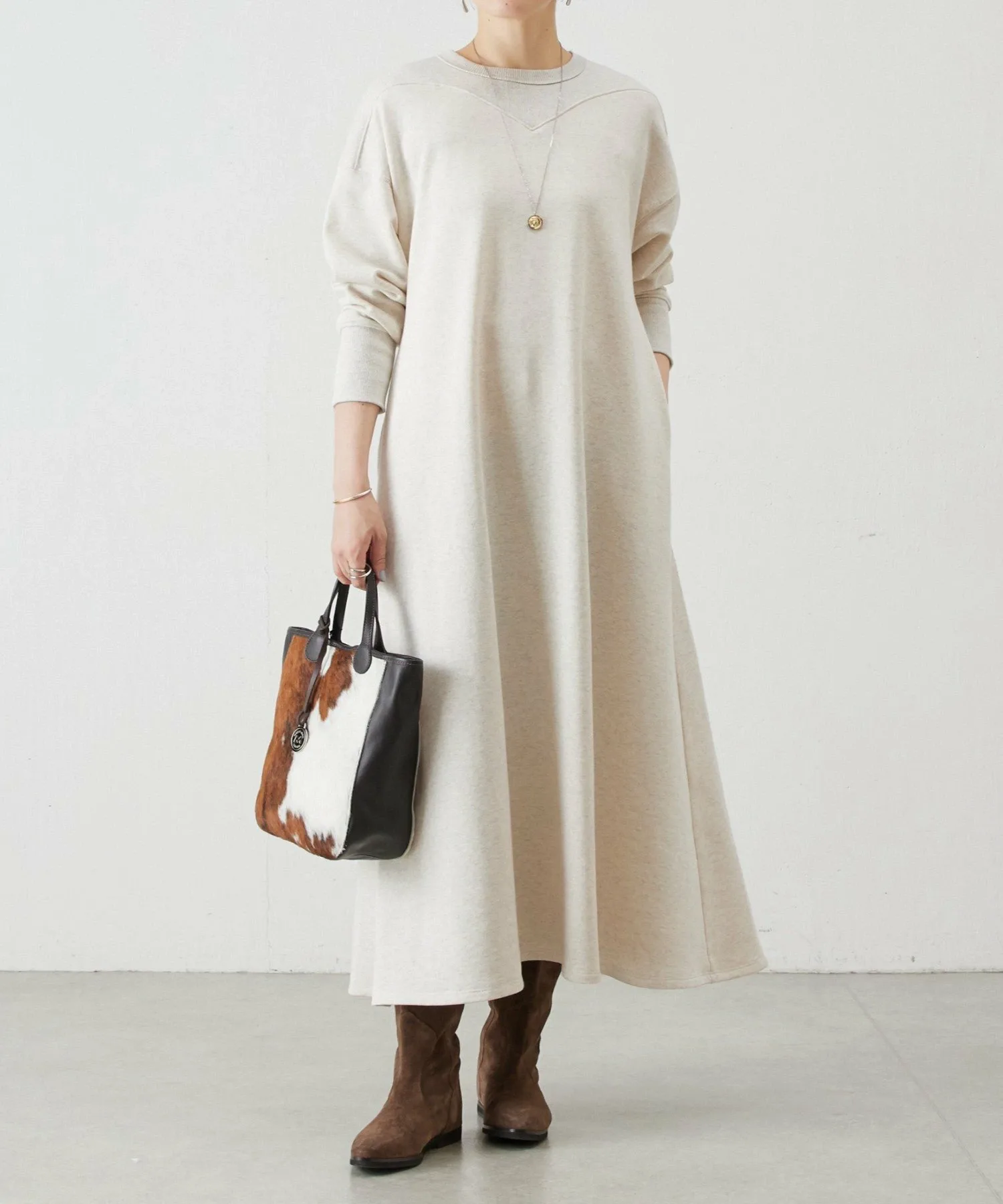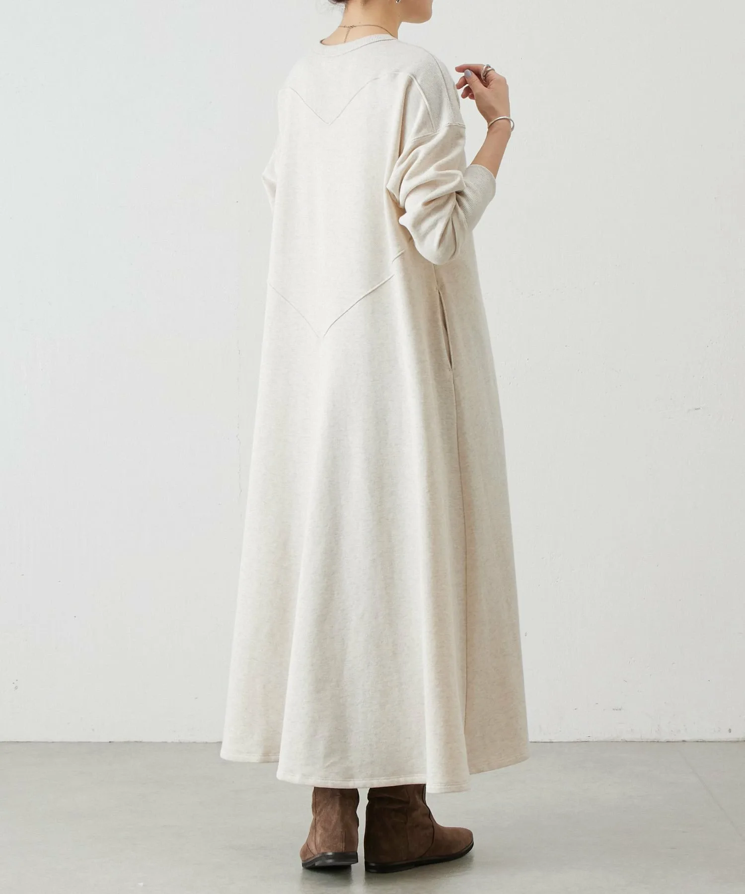 Длинная, слегка драпированная длина и расклешенный силуэт придают ему женственный вид, несмотря на повседневный материал.