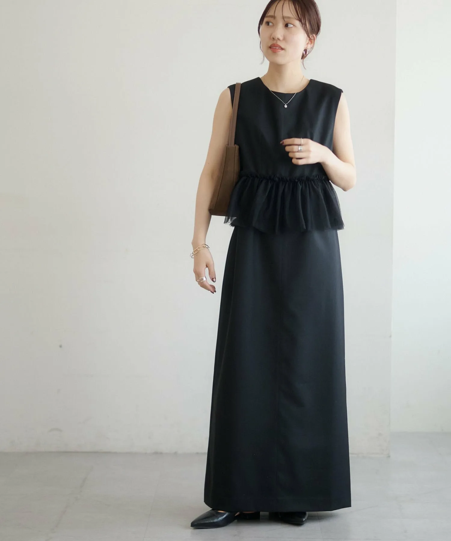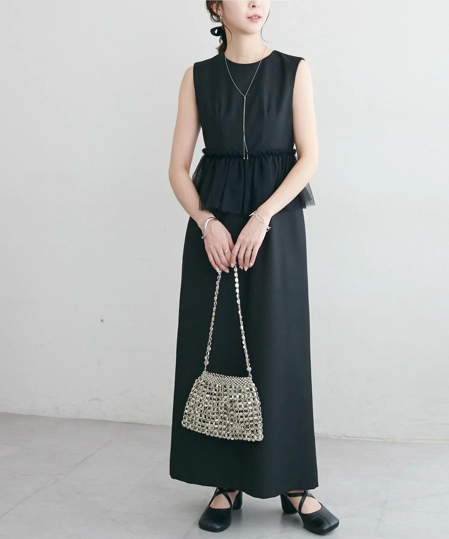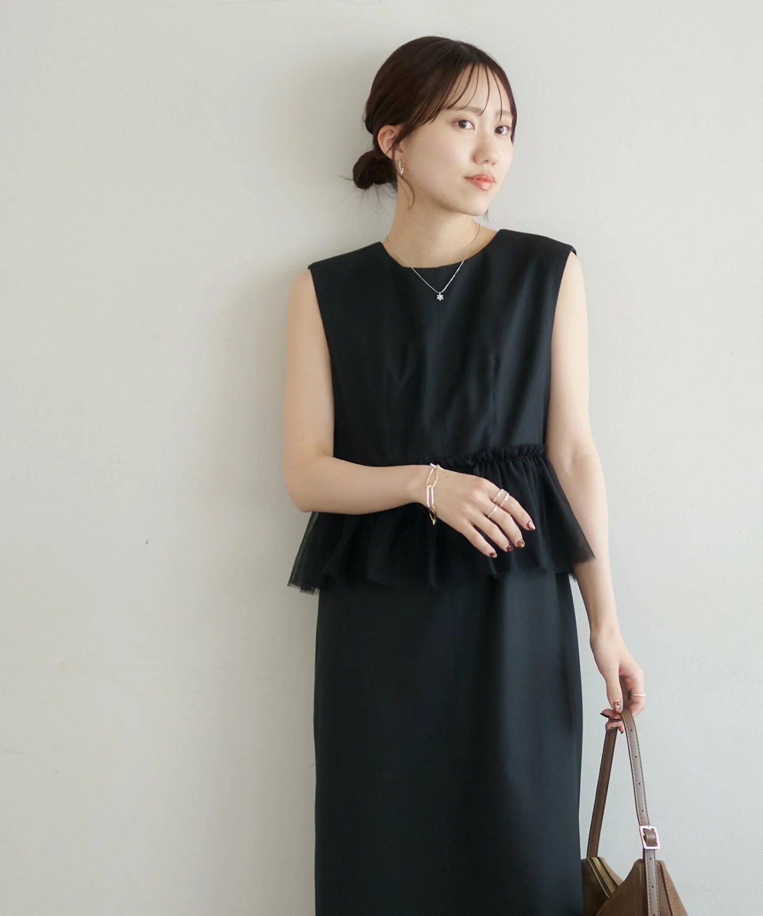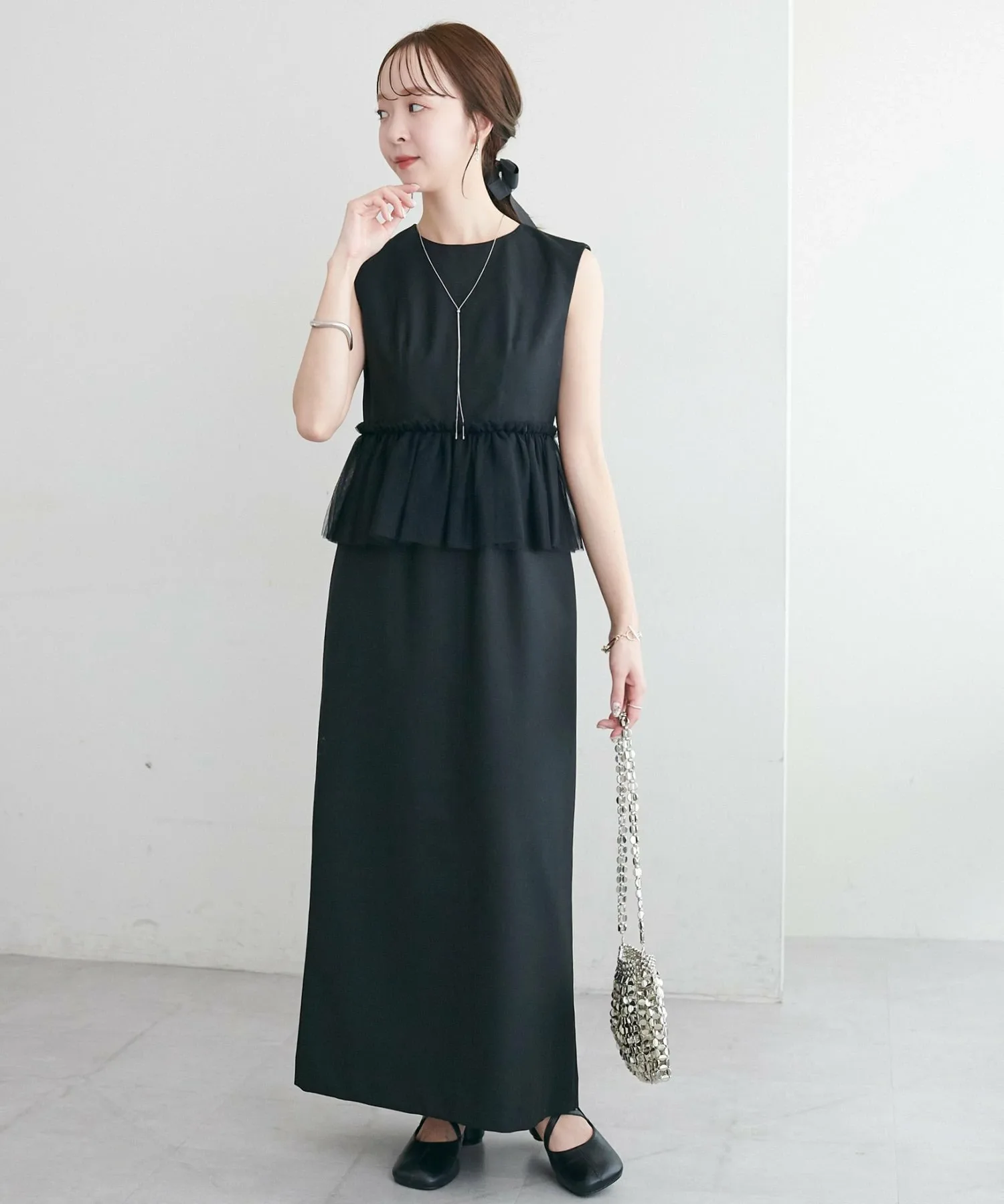 Размер 158 см (F): Платье без рукавов, поэтому, если вы беспокоитесь о длине, вы можете накинуть на плечи жакет или кардиган для большей уверенности.◎Хотя оно выполнено из тюля, оно выглядит сдержанно благодаря тому же цвету тюля, поэтому я бы хотела сочетать его с аксессуарами, чтобы подчеркнуть его.