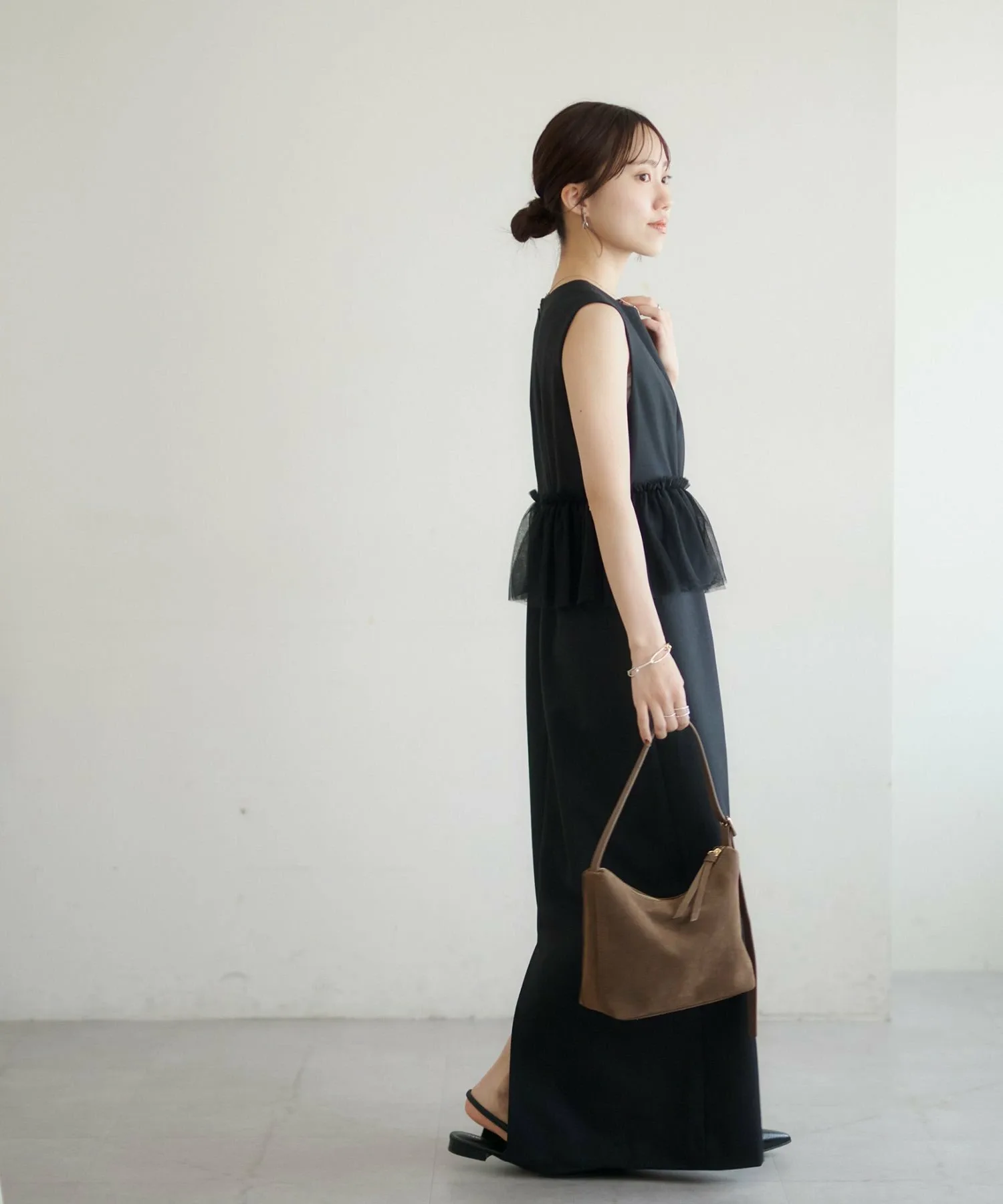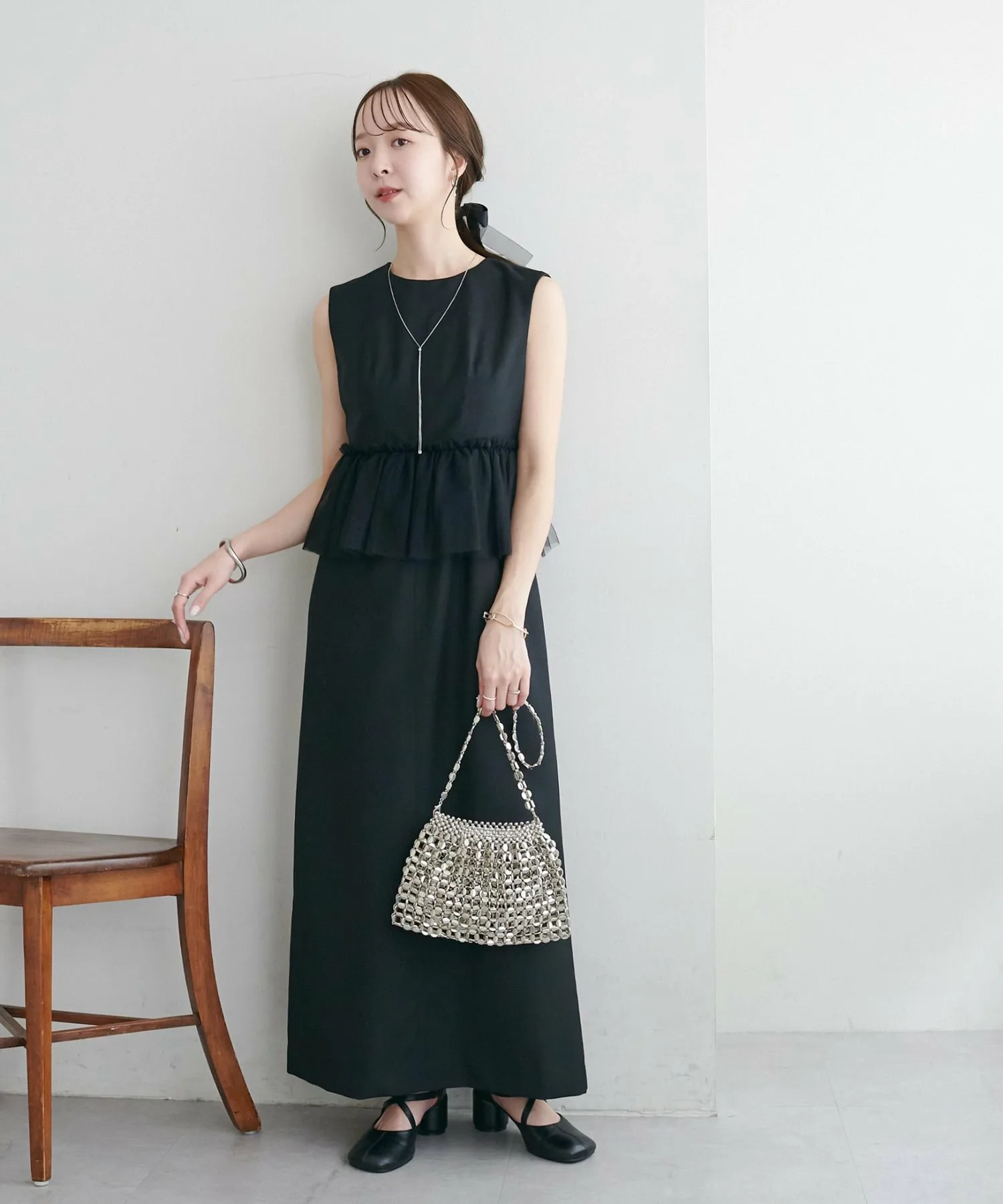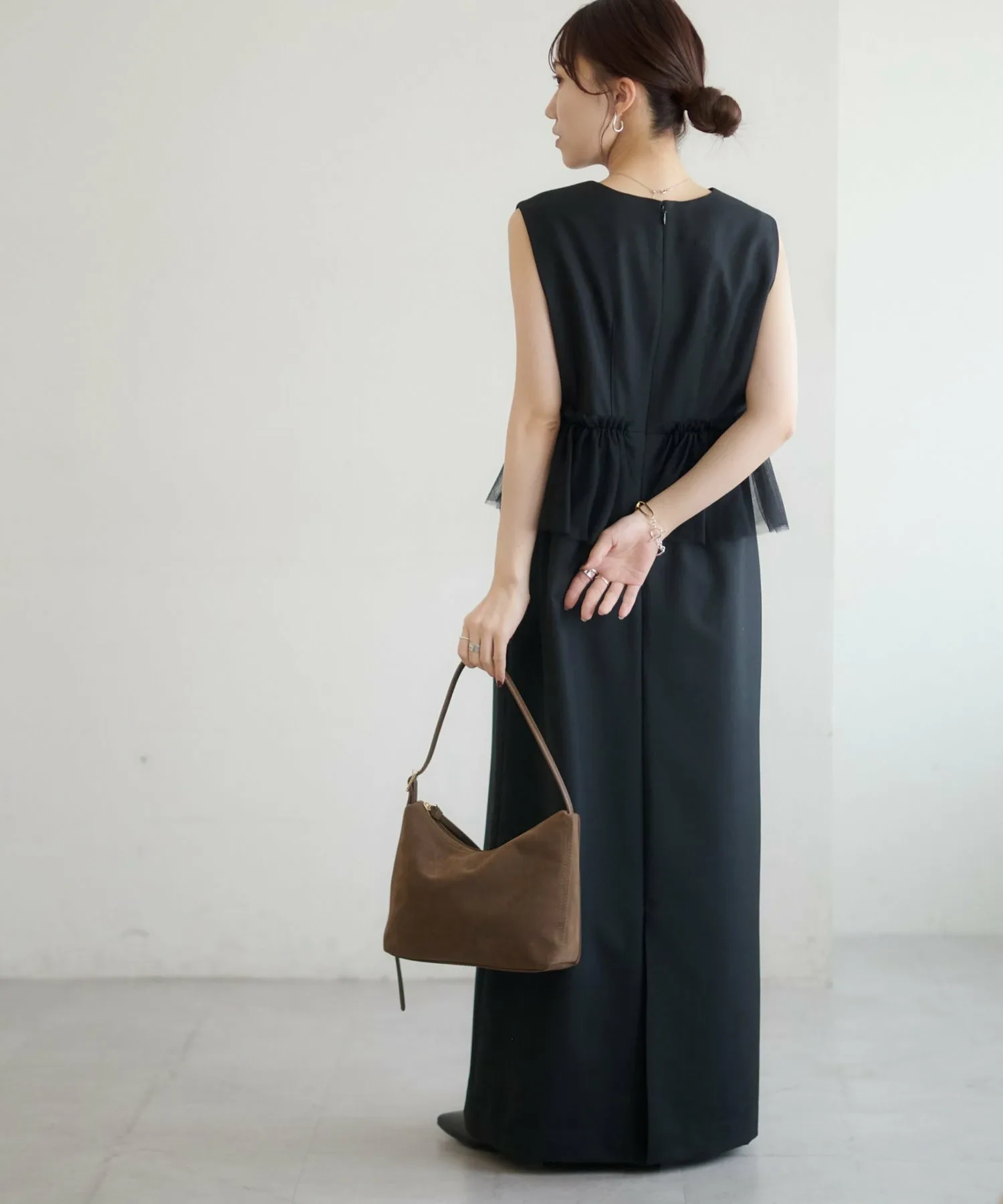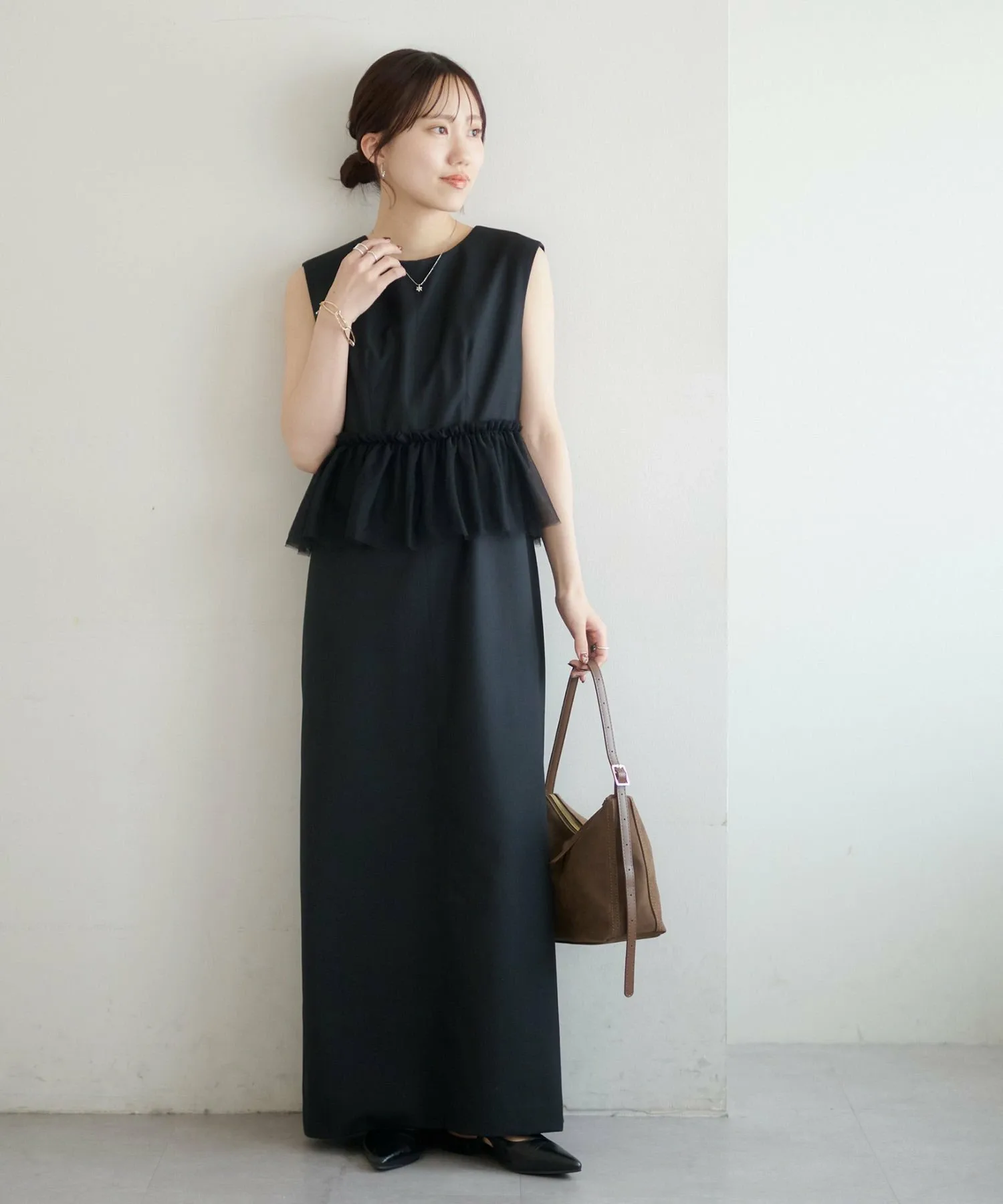 Размер 158 см (F): Платье без рукавов, поэтому, если вы беспокоитесь о длине, вы можете накинуть на плечи жакет или кардиган для большей уверенности.◎Хотя оно выполнено из тюля, оно выглядит сдержанно благодаря тому же цвету тюля, поэтому я бы хотела сочетать его с аксессуарами, чтобы подчеркнуть его.