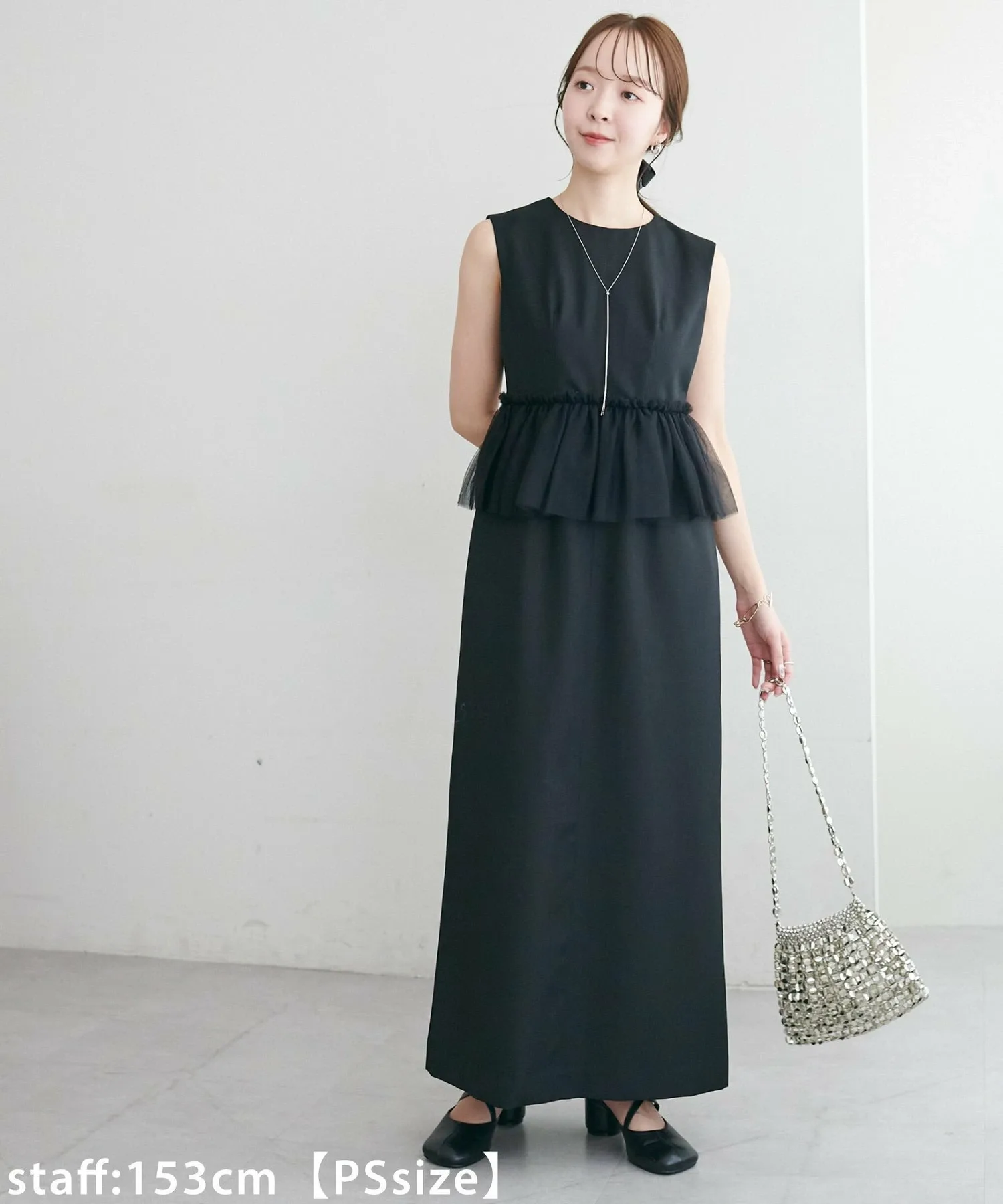 Персонал ростом 150 см (размер PS): Отлично смотрится с высокой обувью! Небрежно добавленный тюль на этом простом платье — милый акцент♪