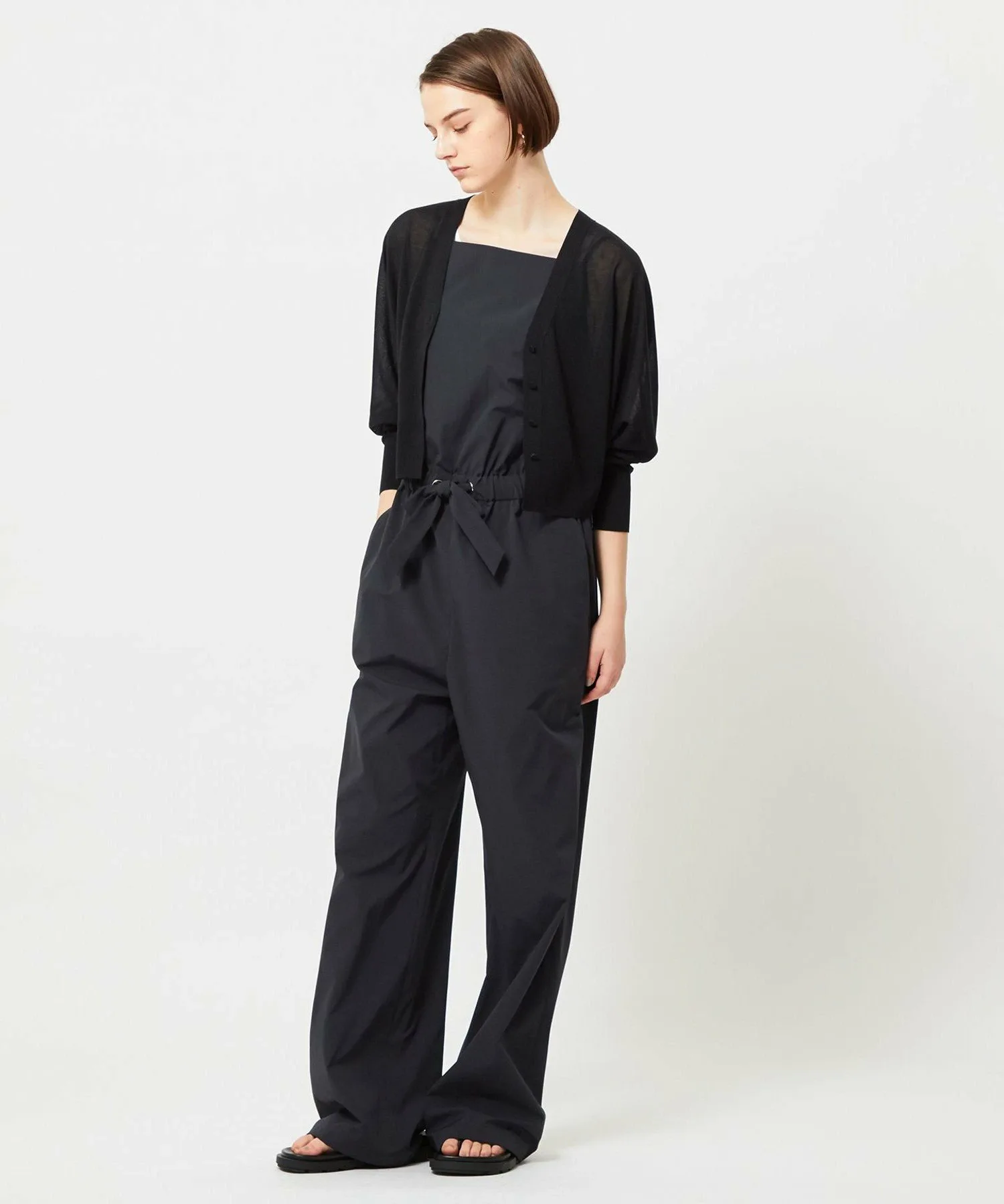 Изготовлен из материала Typewriter, полученного из переработанной полиэстерной пряжи, собранной и повторно использованной из выброшенной одежды и обрезков. Его натуральная, сухая текстура, ощущение прохлады, защита от УФ-излучения и легкость стирки в домашних условиях делают его комфортным и освежающим материалом для лета.