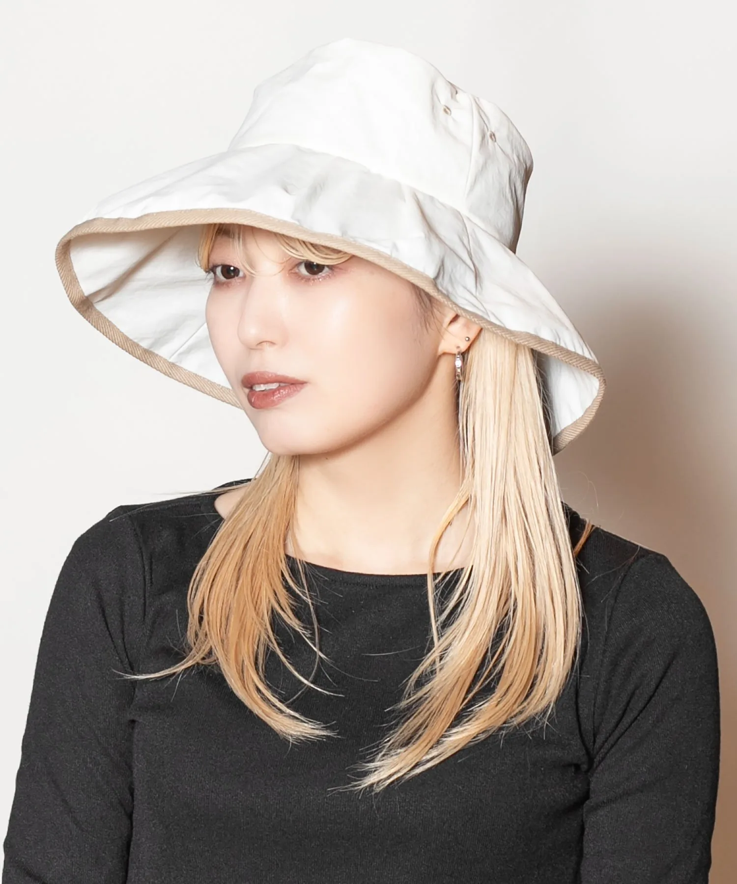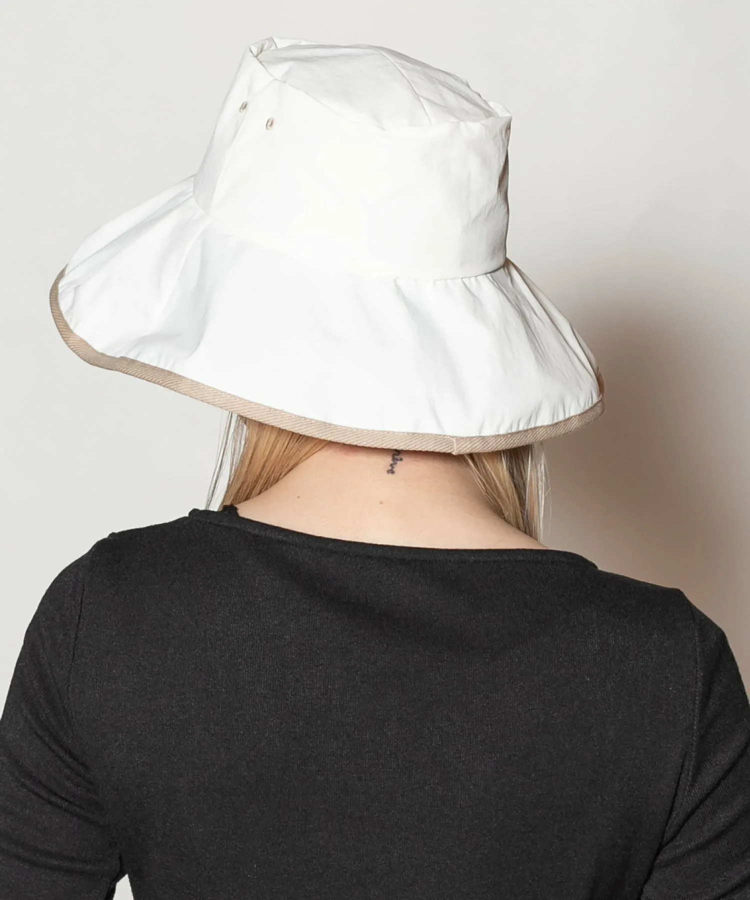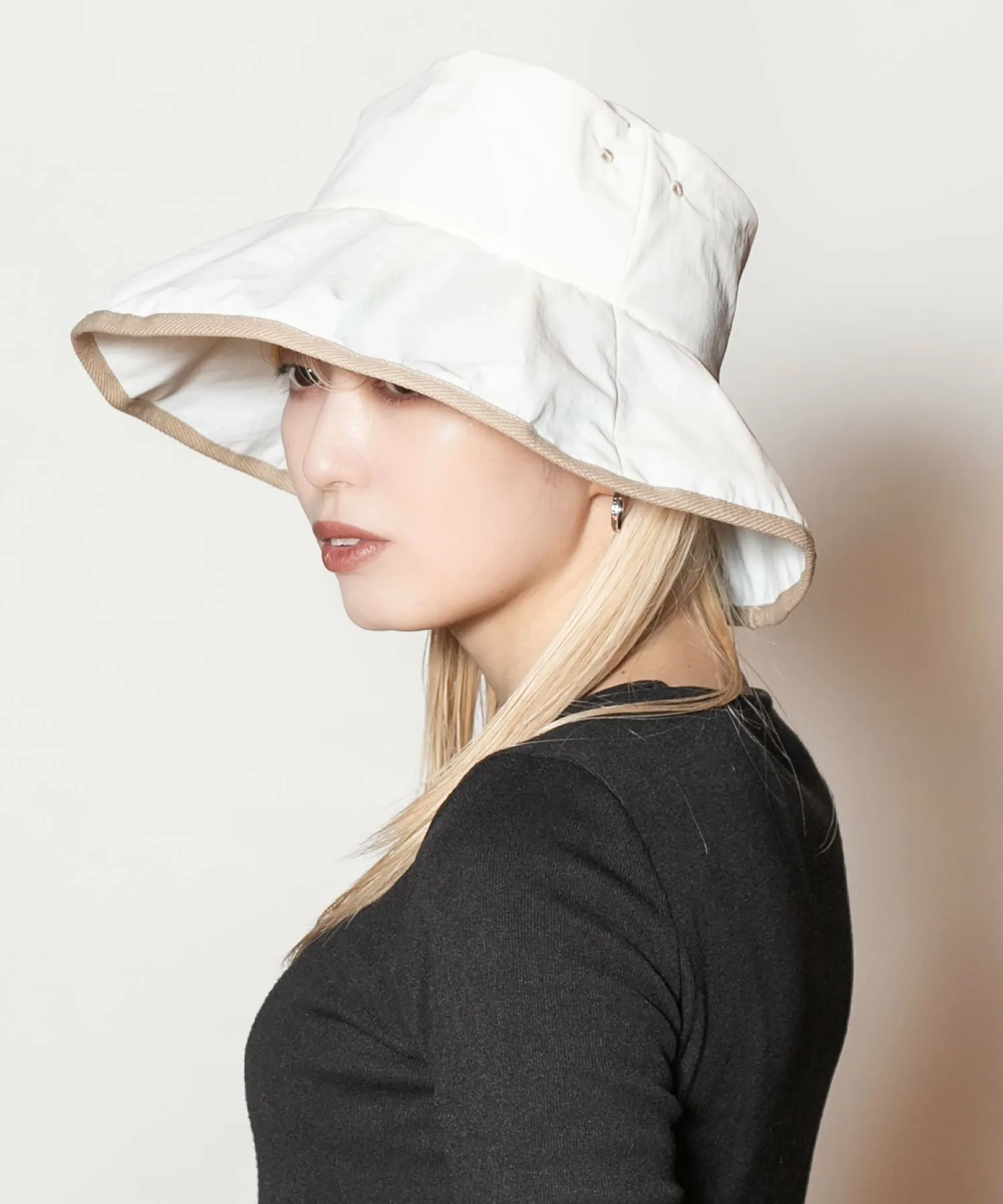 Поля изготовлены из специального материала, который блокирует свет, более 99,9% УФ-лучей и обеспечивает теплоизоляцию. Шляпу можно стирать вручную, что делает её идеальной для повседневной носки. Силуэт