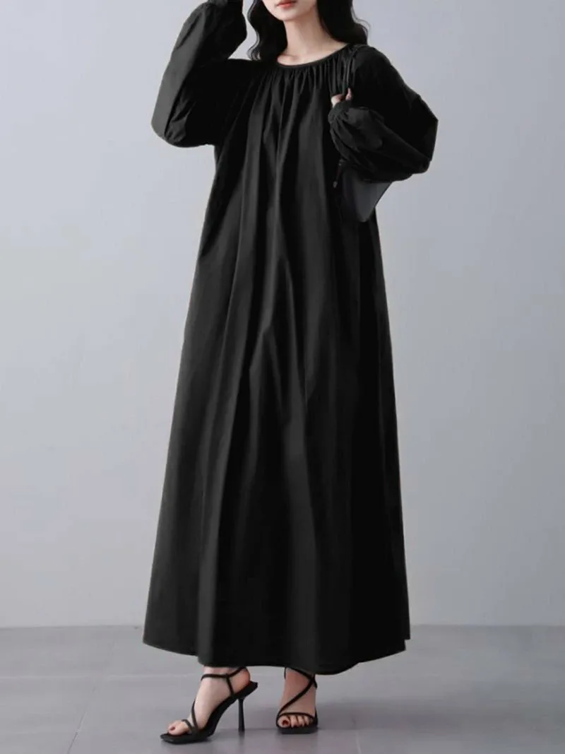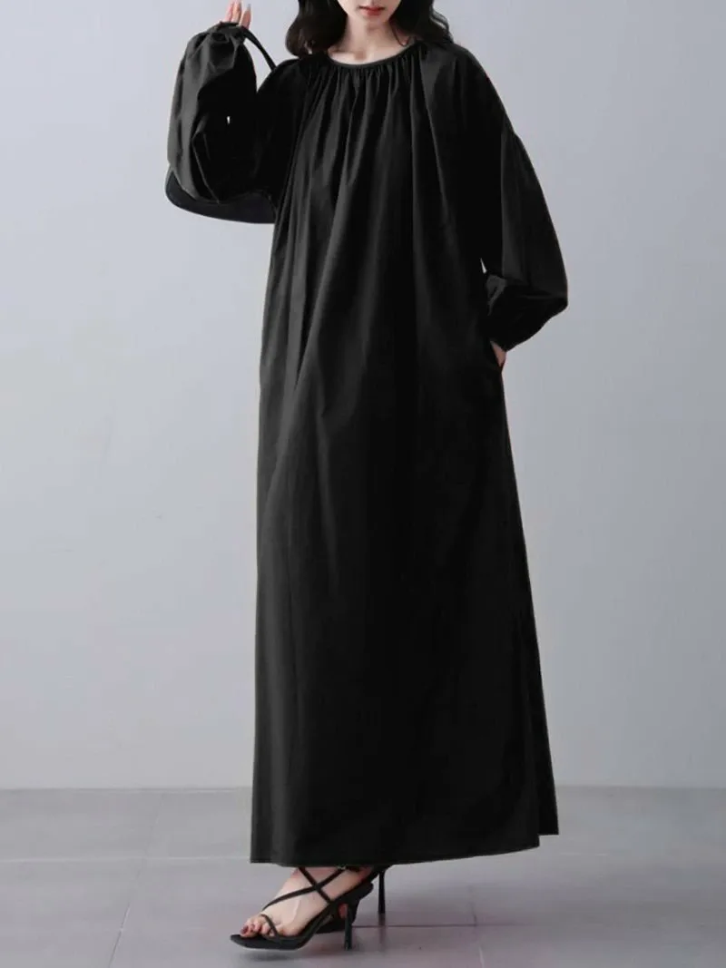 Это длинное платье отличается привлекательным, воздушным силуэтом, созданным благодаря обильным сборкам.