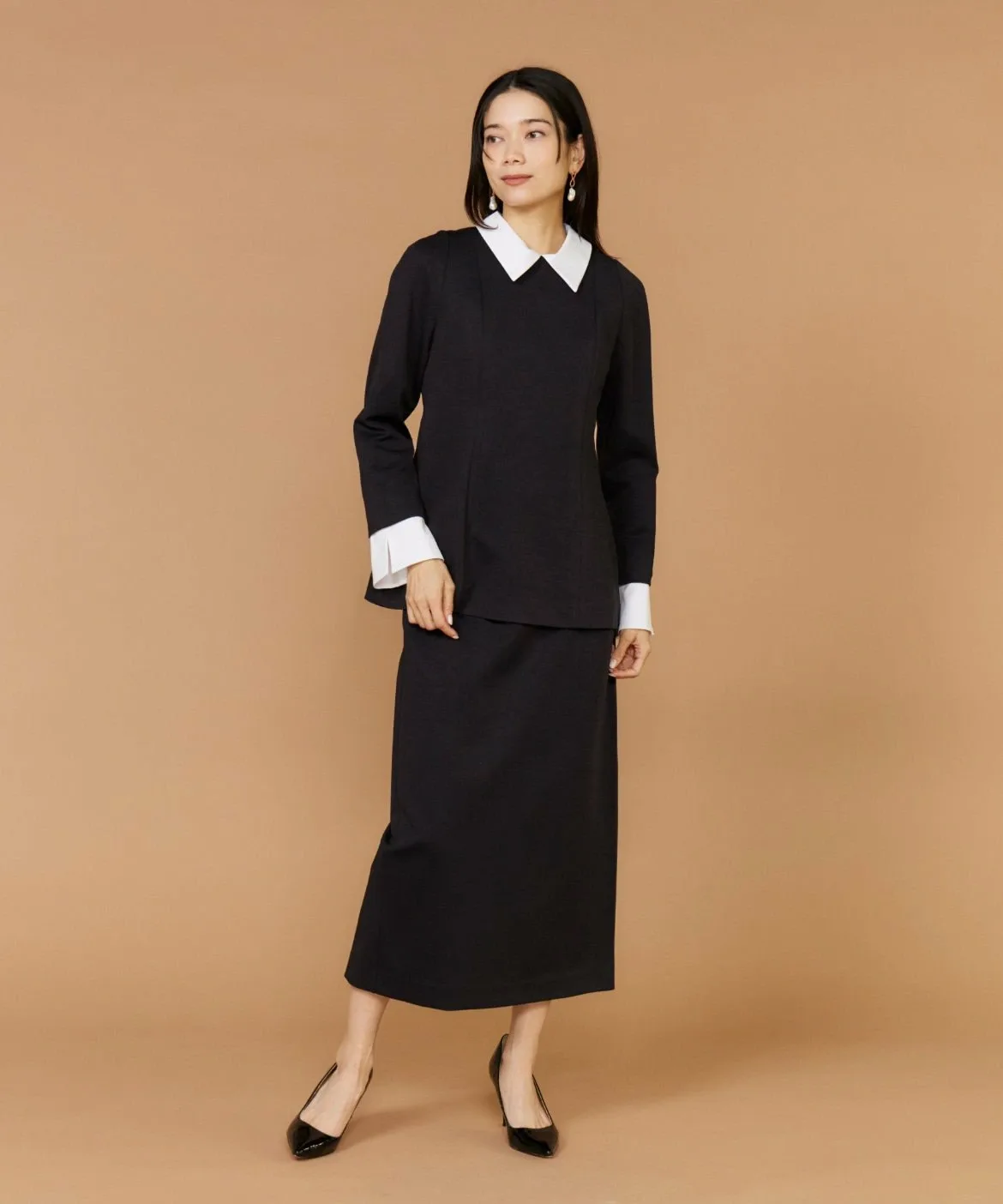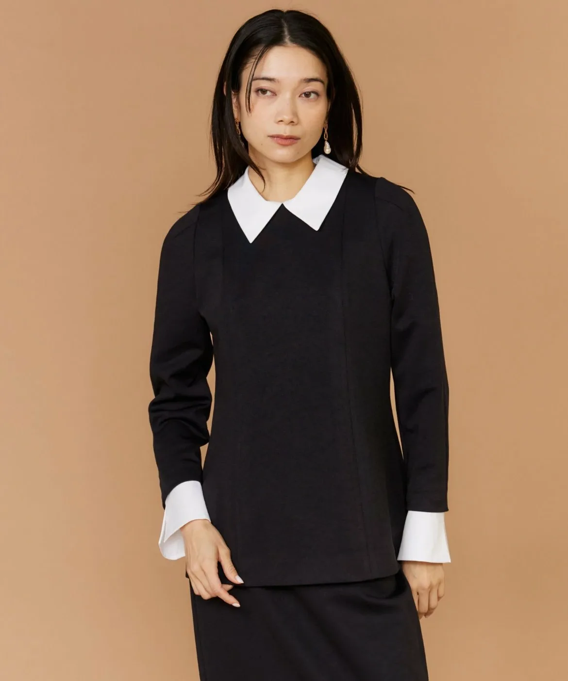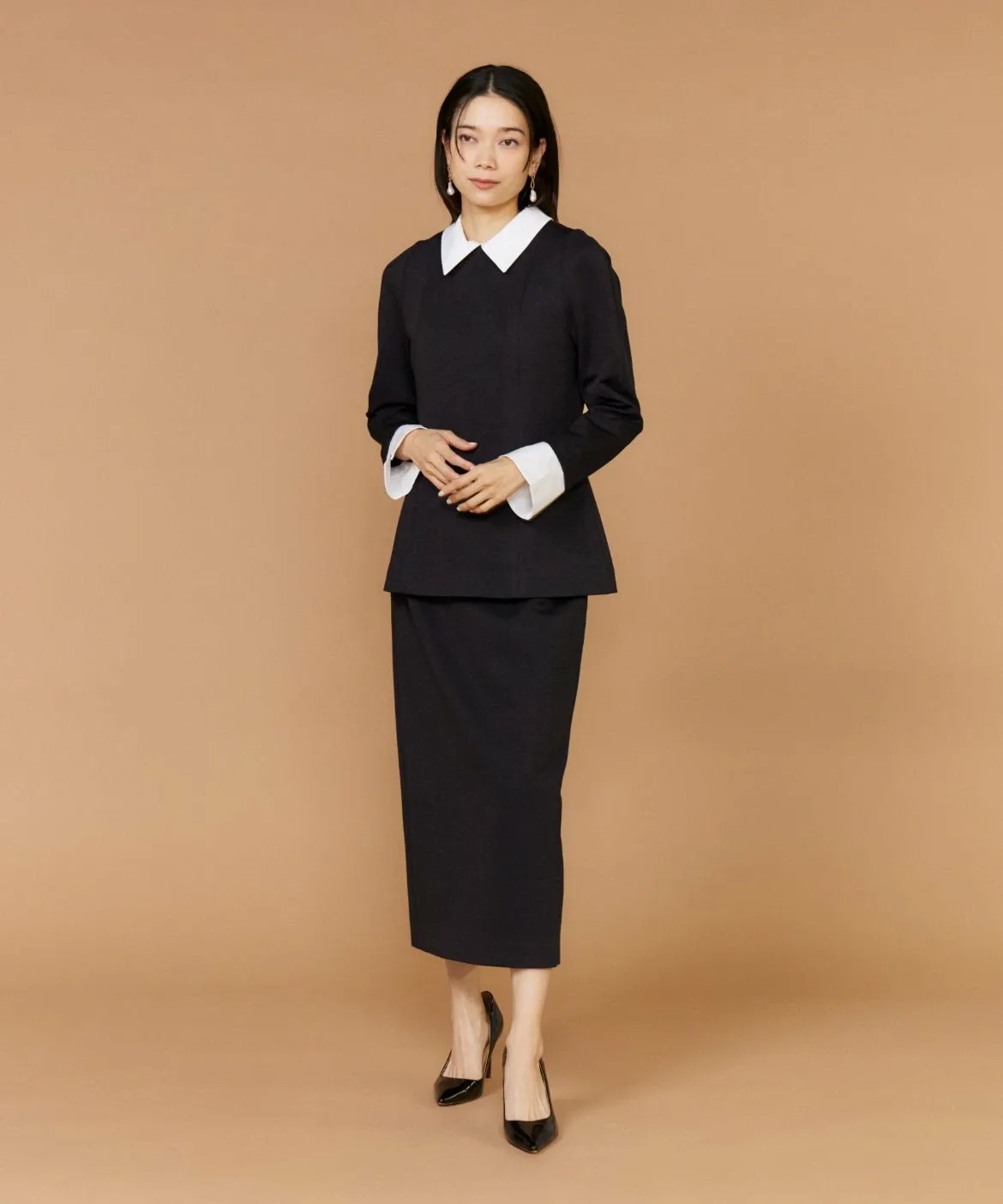 Этот женственный и модный топ тщательно разработан, а его выкройка многократно дорабатывалась для создания пышности баски. Швы и другие элементы выкройки были тщательно продуманы для создания структурированного силуэта, формируя округлую линию плеч и силуэт «кокон» в юбке. Воротник съемный, что делает этот топ отличным выбором для самых разных случаев, от церемоний до званых ужинов.