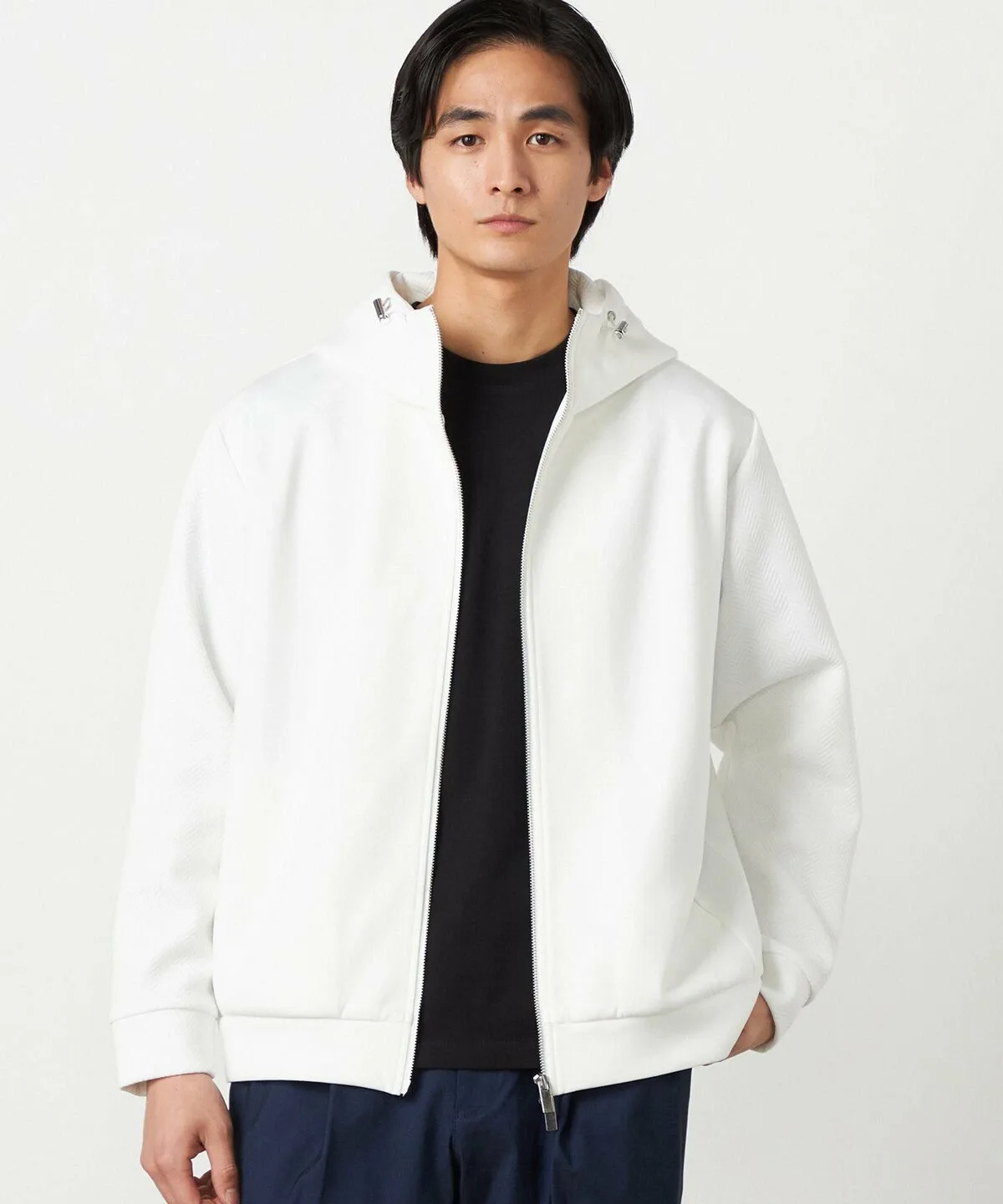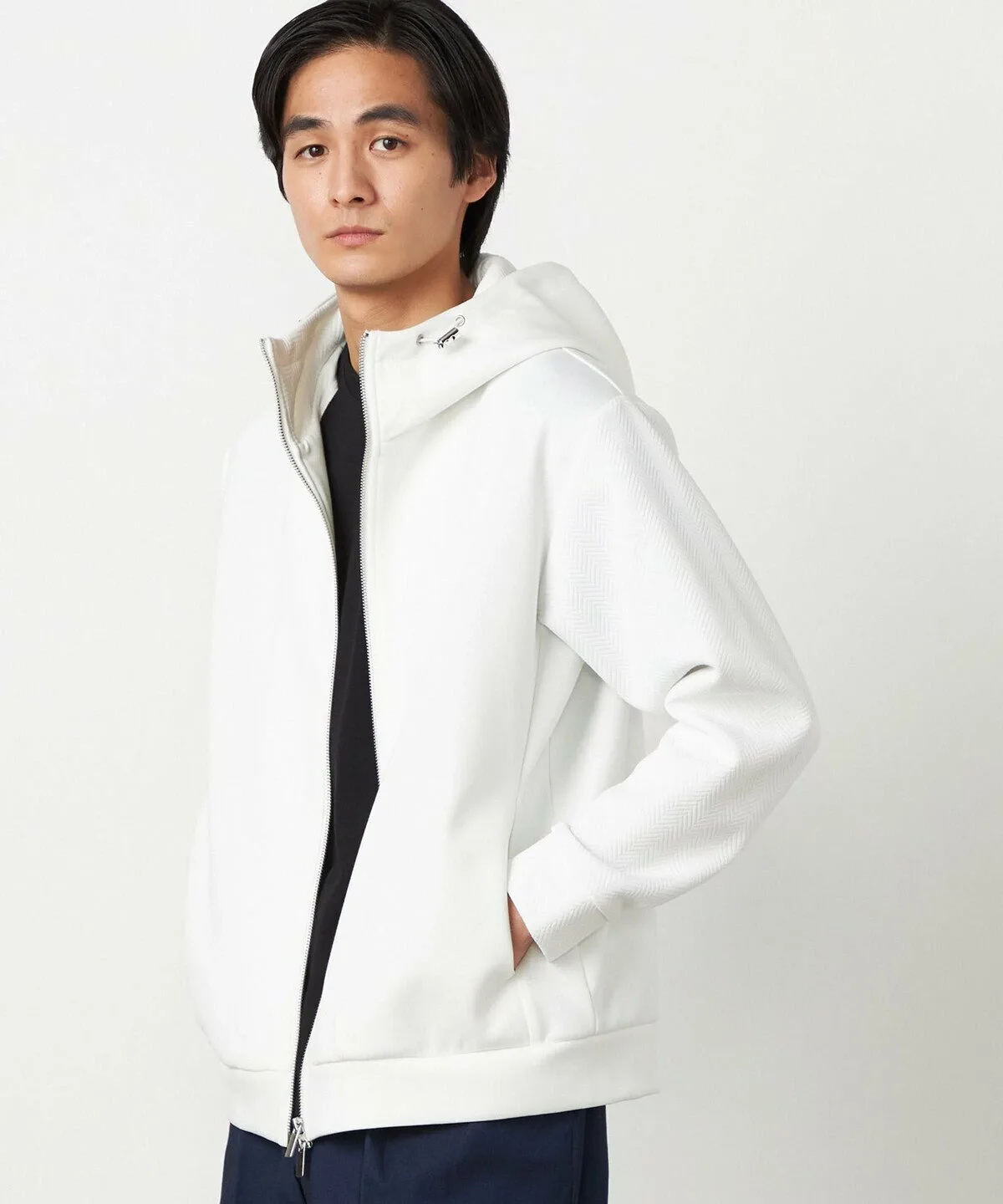 Эта куртка с капюшоном украшена жаккардовыми вставками в елочку на подкладке капюшона и рукавов.
