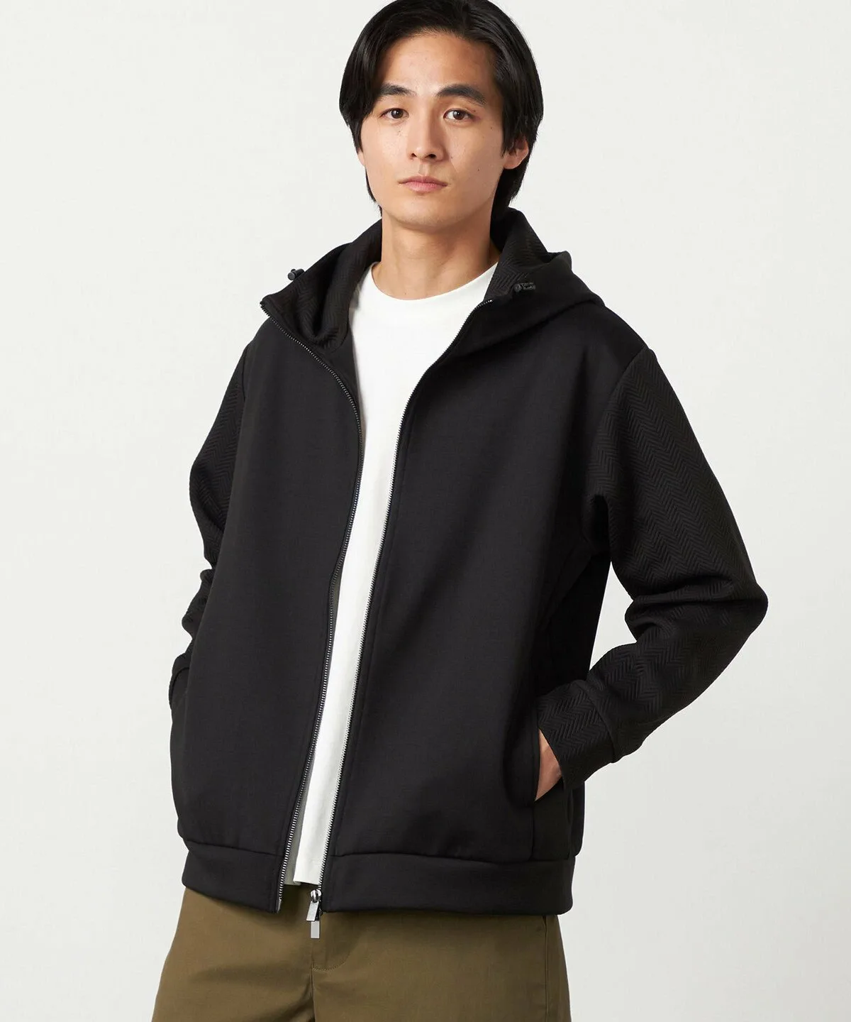 Эта куртка с капюшоном украшена жаккардовыми вставками в елочку на подкладке капюшона и рукавов.