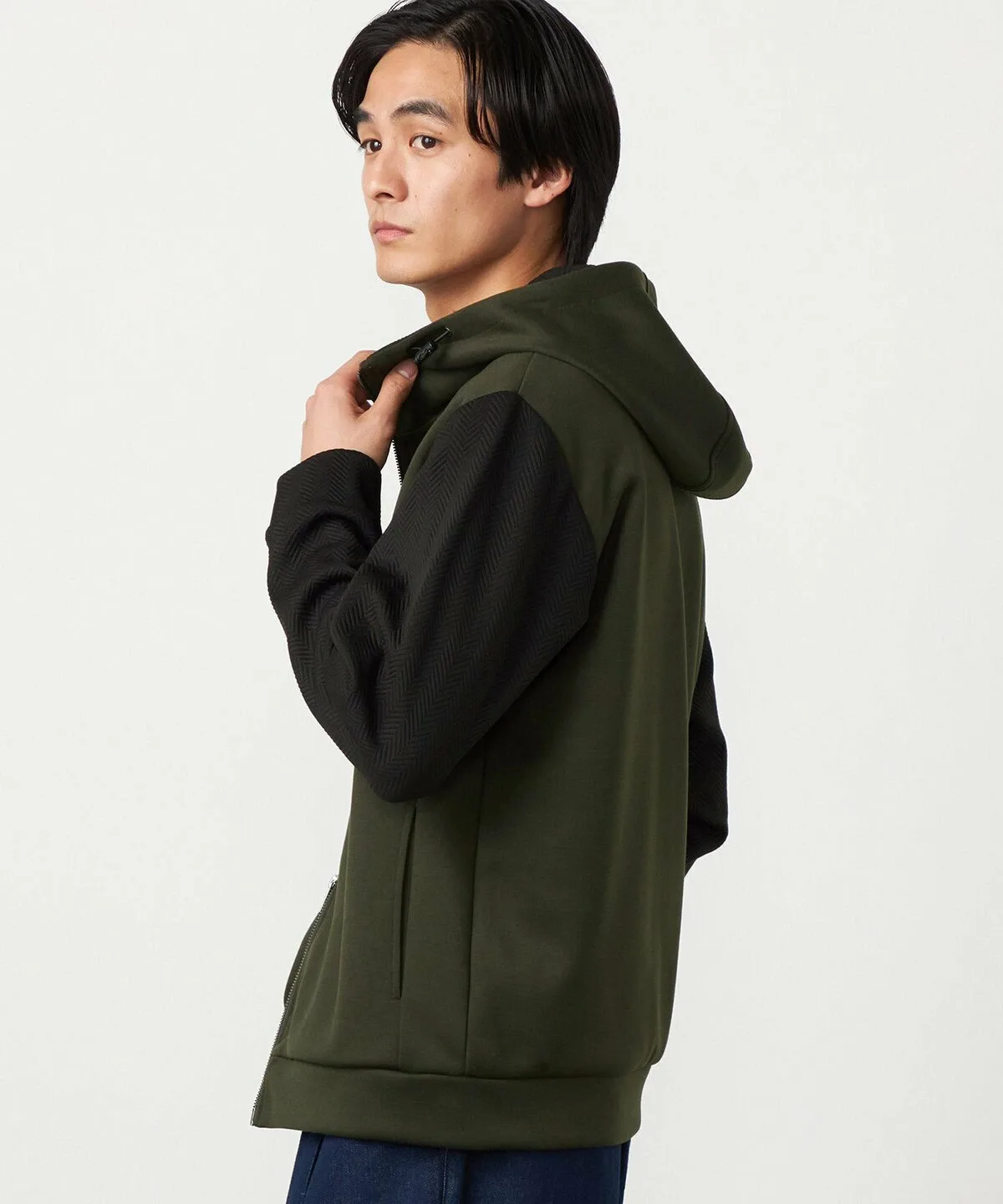 Эта куртка с капюшоном украшена жаккардовыми вставками в елочку на подкладке капюшона и рукавов.
