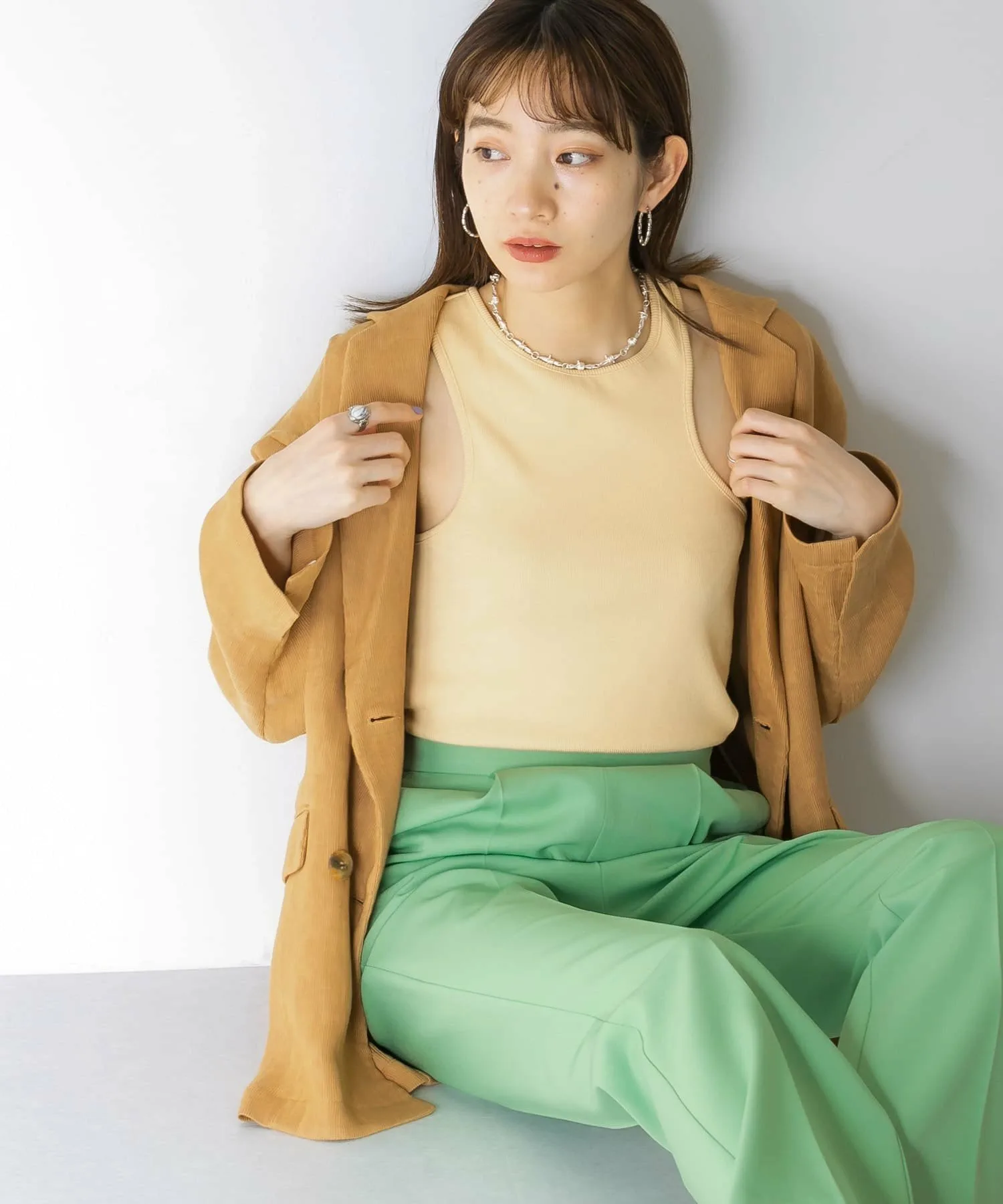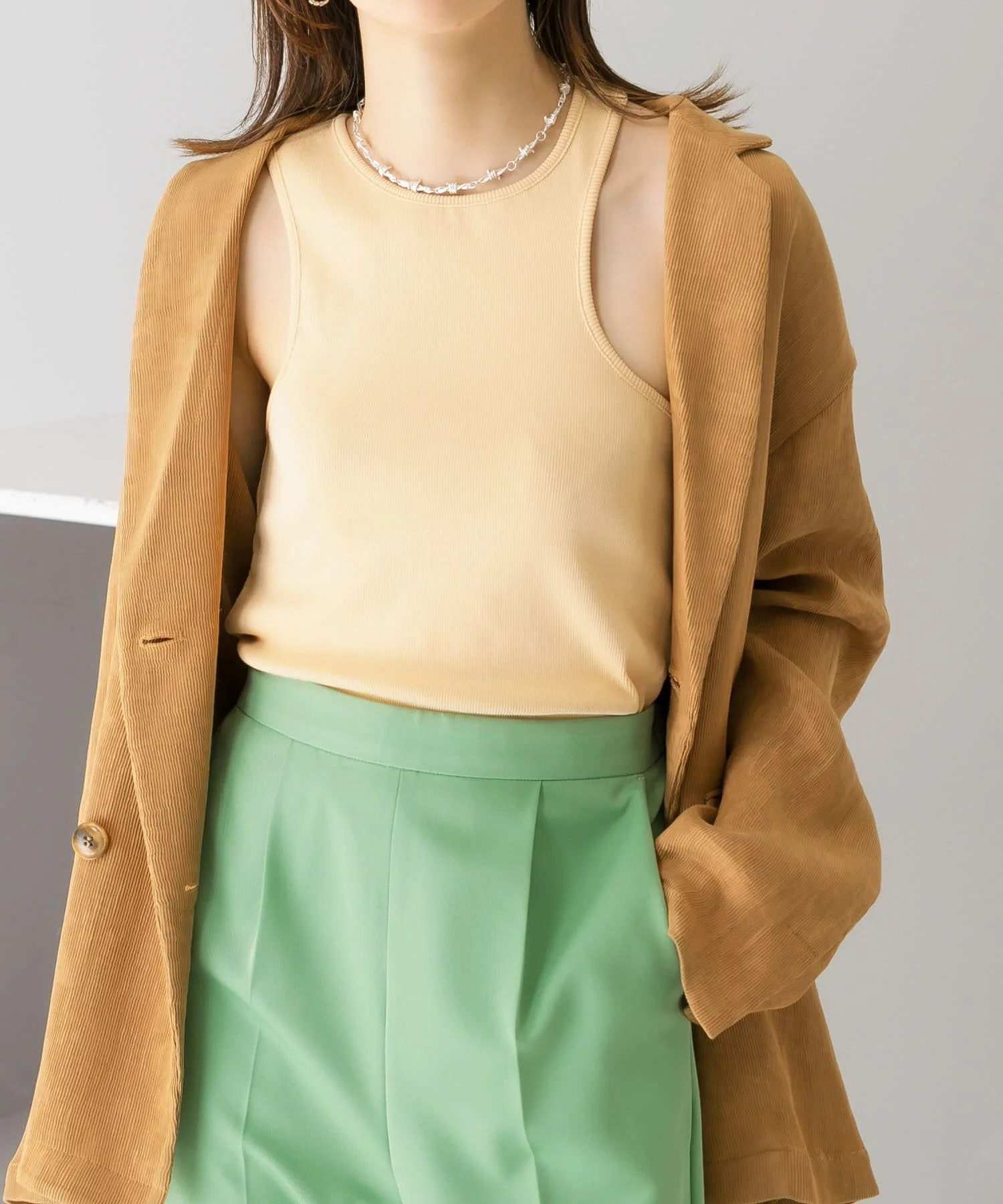 Майка с изящным асимметричным дизайном, которая привлечет ваше внимание. Она облегает фигуру чуть ниже ключиц, обеспечивая надежную посадку, а закругленный низ также является ее изюминкой.◎Ее можно носить круглый год, и она идеально подходит в качестве нижнего слоя под куртки и рубашки в предстоящем сезоне.