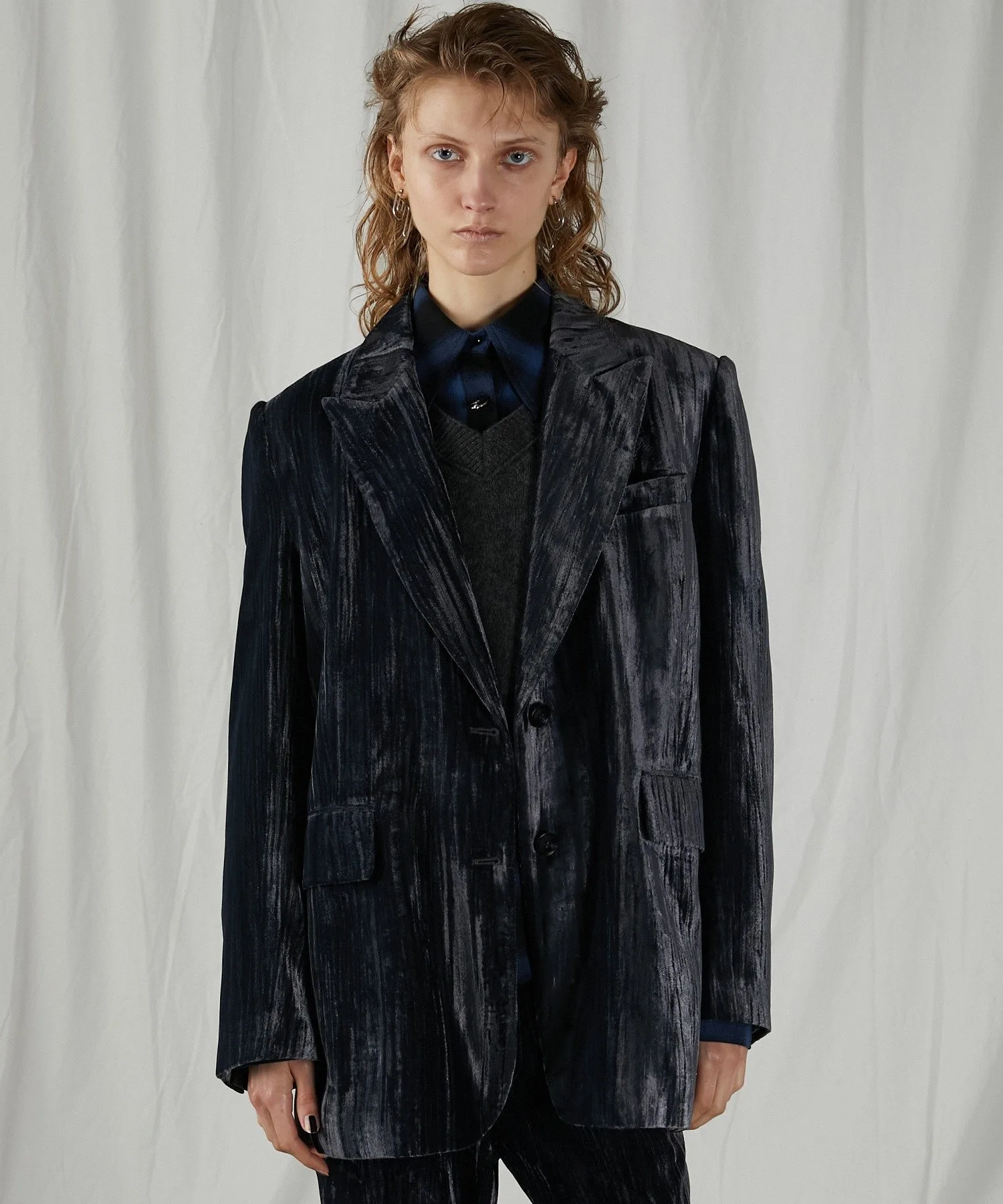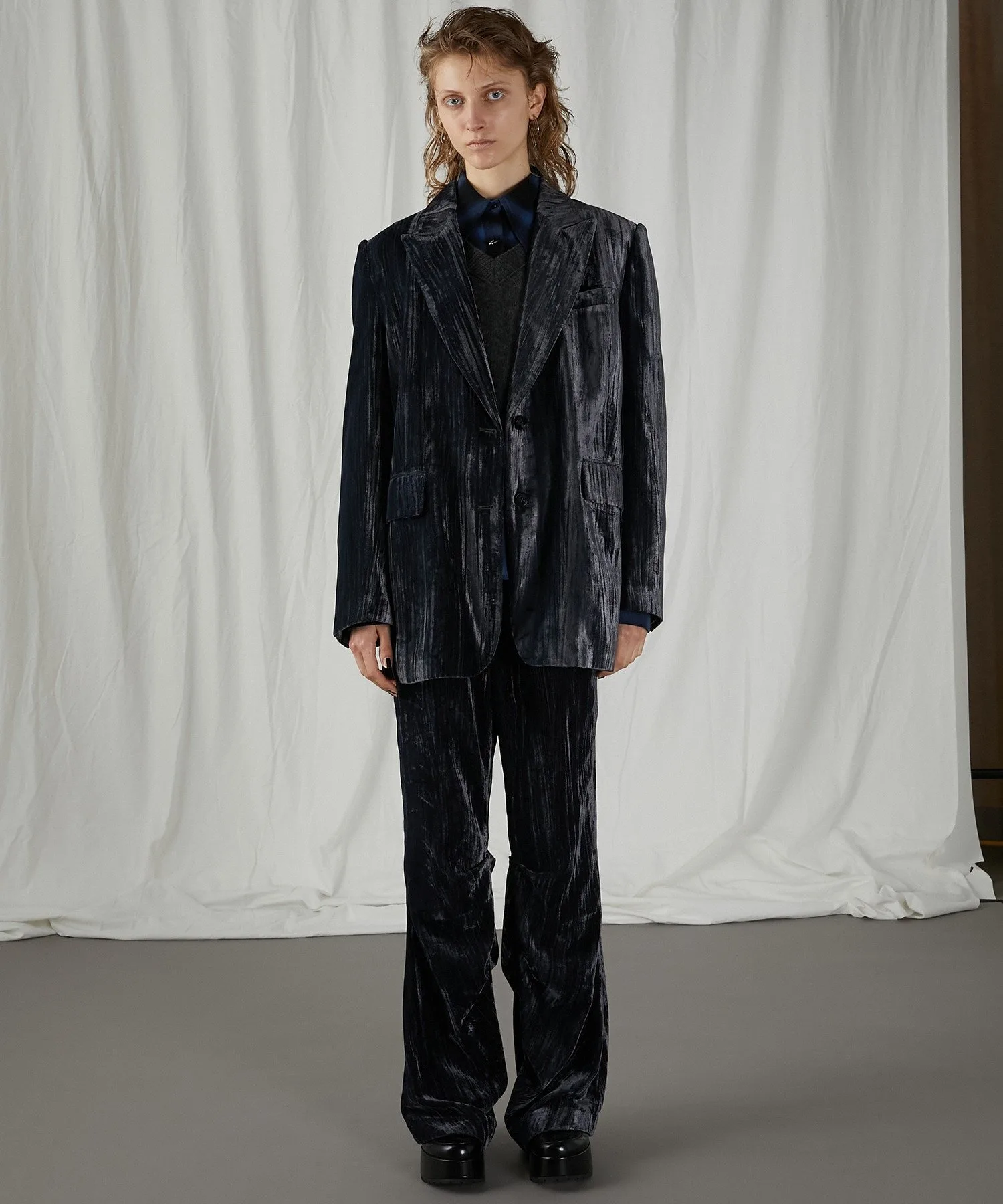 Заостренные лацканы придают ему слегка классический вид, а драпировка ткани создает свободный, расслабленный образ.