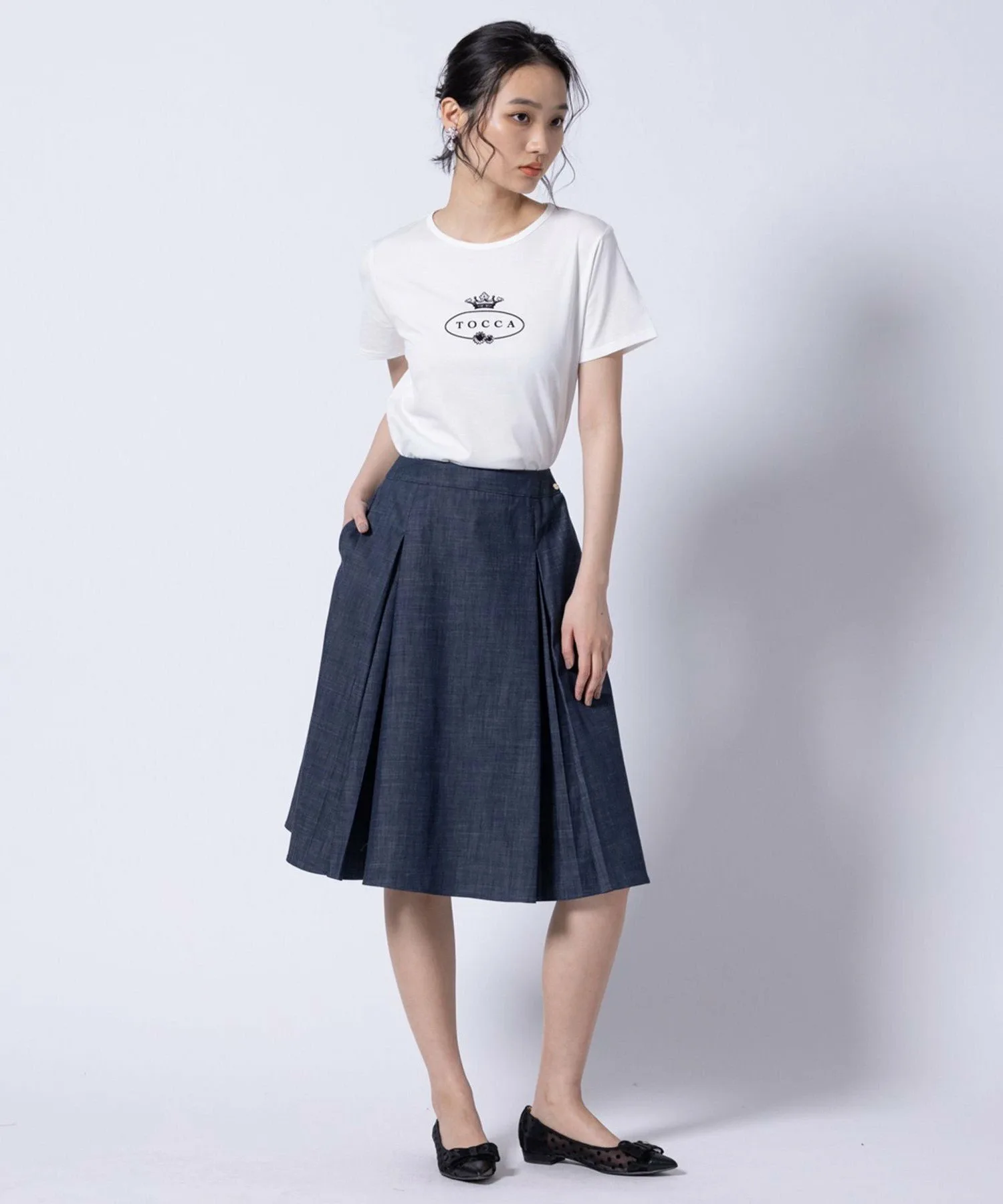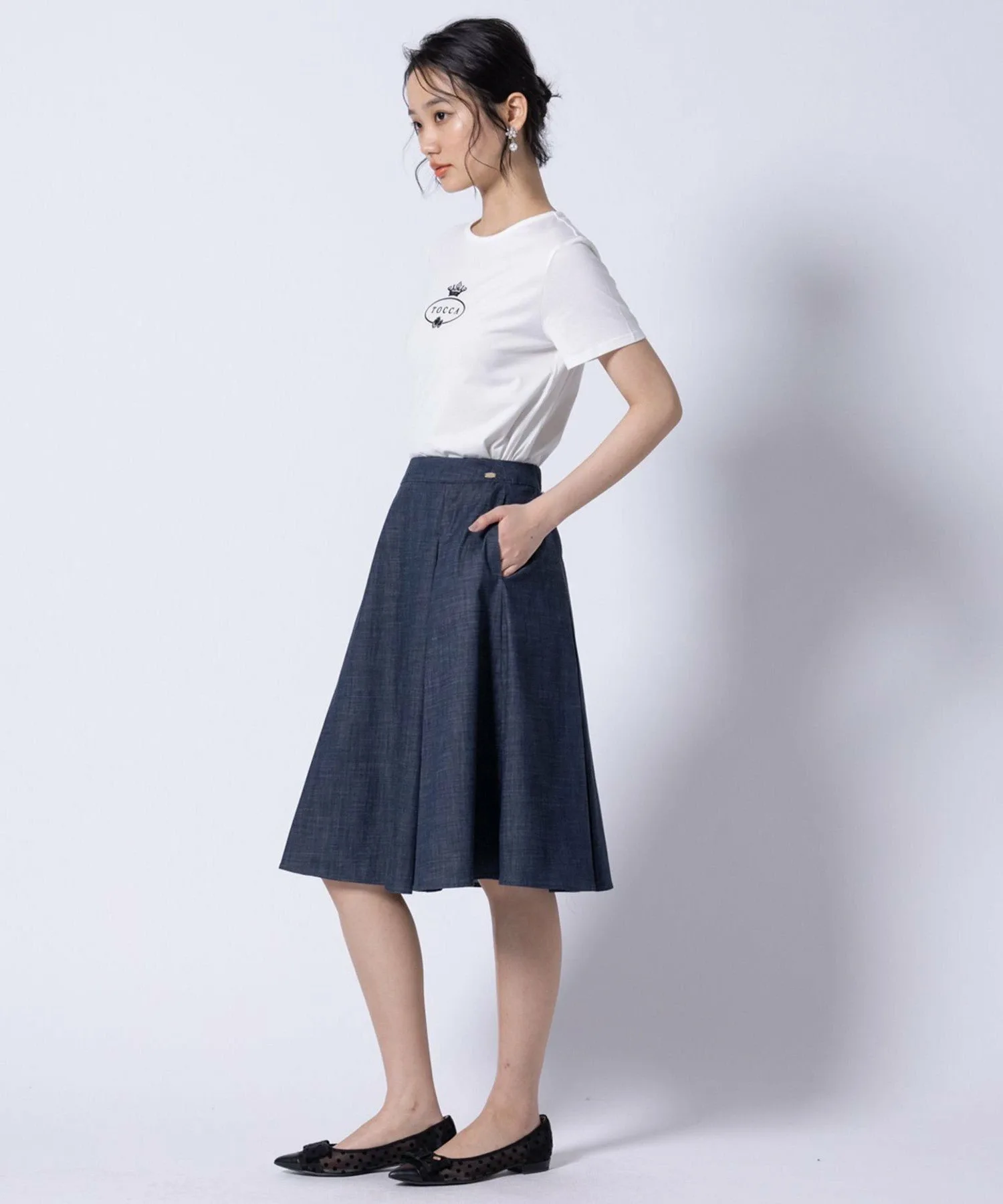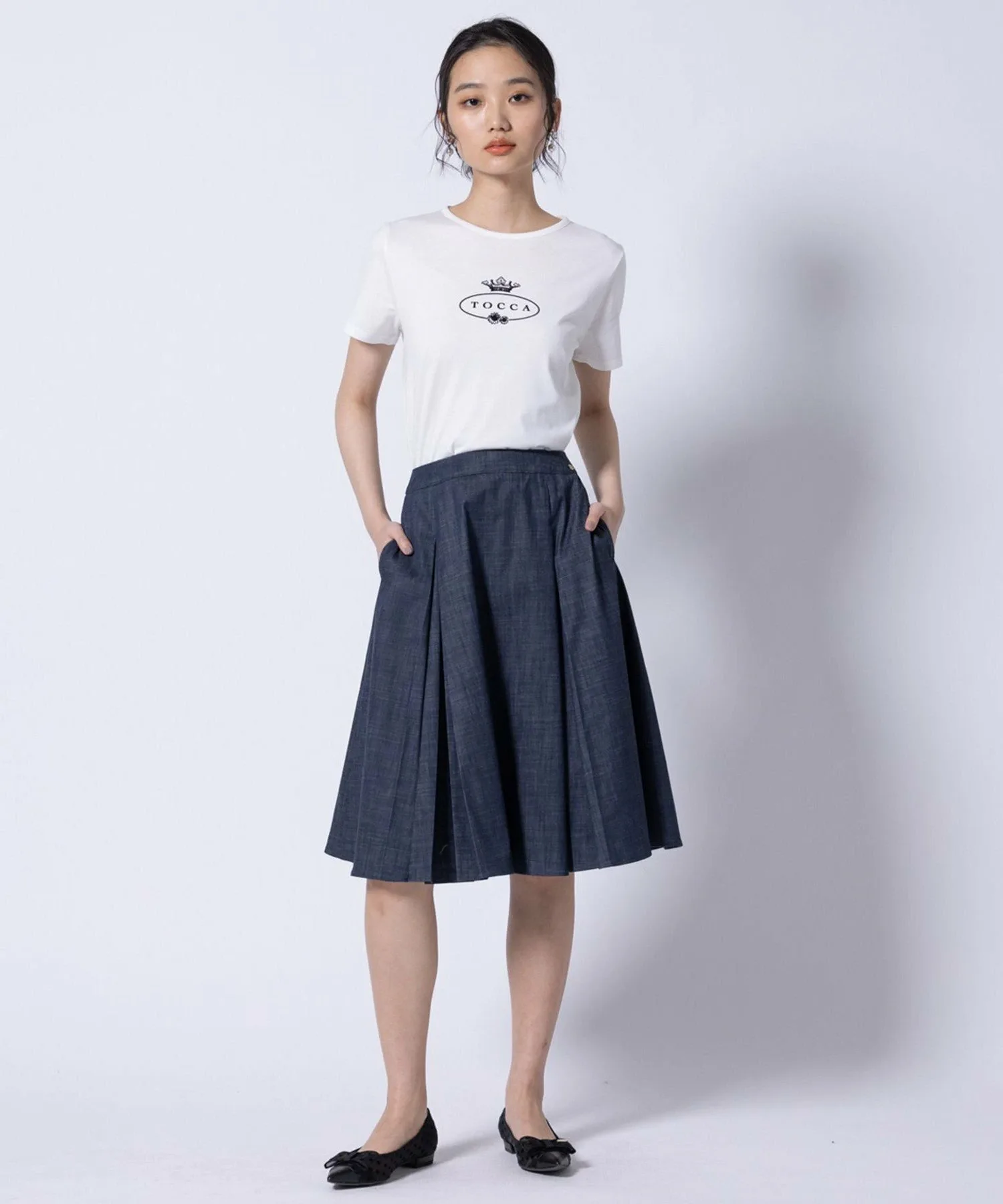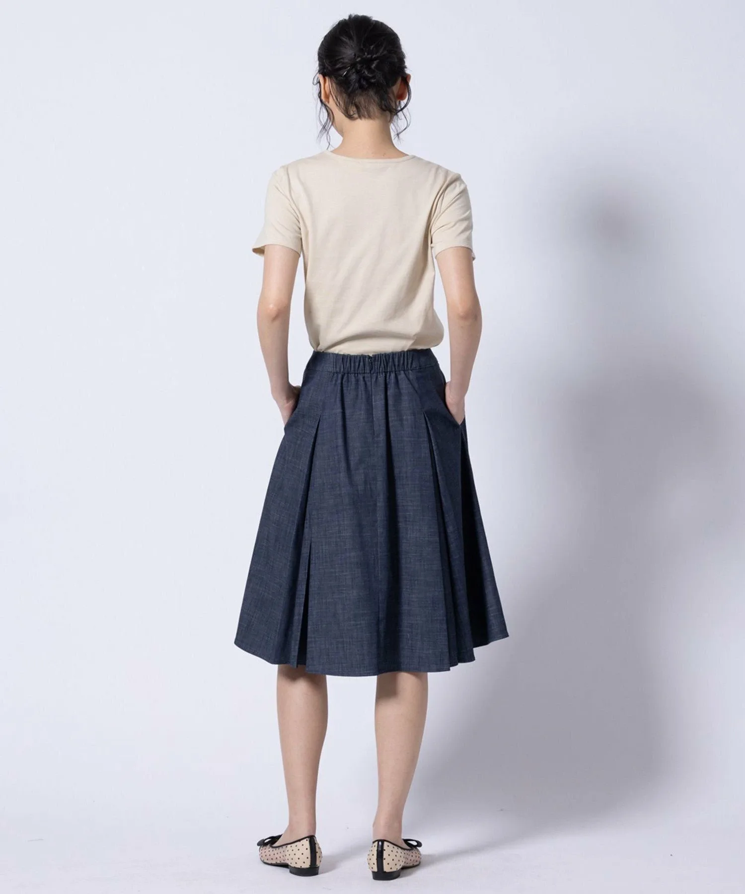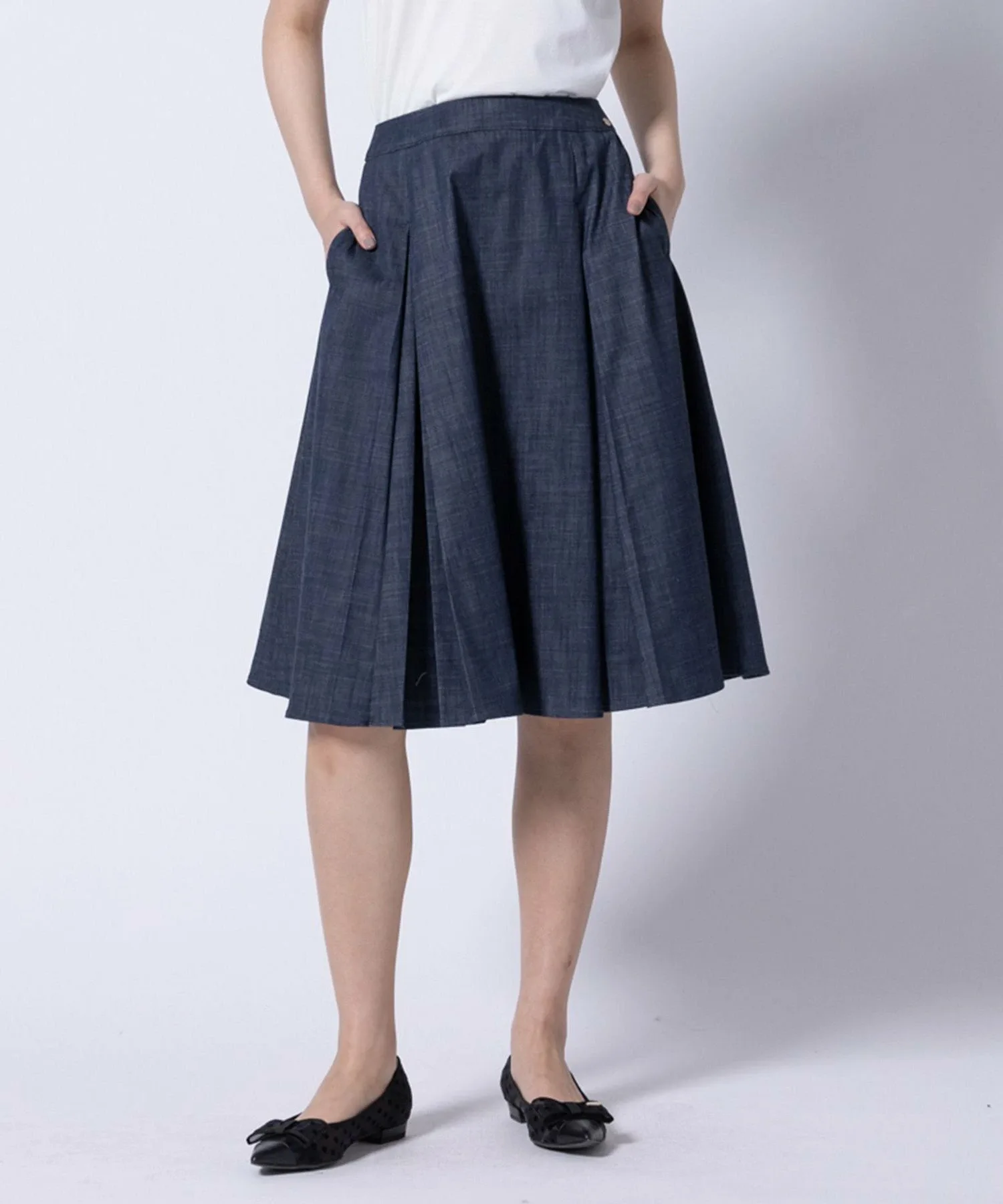 Эта юбка изготовлена из материала, имитирующего деним. Она легкая и не выцветает даже после стирки. Она имеет легкую, похожую на деним текстуру, но при этом выглядит аккуратно и опрятно, что делает ее идеальной для поездок на работу, школьных мероприятий и многого другого. Линия юбки четкая, но складки развеваются при ходьбе, добавляя мягкий, женственный и элегантный акцент.